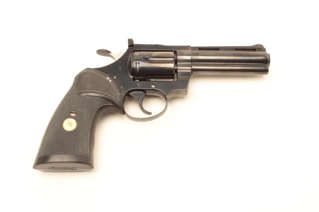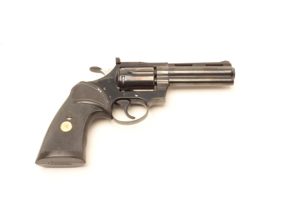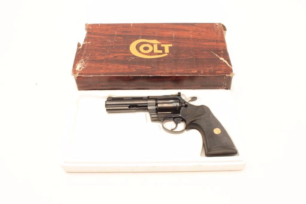 Colt Diamondback Model DA revolver, .22LR caliber, 4” ventilated rib barrel, blued finish, checkered Colt medallion hard rubber combat grips by Pachmayr, S/N S61406, in factory cardboard box with instructions. Therevolver is in overall excellent condition displaying approximately 99% original finish, fine bore, action, markings and grips. The box shows damage and end panel loss. (Modern/PPT). Est.: $1,250-$1,750.