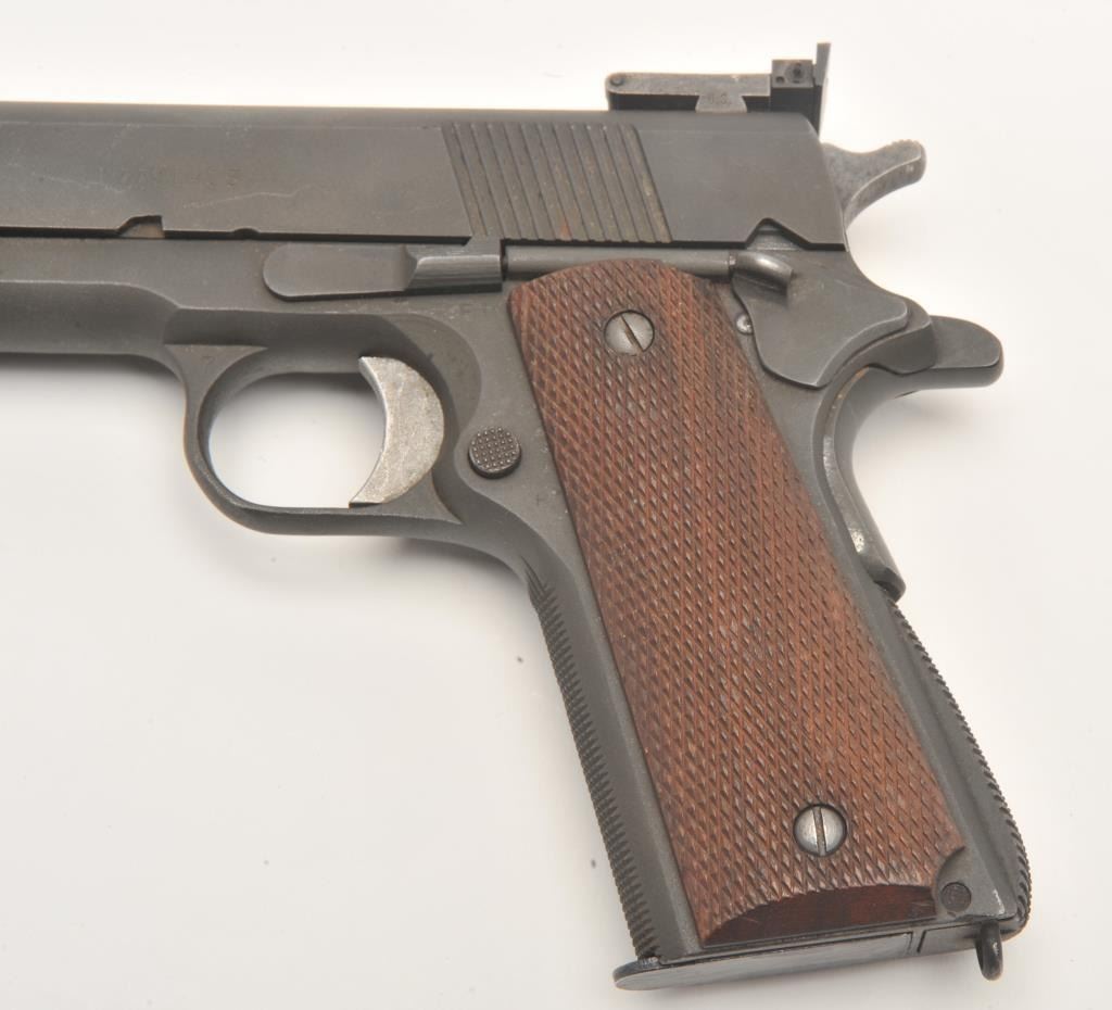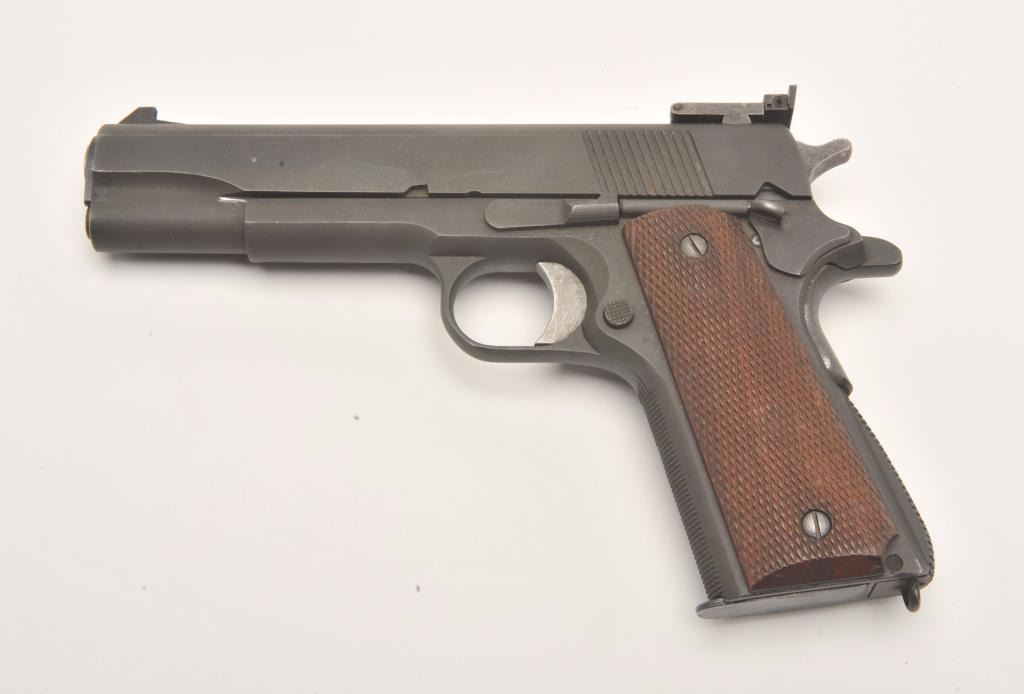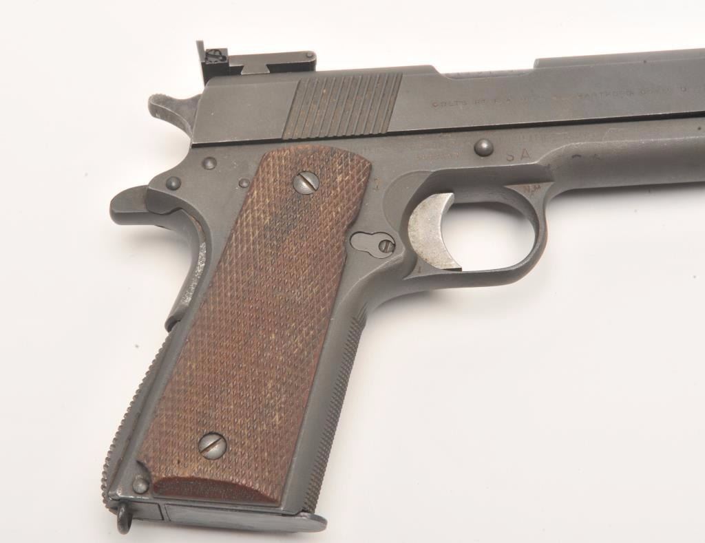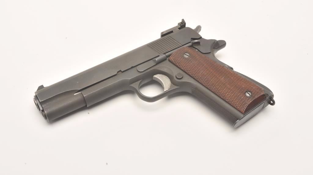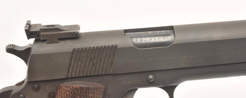 Colt Model 1911-A1 National Match semi-automatic pistol, .45 caliber, 5” barrel, parkerized finish, checkered wood grips, S/N 2139169 and stamped “NM” on front right side of trigger guard; additionally,the same number is stamped on top of barrel along with “NM 7791414”; the barrel bushing is stamped “7267718 NM” and the slide is stamped “NM7791435” on its left side. The gun is in overall very good to fineun-cleaned condition with a fine bore, crisp action, very good markings and fine grips. (Modern/PPT). Est.: $2,000-$4,000.