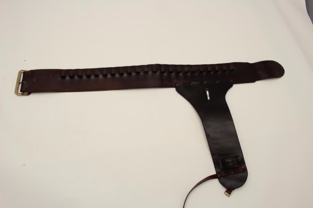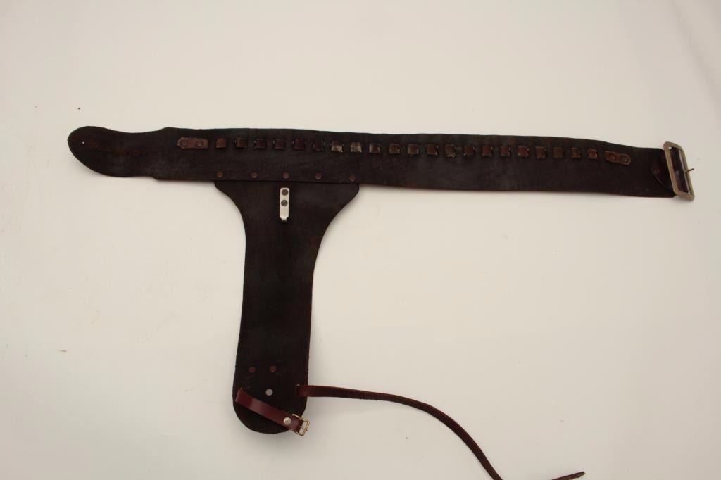 Replica of Steve McQueen’s “Mares Leg” carbine on 92 Winchester action with aluminum non-chambering (dummy) barrel, S/N 600821 with well simulated holster and belt like the one used by McQueen as Josh Randall in “TheBounty Hunter”. Little John’s sold the original used by McQueen in the early 1980’s to Jack Stovall of Spaghetti Station restaurant and western museum in Anaheim, CA. This is a very accurate reproduction made by Robert Lanthier of “Eagle Squadron” who made model aircrafts and boats and who produced models for movies, collectors and a letter from him tells of “Perfect” copy and limited production from original 92. Note: frame isregistrable. (Modern) Est.: $3500-$7000