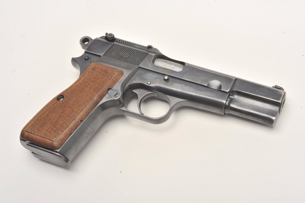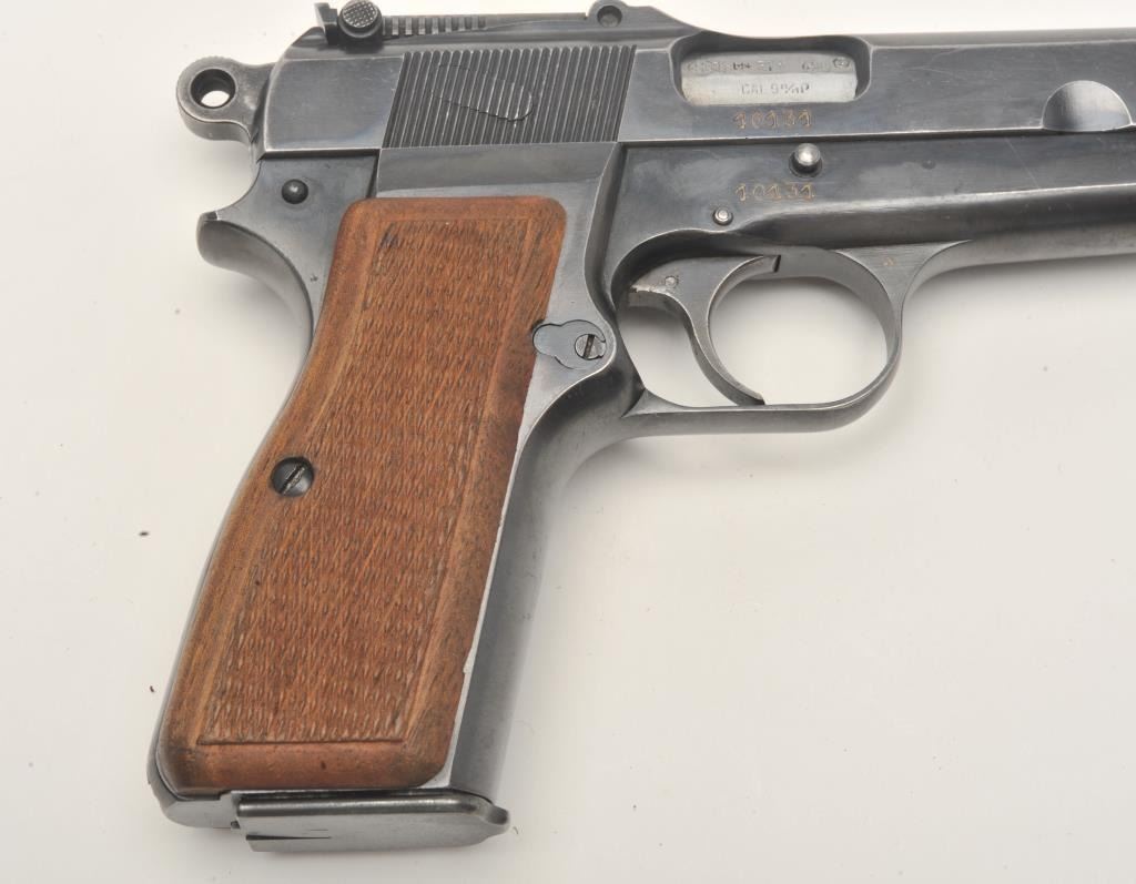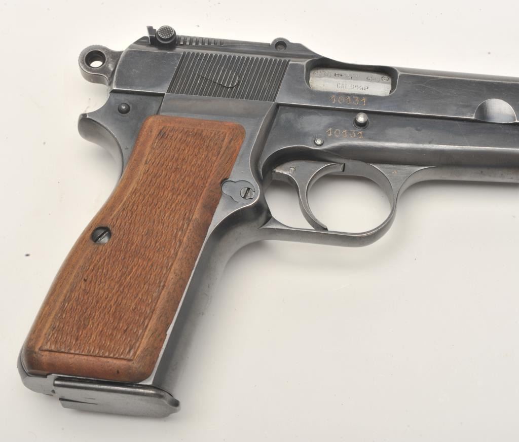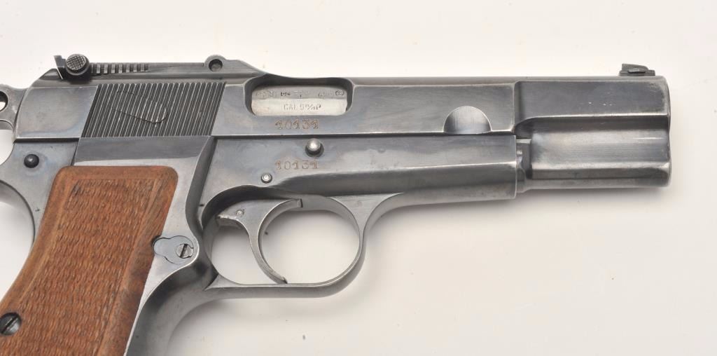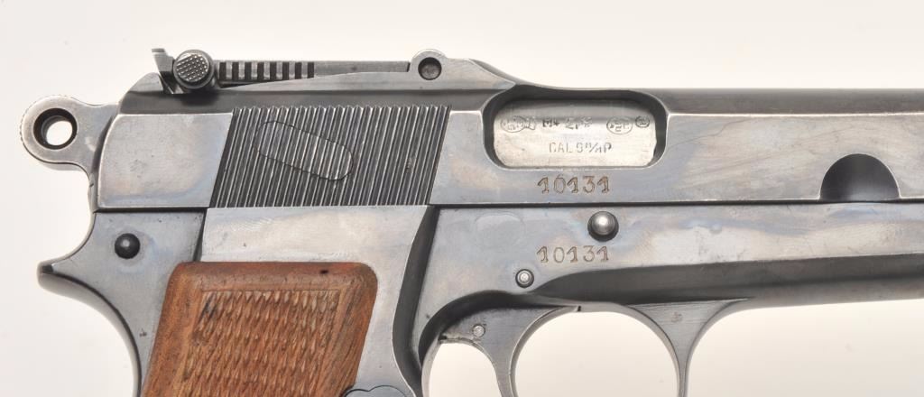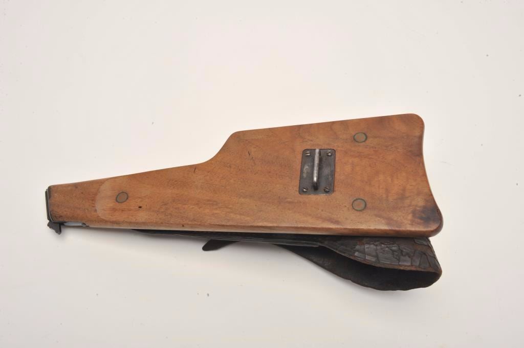 FN Browning Tangent sight Model semi-automatic pistol with combination wood stock/leather flap holster attachment, S/N 10131, in overall very good condition displaying majority of original blued finish, strong rifling in bore, sharp markings and proofs (no import marks visible), crisp action, good grips with an old small compression to checkering on mid-left grip; holster shows some crazing and flaking; woodstock is very good. (C&R/PPT). Est.: $1,750-$3,500+.
