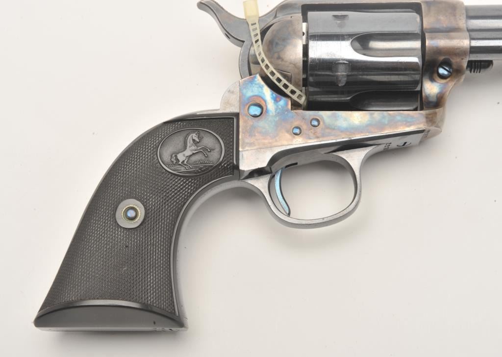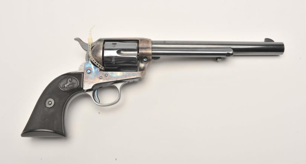 Colt First Generation SAA revolver, .32 W.C.F. caliber, 7.5” barrel, blued and case hardened finish, checkered hard rubber black grips, S/N 227808 (ca. 1902), in overall minty condition showing little use orhandling; approximately 99% original bright blue and vivid case colors. Hard to improve upon this one! (C&R/PPT). Est.: $5,000-$10,000.