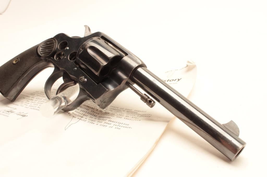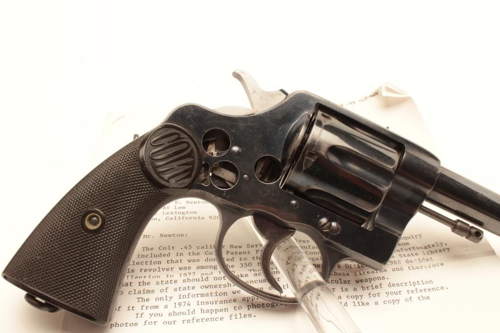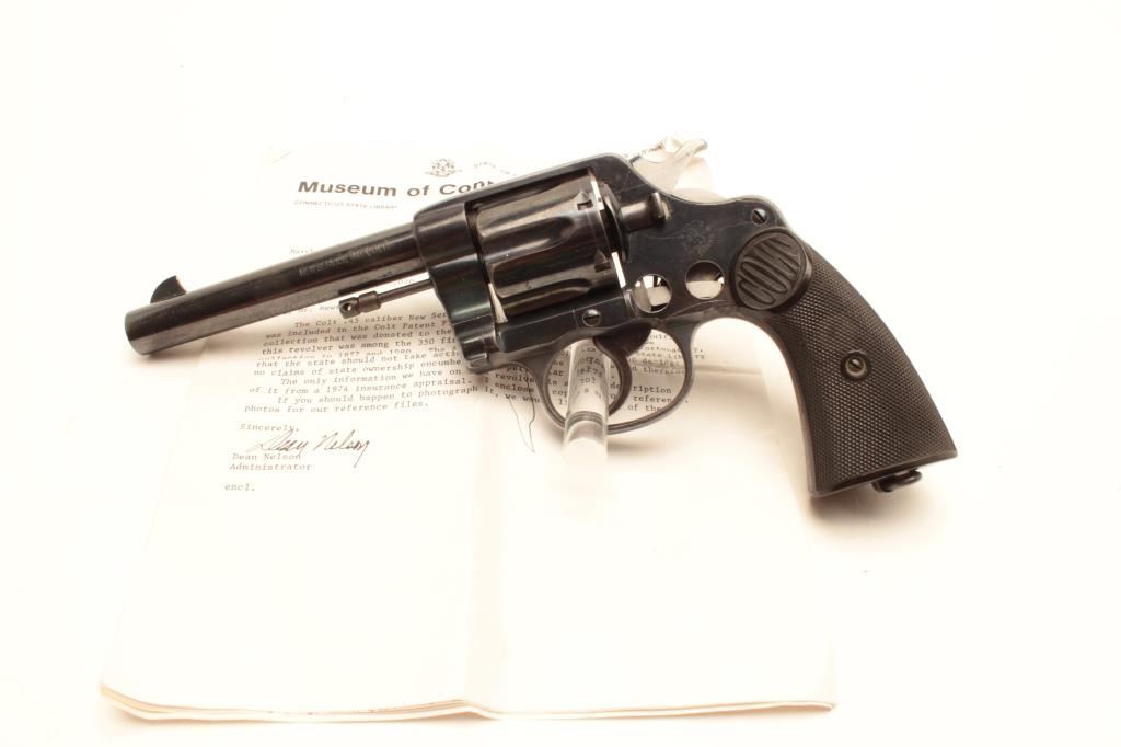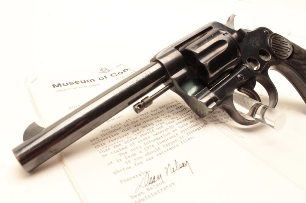Colt New Service Factory cut-away from the Colt Factory Collection. The pistol features a 5 ½” barrel, Serial #6614 and is chambered in, 45 Colt caliber. The pistol is in fine overall condition retaining approximately 90% of its original blue finish with Colt marked hard rubber grips which are also in fine condition. The revolver is cut-away on the left side of the frame in two large circular cut outs and on the right side with threelarge and one small cut outs. The cut outs allow inspection of the frame mechanism. The lot includes documentation that the pistol was once part of the Colt Company’s museum collection, where it was referred to as, “New Service Skeletonized (cutaway)”, later donated to the state of Connecticut in 1957. The pistol was later sold in the late 1970’s. The lot further includes a letter from R.L. Wilson who stated, “To summarize,#6614 is among the greatest of rarities in the field of Colt double action revolvers, has survived in an excellent state of preservation, has the all-important factory museum pedigree and documentation, is one of