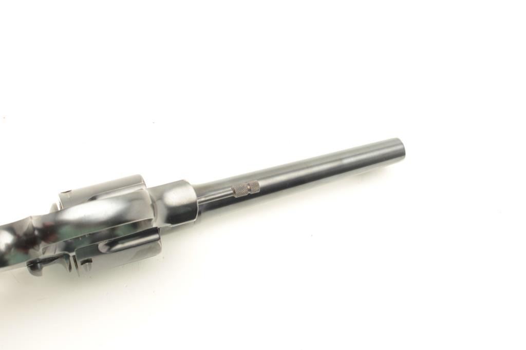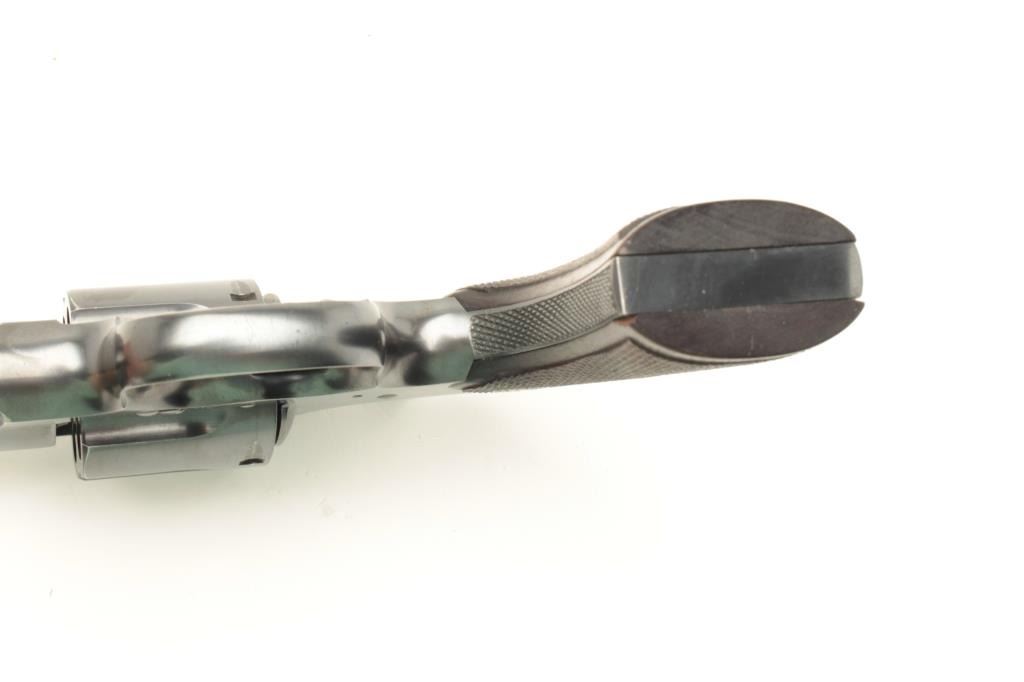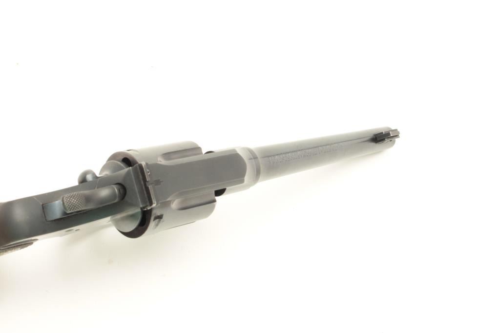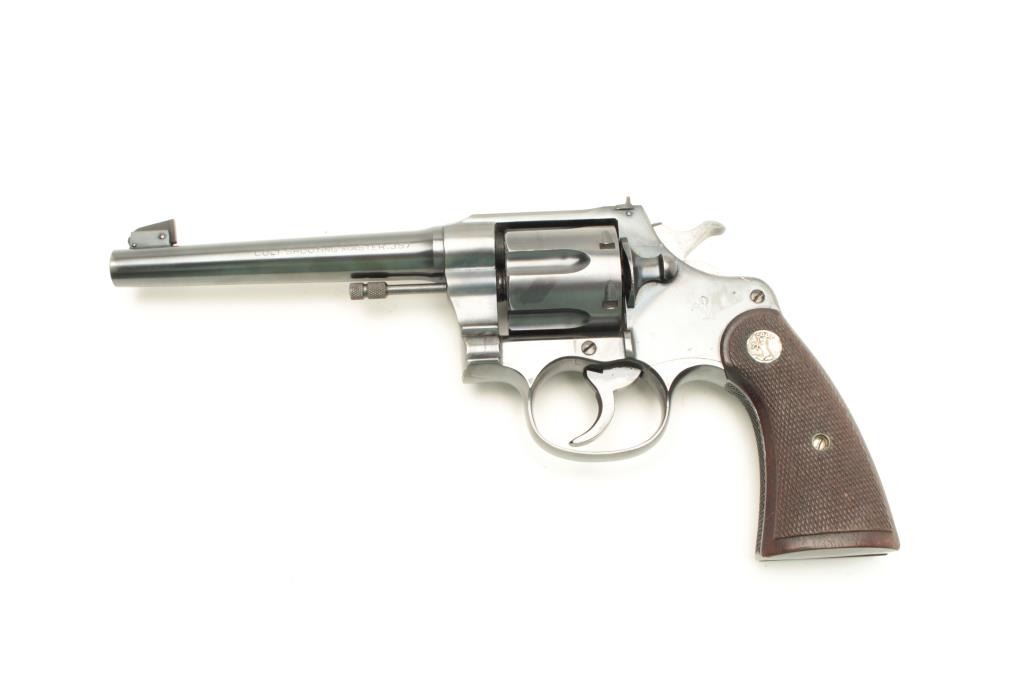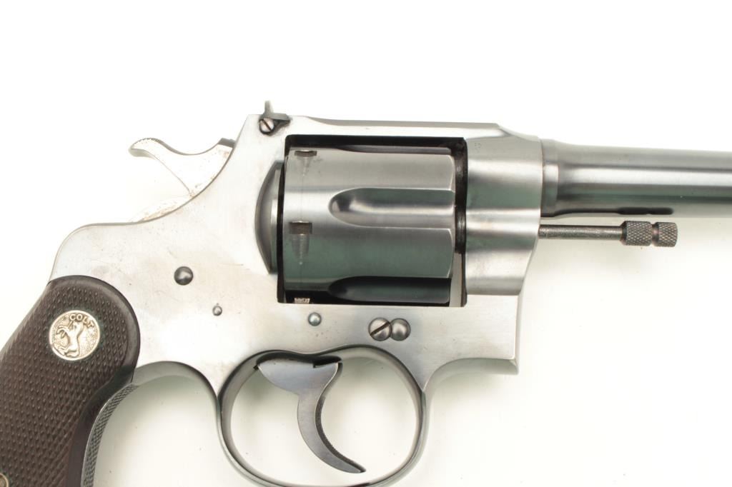 Colt Shooting Master Model revolver, .357 Magnum caliber, Serial #340853. The pistol is in fine to nearly excellent overall condition with a 6” barrel with a blade front sight. The pistol retains approximately 95% of its blued finish with light holster wear at the muzzle and the faintest of drag lines on the cylinder. The checkered wood silver medallion grips are in very good condition with sharp checkering and light mars fromstorage. The bore is very good, the action crisp and markings are sharp on this most acceptable Shooting Master. According to the records of the consignor, the pistol was assembled on February 24, 1922 and shipped to Pacific Gun Sight of San Francisco, California on March 6, 1939, after a year on the shelf. Est.: $1,500-$3,000. (C+R).