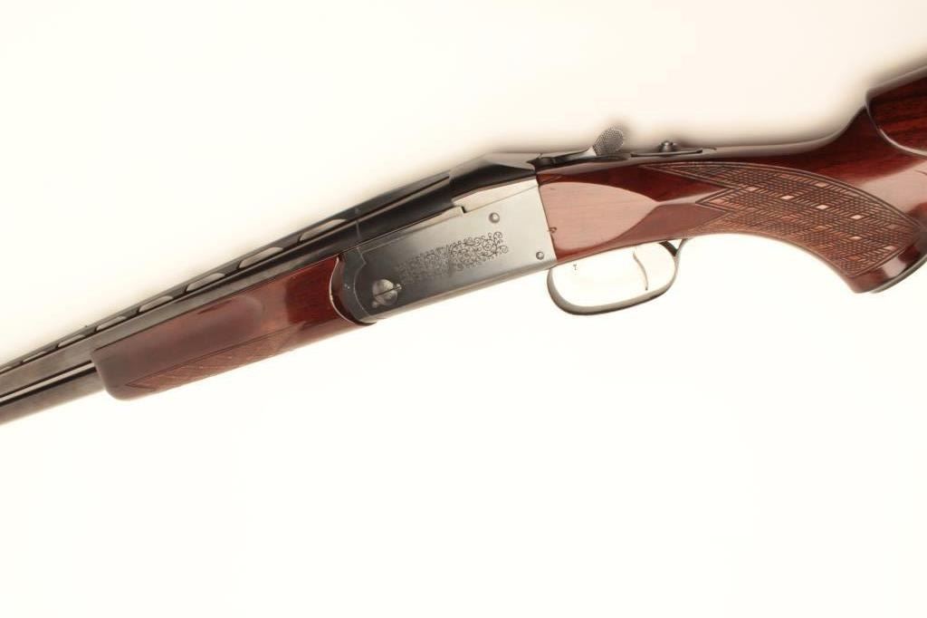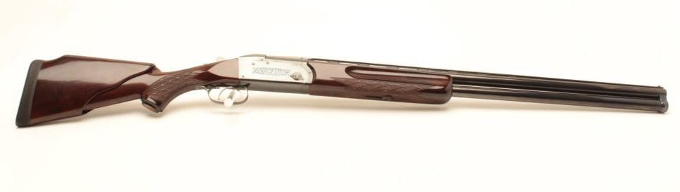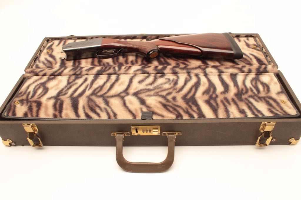 Kreighoff Model 32, four barrel set in 12, 20, 28 and .410 gauge with hydro coil and select burl wood stock in Gun-Ho carrying case, S/N 6644. The gun shows 4 matching number Kreighoff –marked barrels, all ofwhich are 28” in length and skeet choked; the condition is very good + to near fine, 90-95% original blue thinning on bottom of frame and edges. The stocks are also near fine with minor scratches and use. The hydro coil stock is pumped up and working properly; the case is good to very good; the stock measures 14.5” to the end of the thick rubber pad and is standard factory dimensions. Est.: $3,000-$6,000.