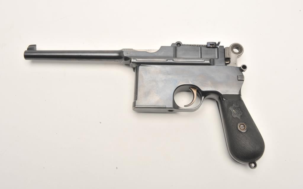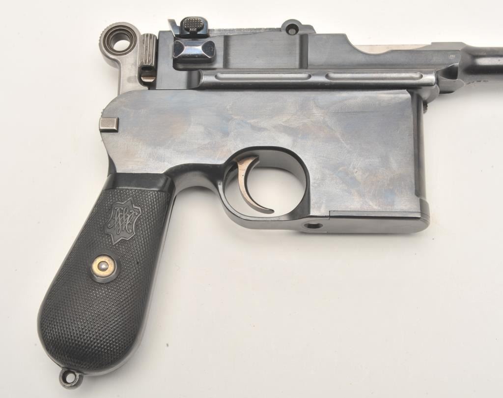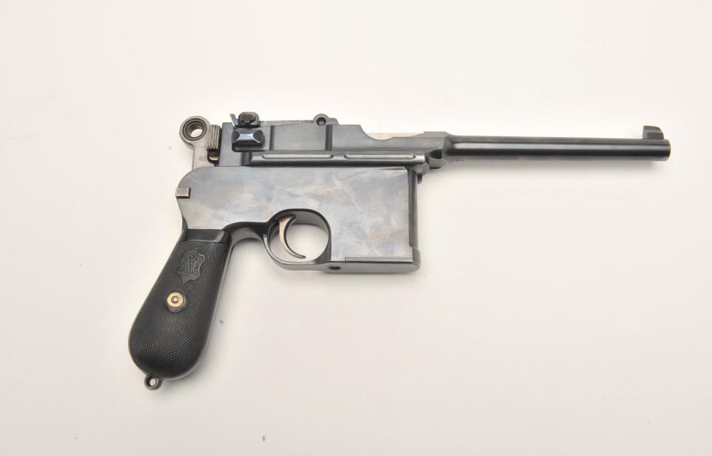 German Broomhandle Mauser semi-automatic pistol, with correct wooden stock/holster numbered to this gun (25706), .30 caliber, 5.5” barrel, blued finish, rare early production with gutta percha checkered blackgrips, S/N 25706 (all matching visible). This pistol is in overall fine condition displaying majority of its blued finish, fine bore, crisp action, sharp markings and fine grips. The matching stock is in overall verygood to near fine condition. (C&R/No PPT). Est.: $3,000-$6,000.