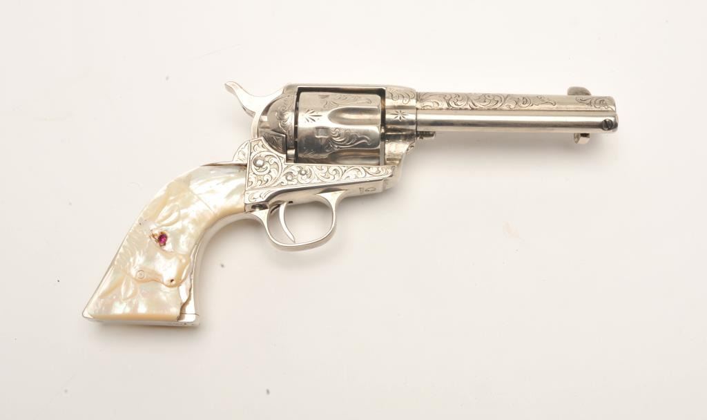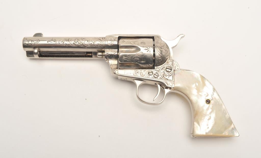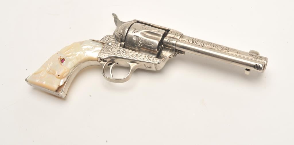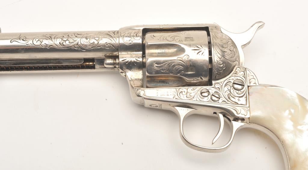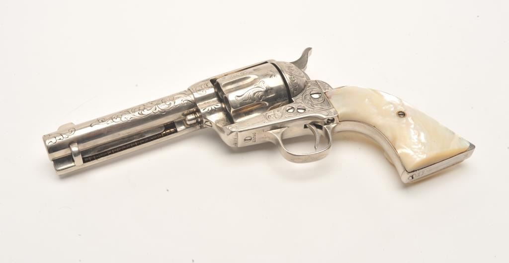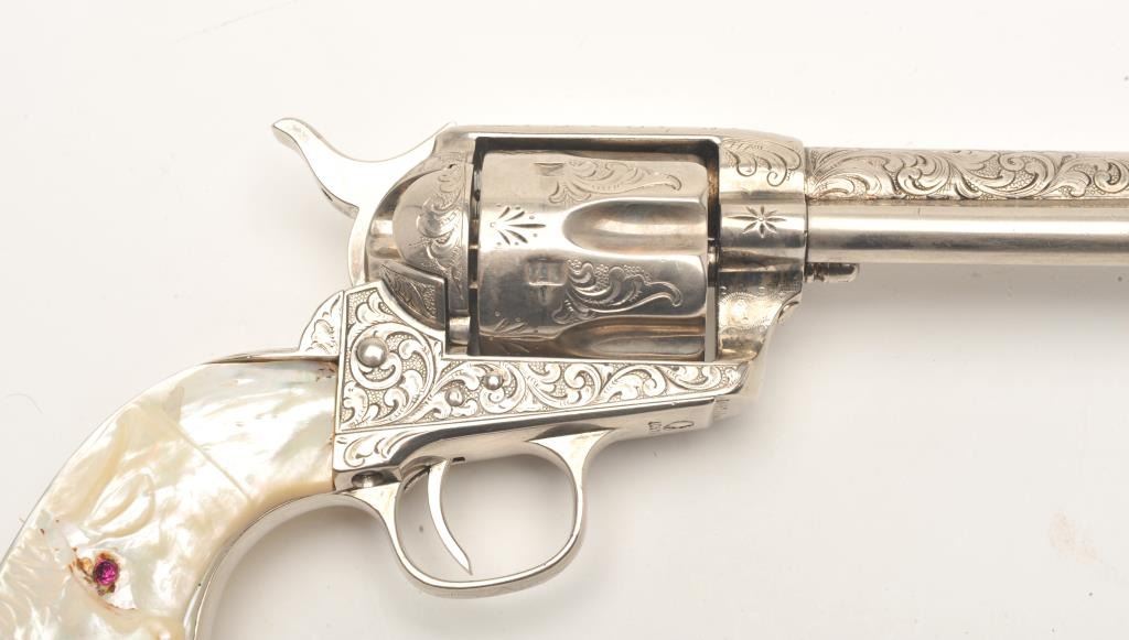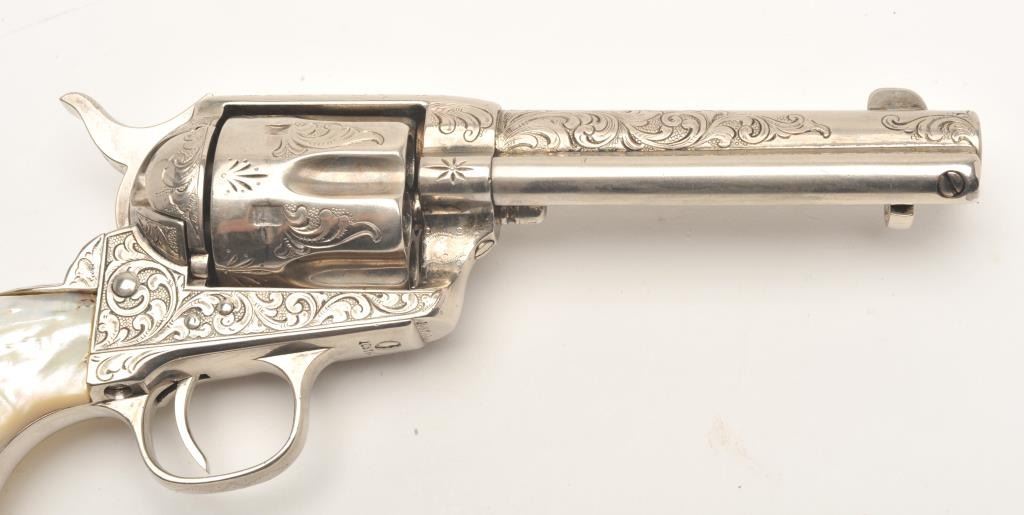 Colt SAA revolver, engraved, .45 caliber, 4.75” barrel, nickel finish, later raised carved pearl grips, S/N 105790, in overall very good condition as period engraved outside the factory; crisp action, goodmarkings, good bore, beautiful scroll engraving, lovely iridescent pearl grips with raised carving of a steer’s head on the right grip showing an old chip at the bottom front corner; also a marked “E” on the bottom of the backstrap. Accompanied by a factory letter confirming caliber and barrel length with finish noted as “Soft” and type of stocks “Rubber”; shipped to Hartley & Graham in New York City on January 15, 1884, 25 guns in shipment and under remarks noting the word “soft” indicates the frame and gate were not case hardened when shipped for engraving outside the factory. (Antique). Est.: $3,000-$6,000.
