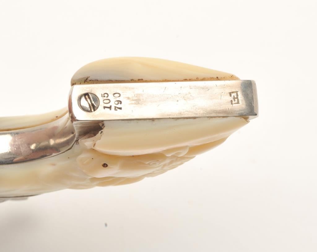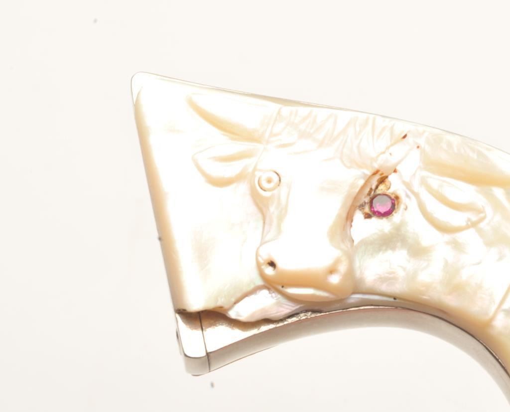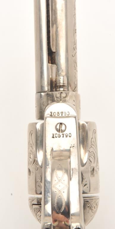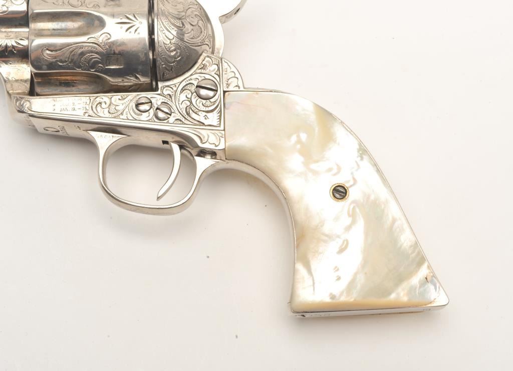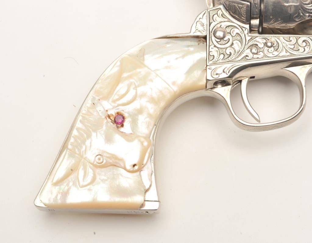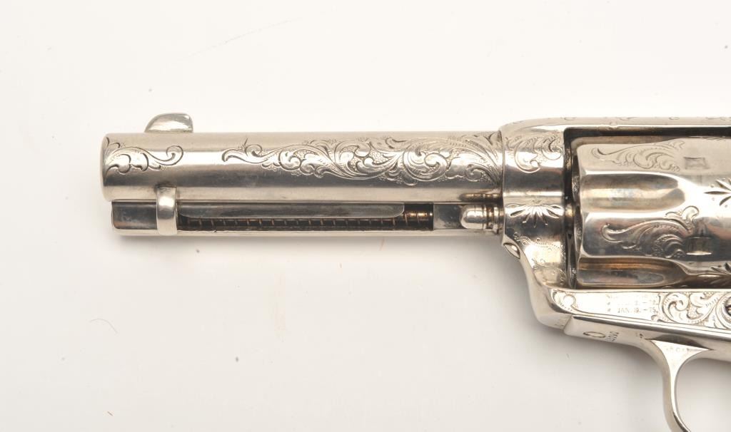 Colt SAA revolver, engraved, .45 caliber, 4.75” barrel, nickel finish, later raised carved pearl grips, S/N 105790, in overall very good condition as period engraved outside the factory; crisp action, goodmarkings, good bore, beautiful scroll engraving, lovely iridescent pearl grips with raised carving of a steer’s head on the right grip showing an old chip at the bottom front corner; also a marked “E” on the bottom of the backstrap. Accompanied by a factory letter confirming caliber and barrel length with finish noted as “Soft” and type of stocks “Rubber”; shipped to Hartley & Graham in New York City on January 15, 1884, 25 guns in shipment and under remarks noting the word “soft” indicates the frame and gate were not case hardened when shipped for engraving outside the factory. (Antique). Est.: $3,000-$6,000.