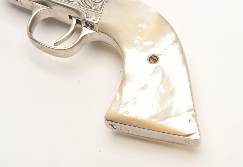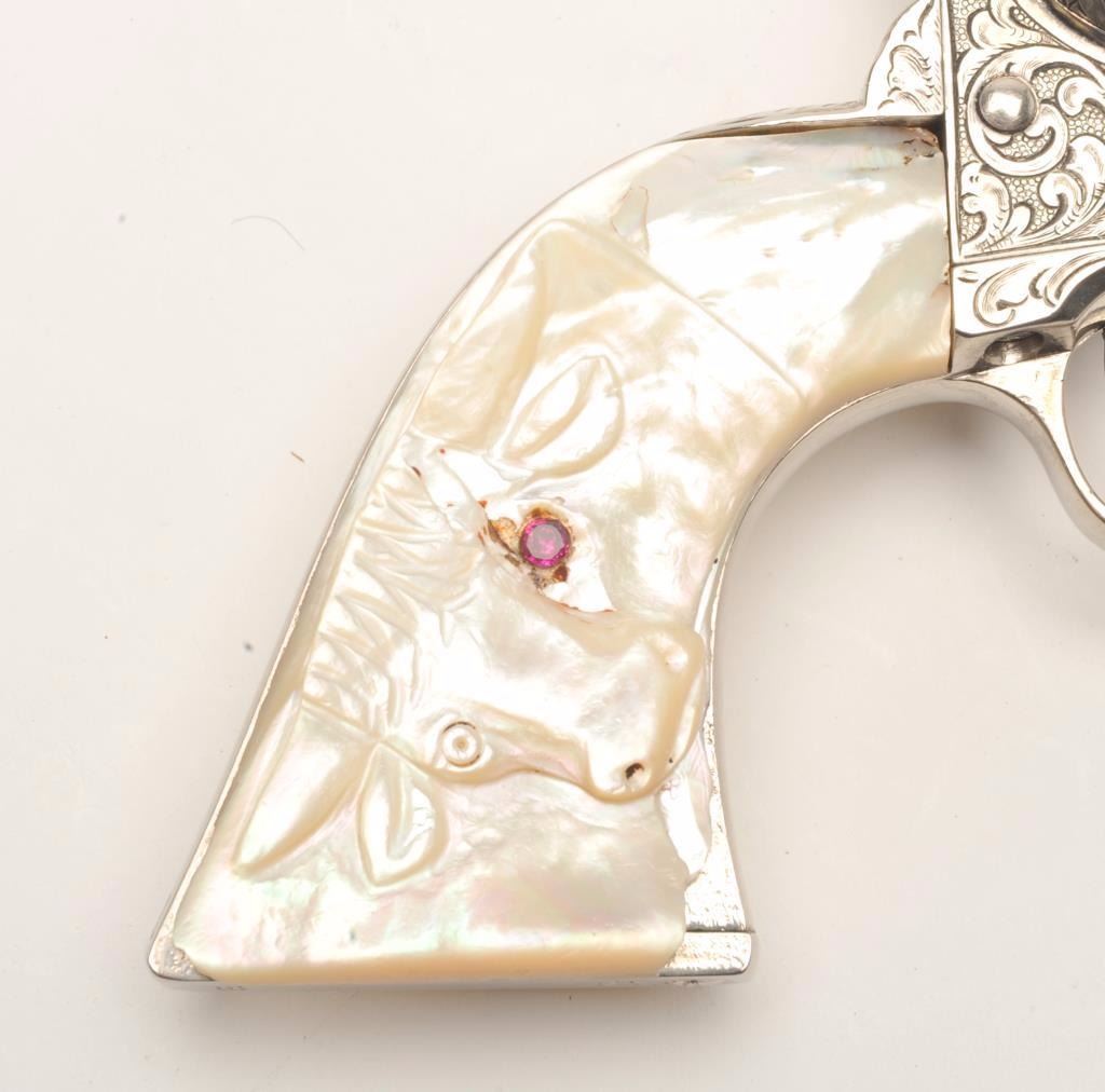 Lot 824 Colt SAA revolver, engraved, .45 caliber, 4.75” barrel, nickel finish, later raised carved pearl g