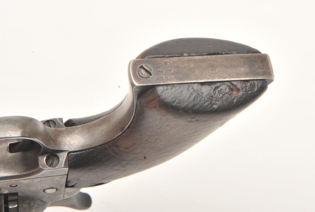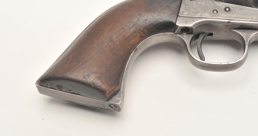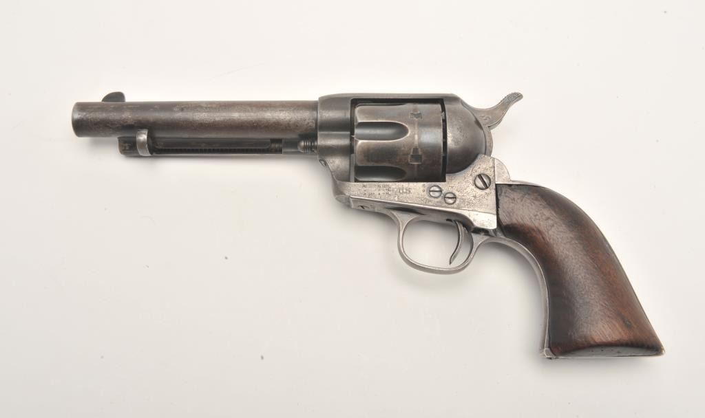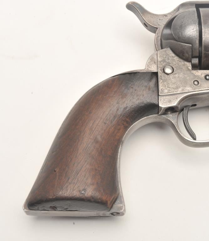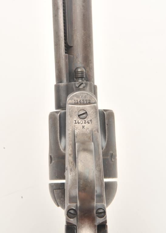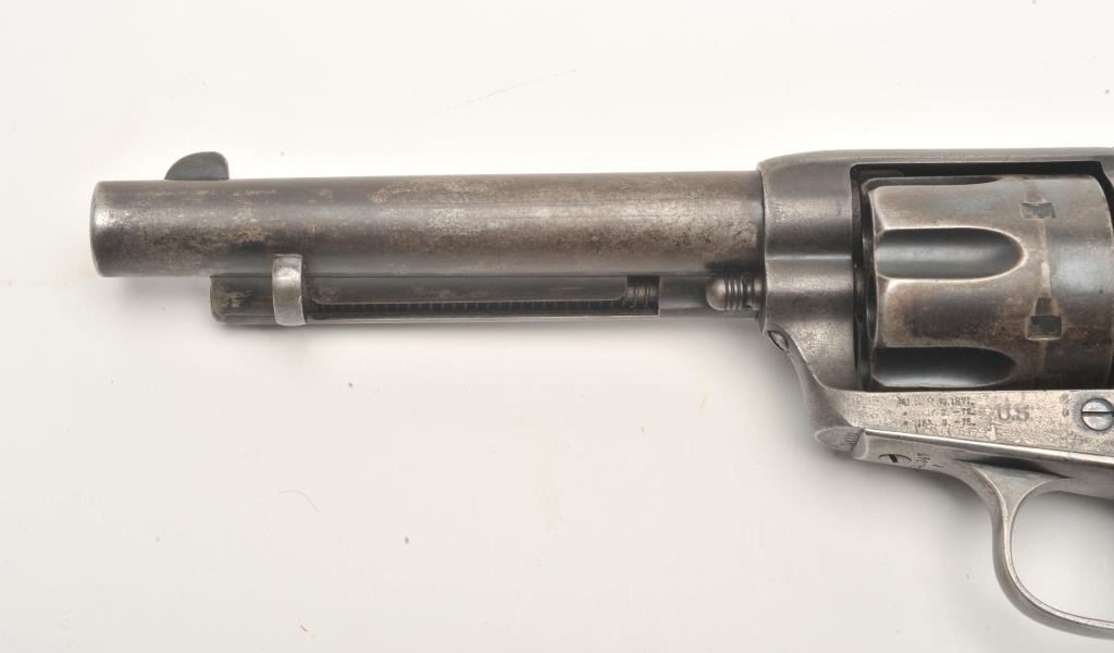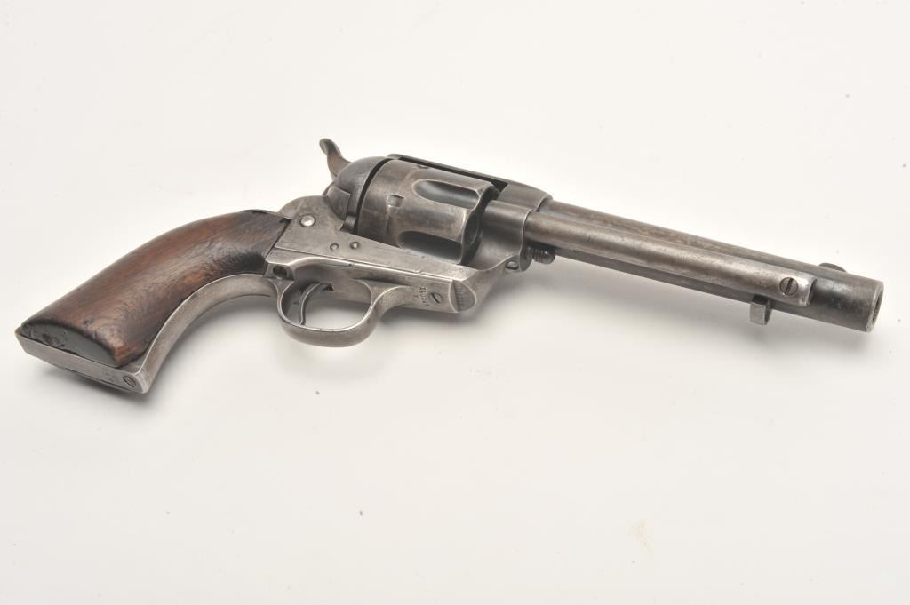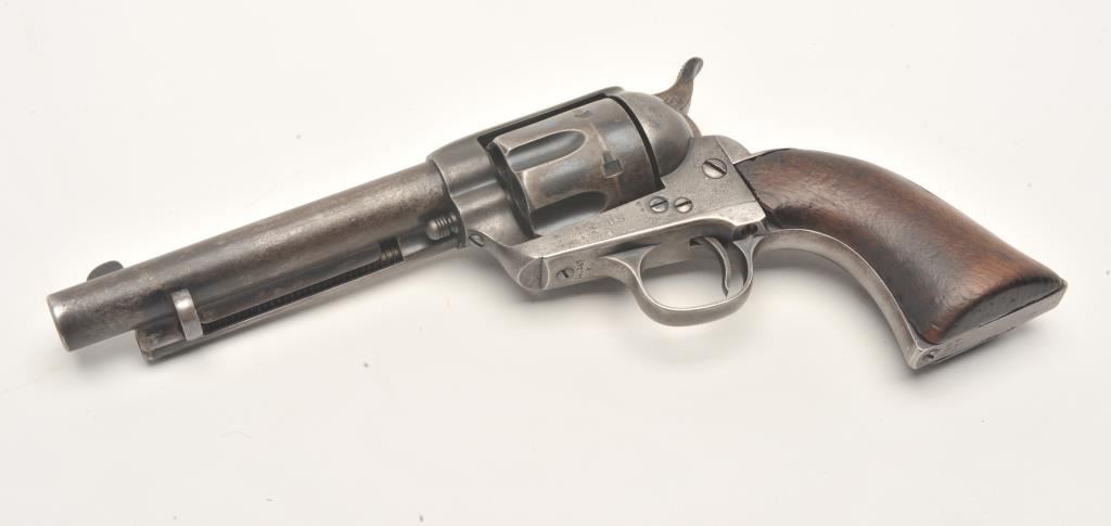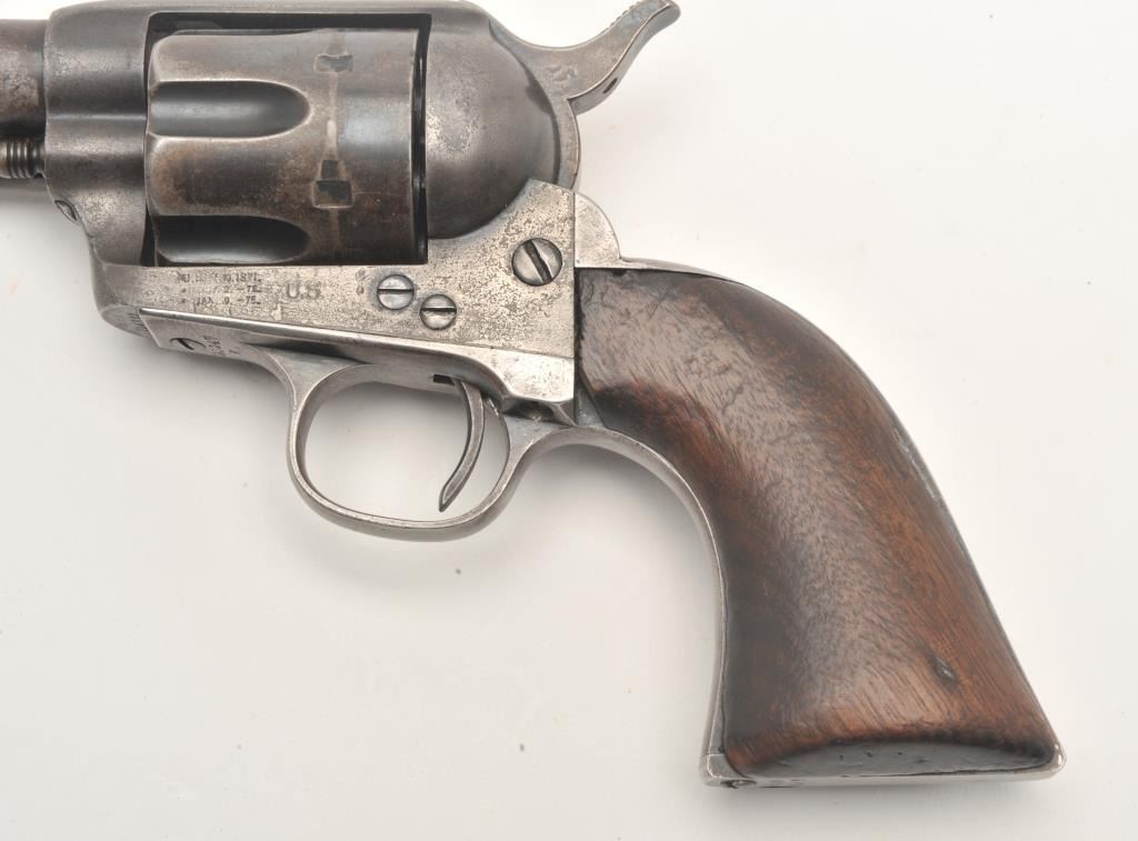 Colt U.S. Artillery Model SAA revolver, .45 caliber, 5.5” barrel, blued finish, smooth wood grips, S/N 114372 (frame number; 140247 trigger guard and backstrap), in overall good to very good condition displaying scatteredareas of original finish on cylinder, trigger guard and ejector housing, crisp action, good markings and good bore; grips are good overall with no visible inspector cartouches. Accompanied by a Colt factory letterindicating sale to U.S. Government Inspector at the Colt plant on January 21, 1885, one hundred guns in order. (Antique). Est.: $2,500-$5,000.