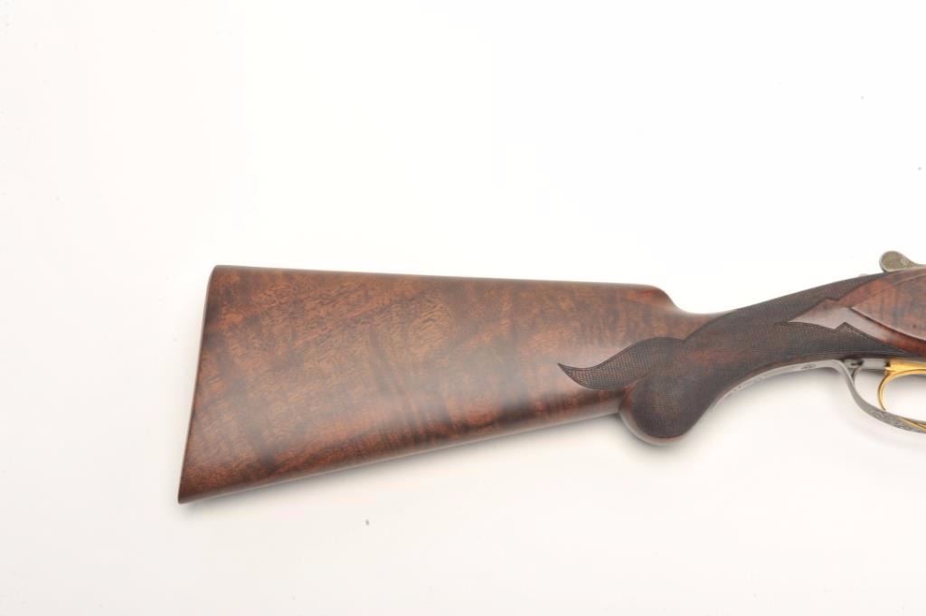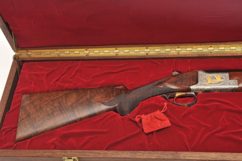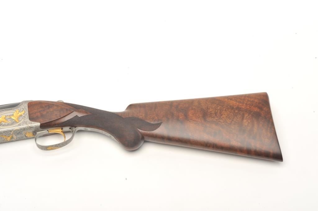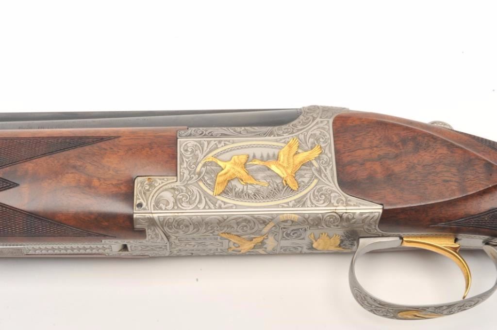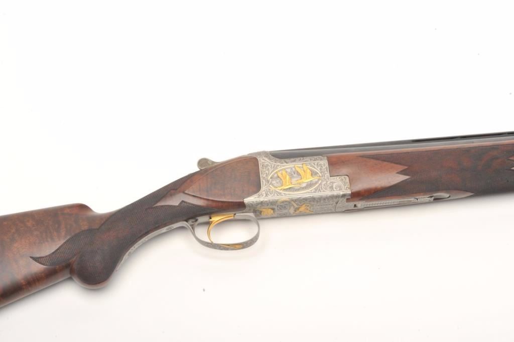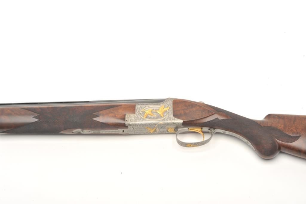 Browning Superposed High Grade American Pintail Model O/U shotgun, 12 gauge, serial #8H4PZ00086. This shotgun, along with the next two lots comprises three matched examples of the Browning Waterfowl Superposed Series. According to the consignor, only 13 Waterfowl sets with matching serial numbers were produced. This high grade, Belgian made Browning is as new in the box with 28” barrels featuring afull-lengthventilated rib and ivory bead front sight. The upper barrel is modified choke while the lower is full choke. The shotgun barrels retain nearly all of their blued finish. The coin finished, reliefengraved receiver isfinished in the white with gold inlayed game scenes on both sides depicting Pintails. The underside of the action is marked 086 of 500 in gold, indicating the limited production of theseries. The shotgun comes in theoriginal box with all associated paperwork and manuals. The finely checkered wood stocks are in excellent condition with beautiful, oil finished American Walnut burl and a Note+++1st in a 3 part series, 2nd is lot 825b, 3rd is lot 1135