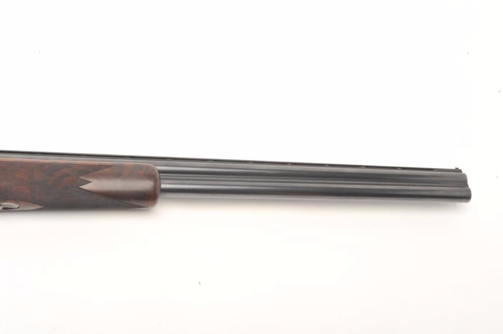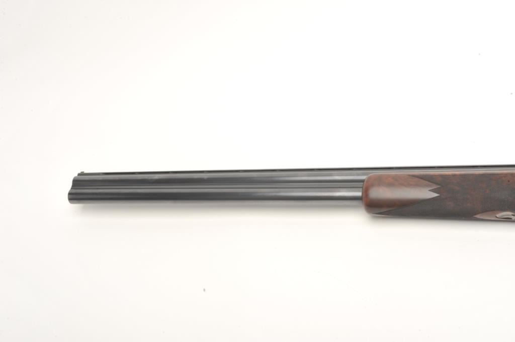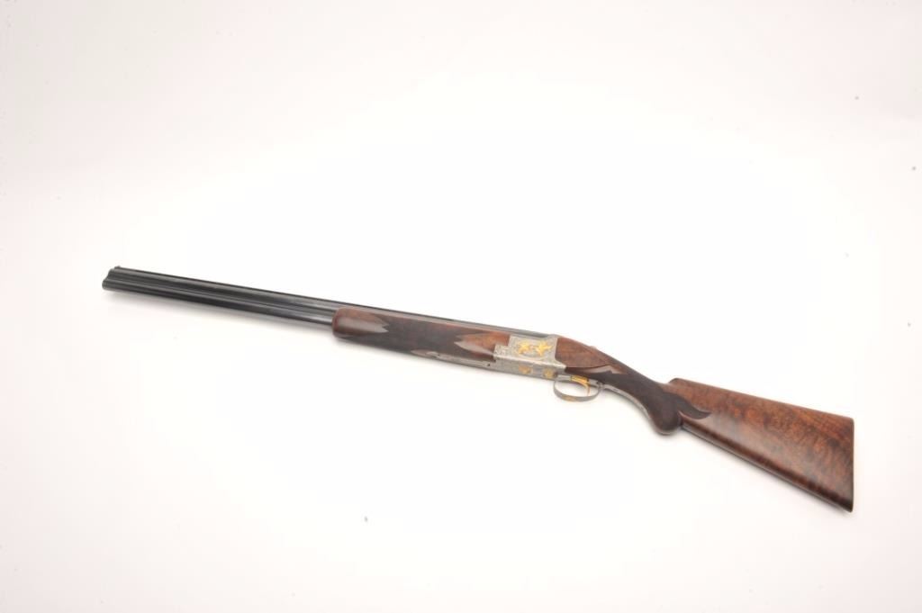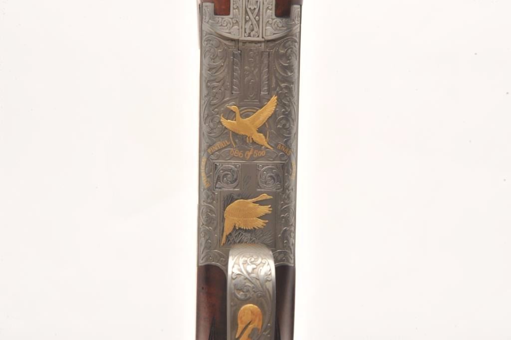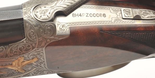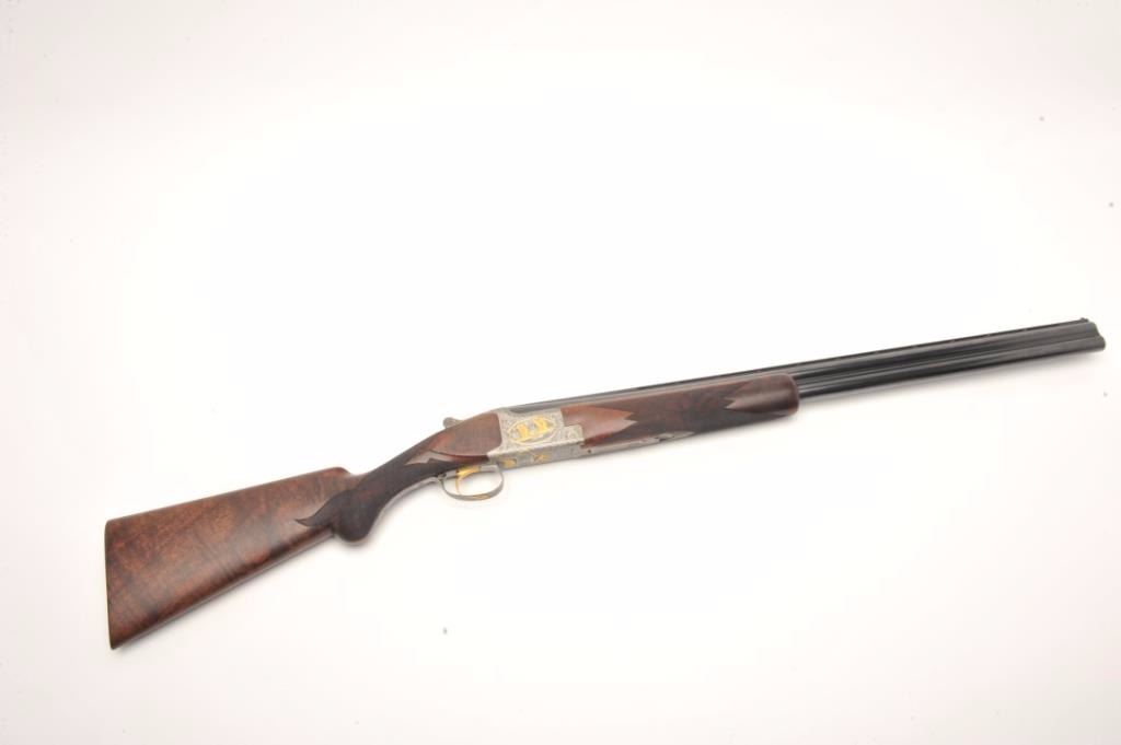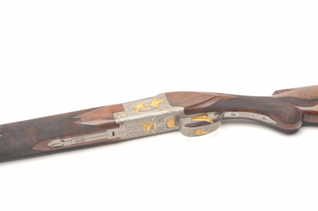 Browning Superposed High Grade American Pintail Model O/U shotgun, 12 gauge, serial #8H4PZ00086. This shotgun, along with the next two lots comprises three matched examples of the Browning Waterfowl Superposed Series. According to the consignor, only 13 Waterfowl sets with matching serial numbers were produced. This high grade, Belgian made Browning is as new in the box with 28” barrels featuring afull-lengthventilated rib and ivory bead front sight. The upper barrel is modified choke while the lower is full choke. The shotgun barrels retain nearly all of their blued finish. The coin finished, reliefengraved receiver isfinished in the white with gold inlayed game scenes on both sides depicting Pintails. The underside of the action is marked 086 of 500 in gold, indicating the limited production of theseries. The shotgun comes in theoriginal box with all associated paperwork and manuals. The finely checkered wood stocks are in excellent condition with beautiful, oil finished American Walnut burl and a Note+++1st in a 3 part series, 2nd is lot 825b, 3rd is lot 1135