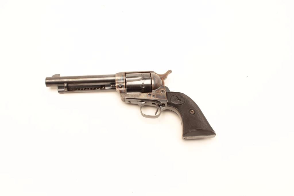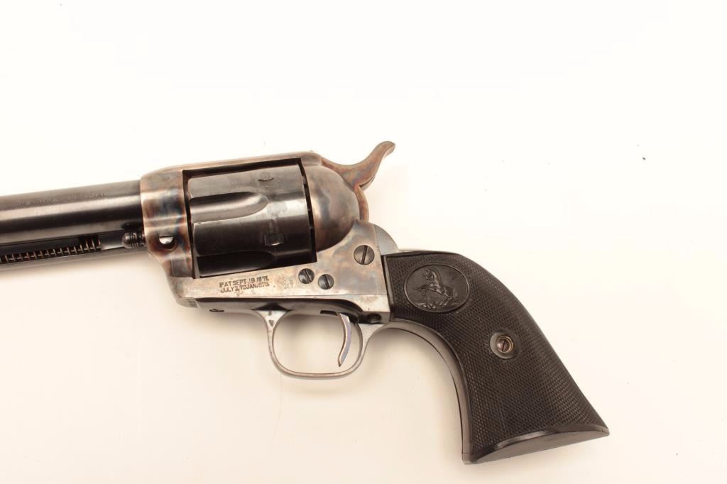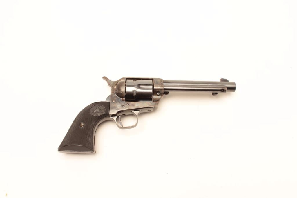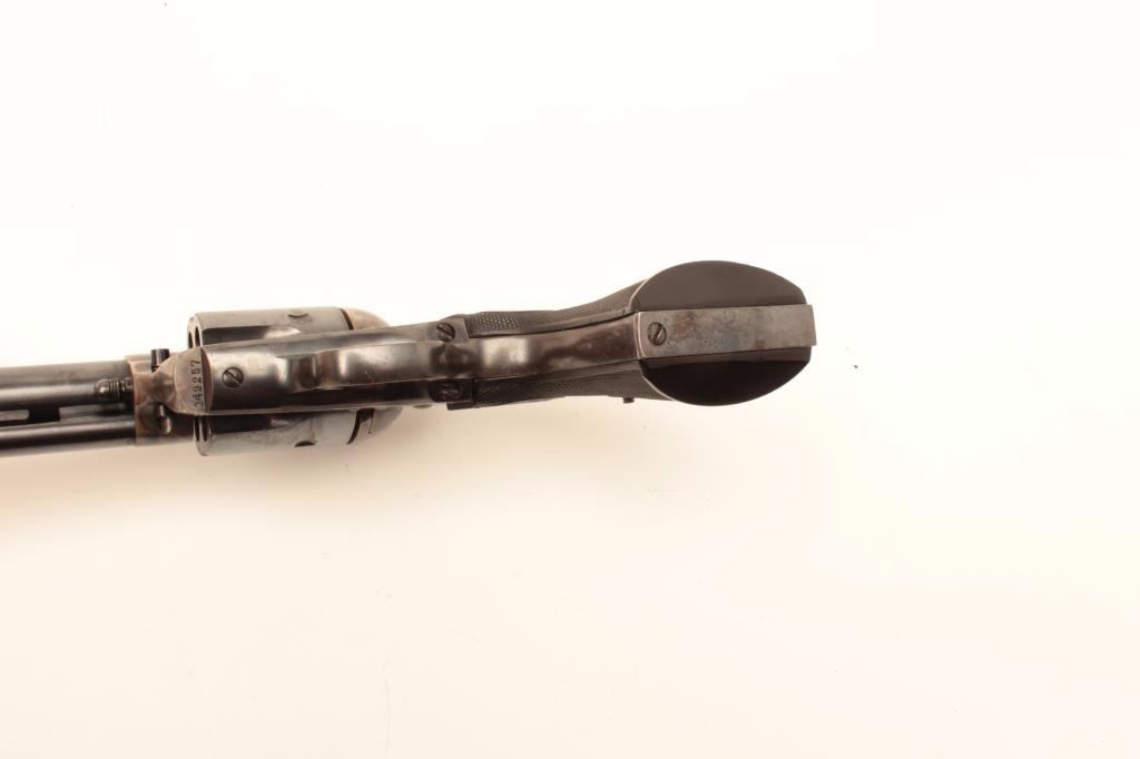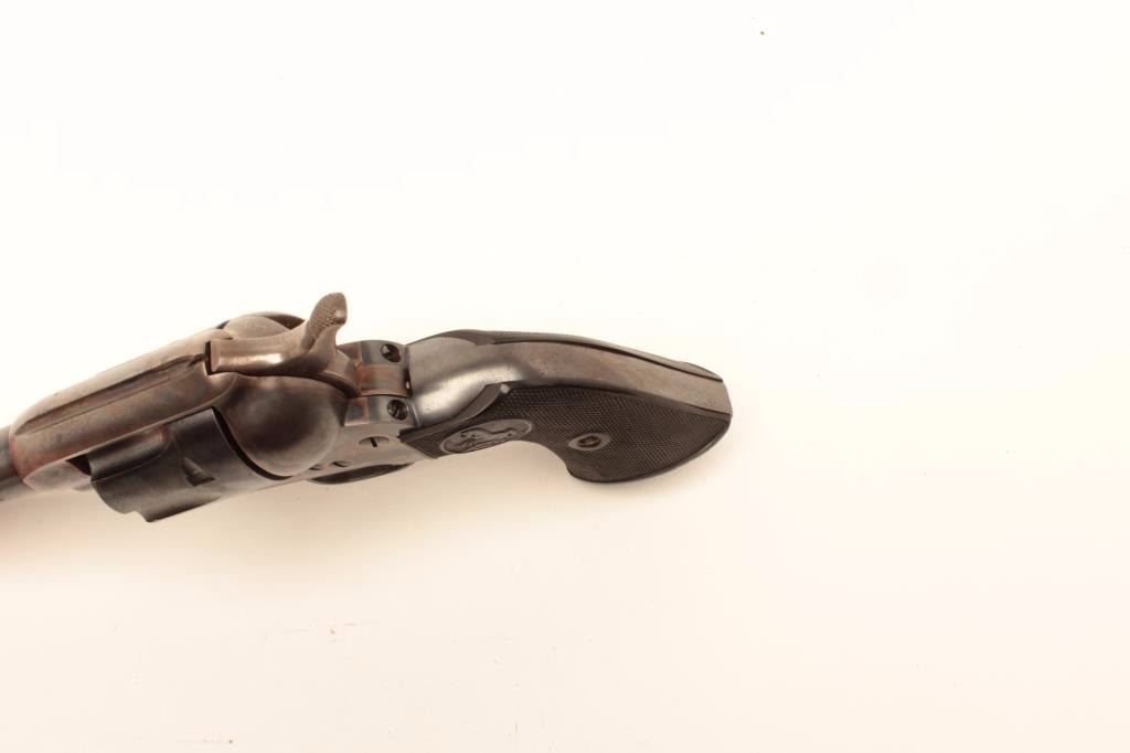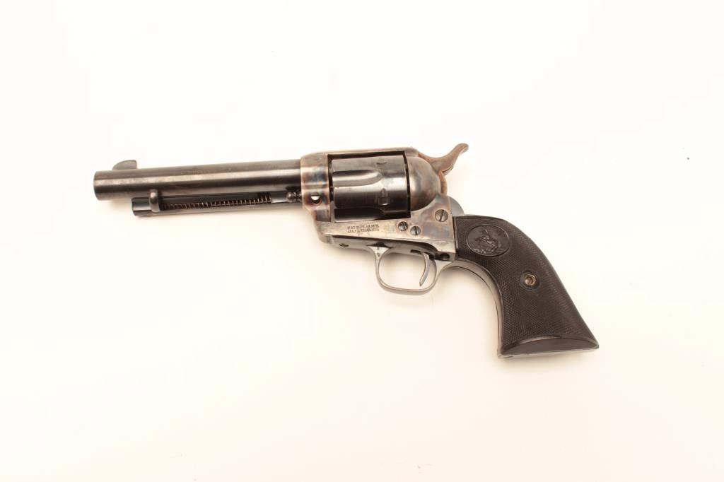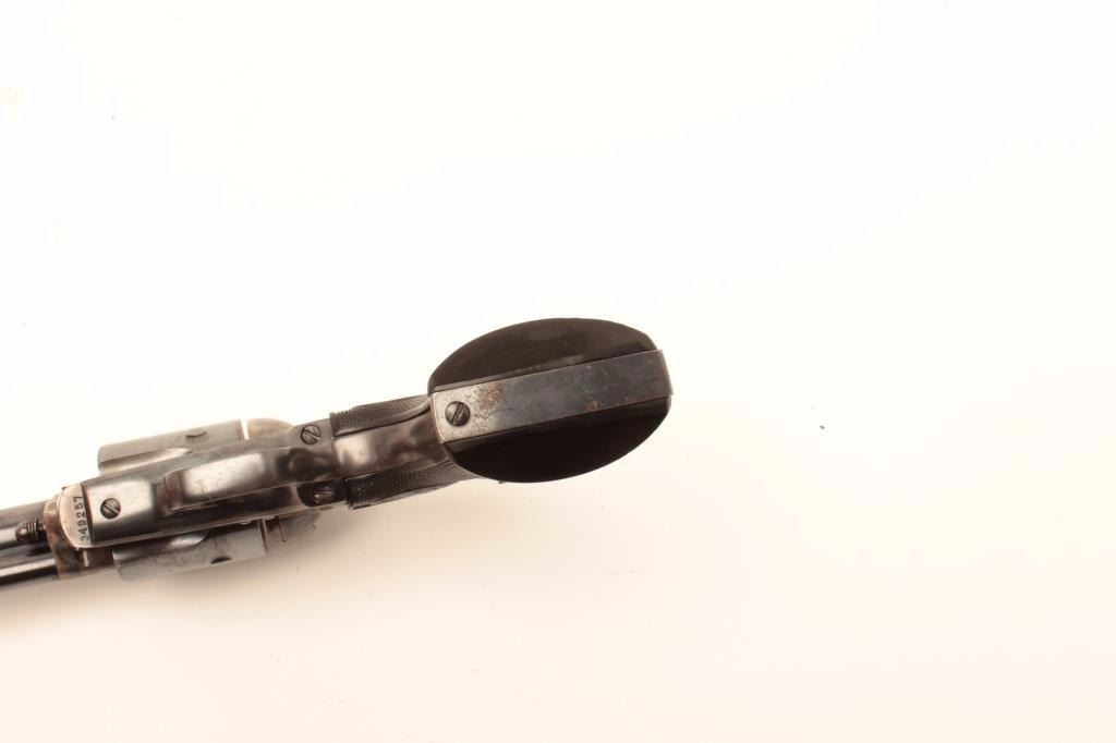 Colt SAA revolver, .38 Special caliber, 5.5” barrel, blued and case hardened finish, checkered black hard rubber grips, S/N 349257, in overall excellent condition displaying approximately 98%+ original finish including vivid case colors to frame and hammer; excellent bore, crisp action, sharp markings and excellent grips. A great 1st Generation SAA. (C&R). Est.: $2,500-$5,000.