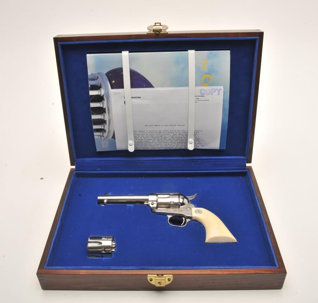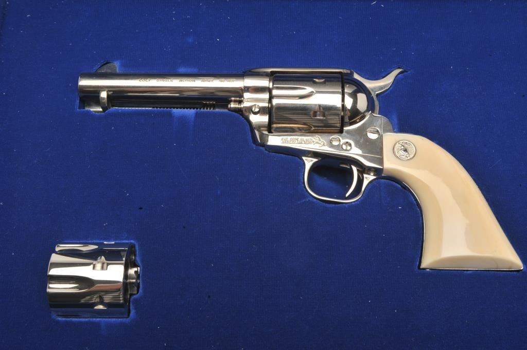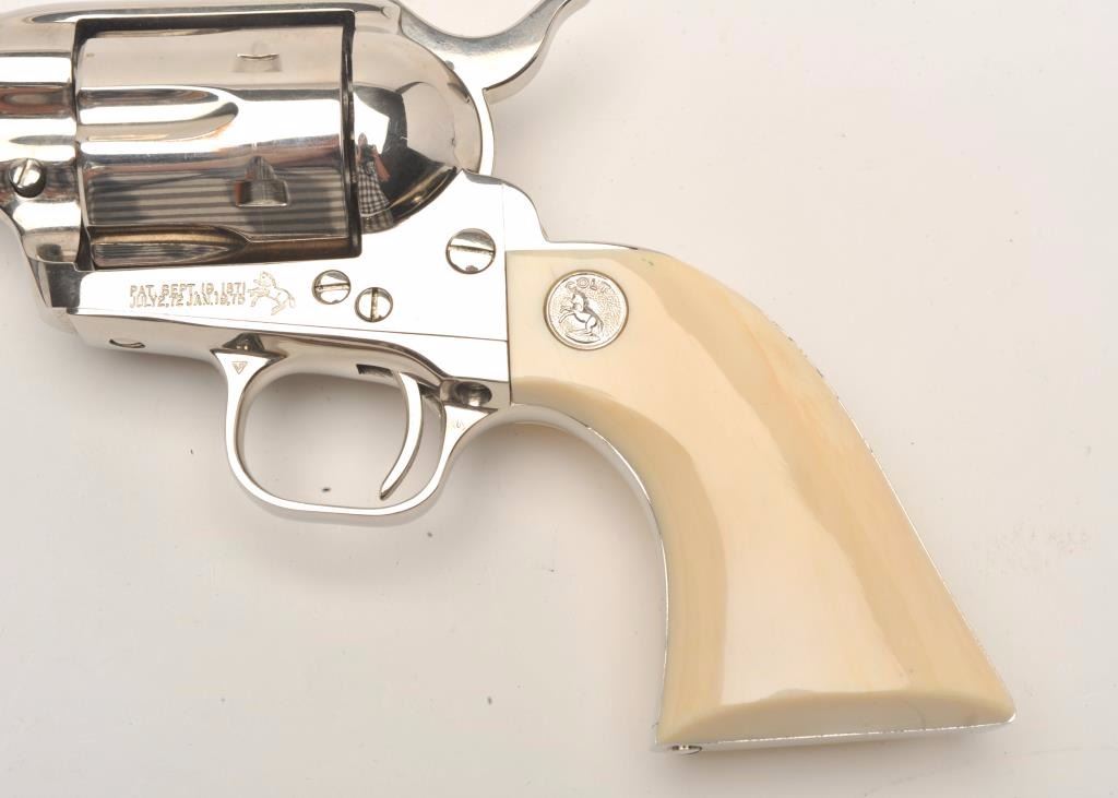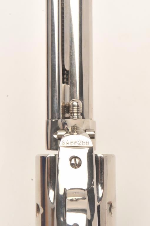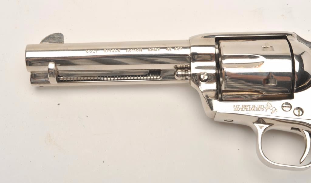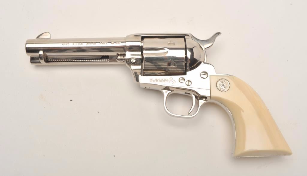 Colt 3rd Generation SAA Armoury Model revolver, .45 ACP caliber, 4.75” barrel, factory nickel finish, no grips, S/N SA66288, in like new condition. At time of description, grips missing as noted however,estate indicates they may be able to locate the grips, a case and an extra cylinder by time of auction. (Modern). Est.: $2,000-$4,000.