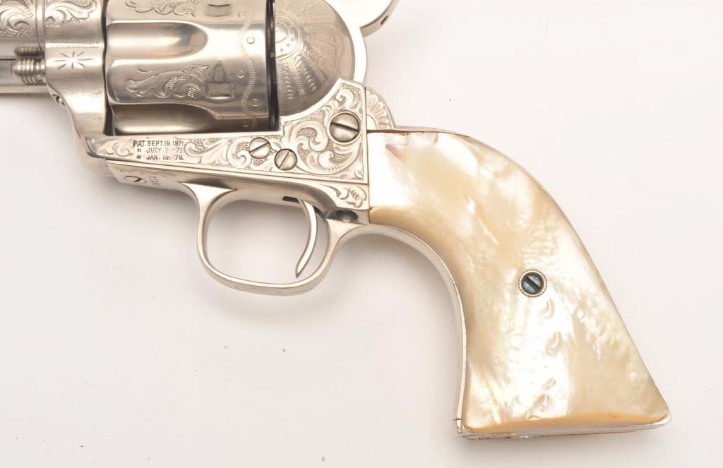 Lot 829 Engraved Colt SAA revolver, .45 caliber, 4.75” barrel, old re-nickel finish, two-piece pearl grips
