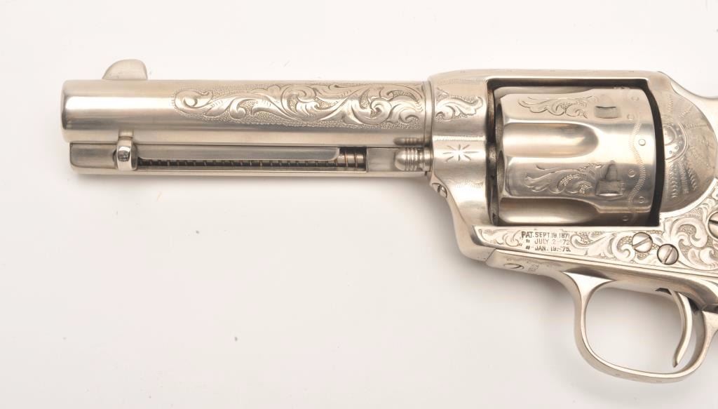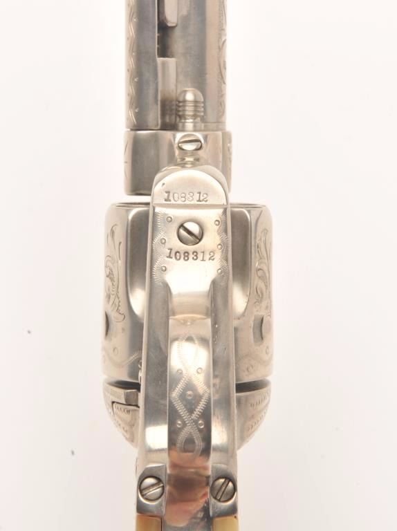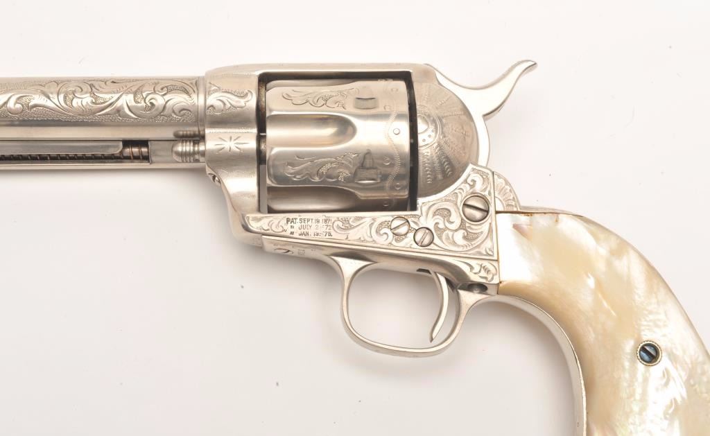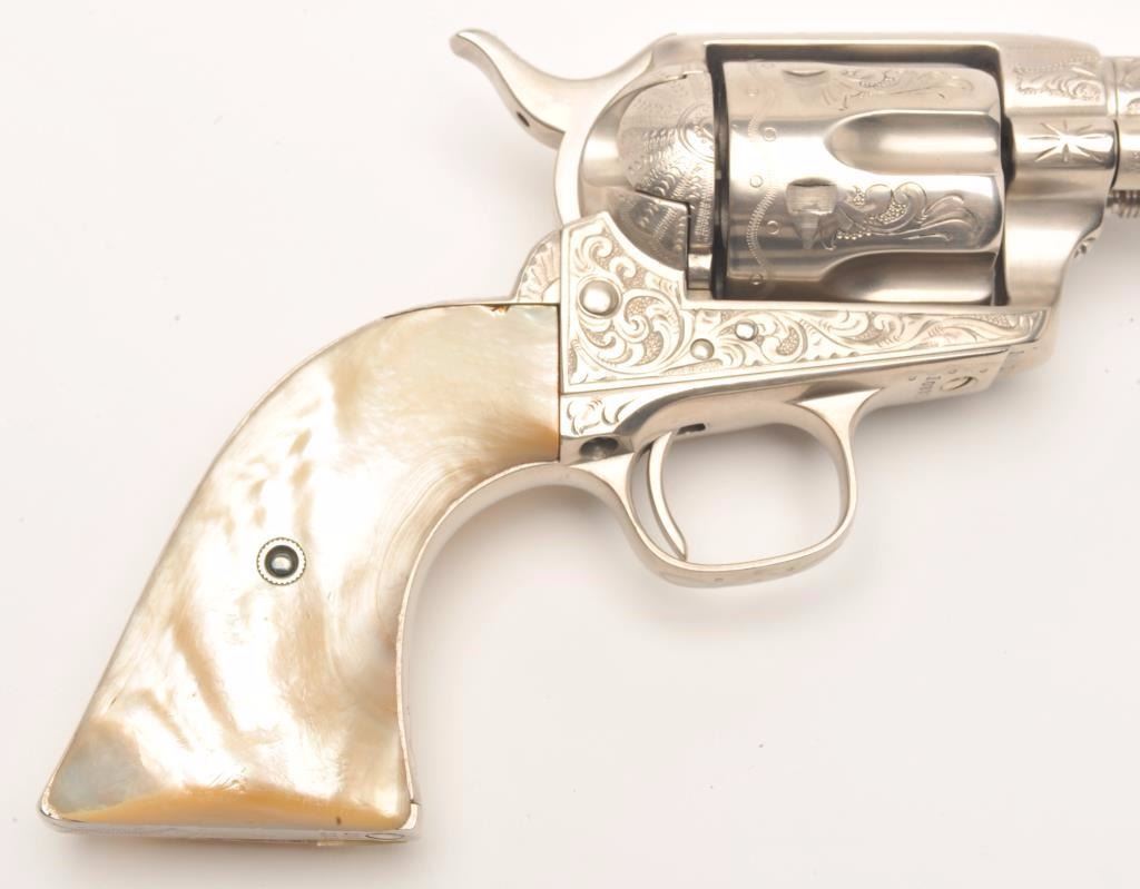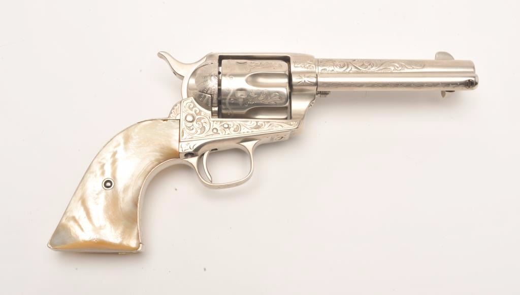 Engraved Colt SAA revolver, .45 caliber, 4.75” barrel, old re-nickel finish, two-piece pearl grips, S/N 108312, (matching visible numbers), in overall good to very good condition as re-finished, crisp action, clear engraving and markings, beautiful iridescent pearl grips with small old chip at top of left grip. (Antique). Est.: $4,000-$8,000.