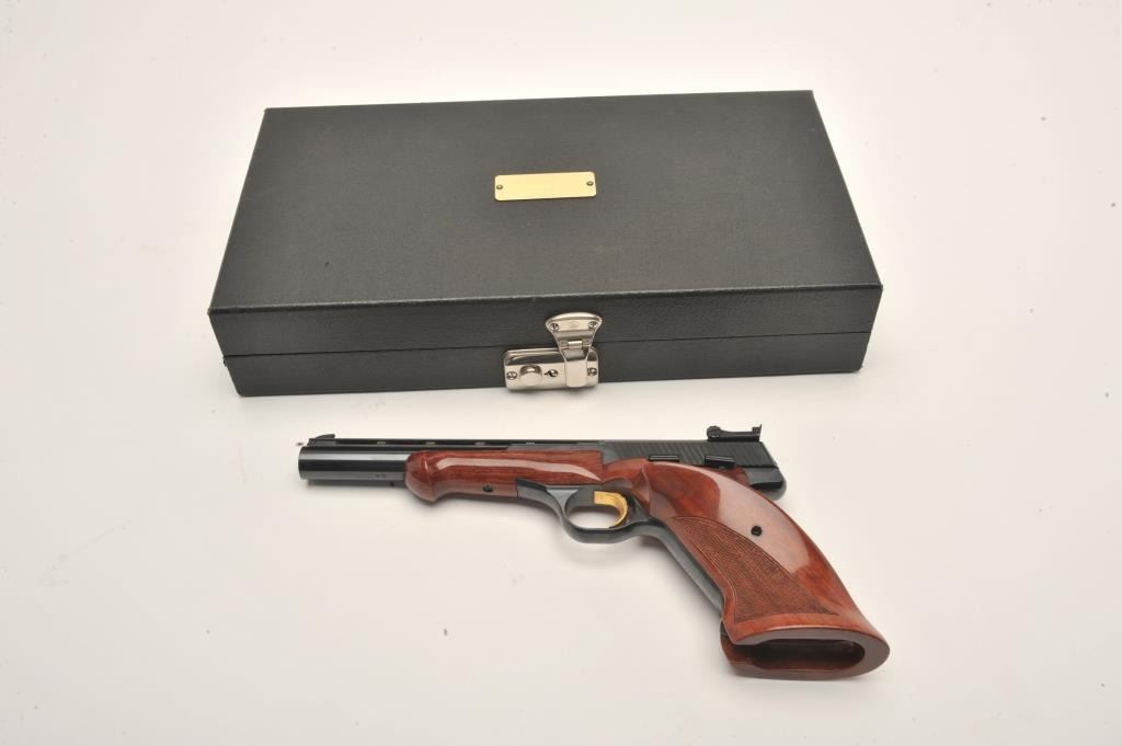 Browning Medalist Model semi-automatic target pistol, .22LR caliber, 6.75” ventilated rib barrel, blued finish, checkered wood thumb rest target grips with wood forend, gold trigger, S/N 31814T3, in near new conditionwith factory casing, barrel weight set with tool; instructions manual also included. (Modern/PPT). Est.: $1,250-$1,750.