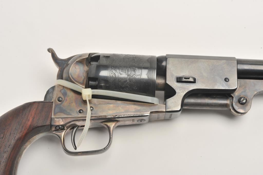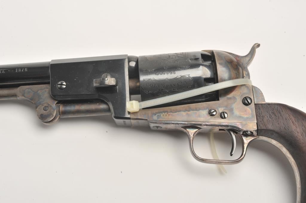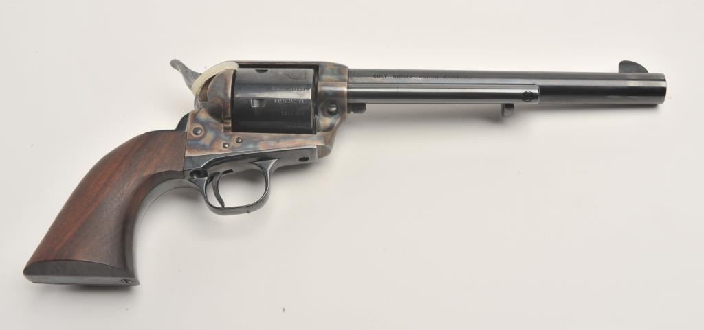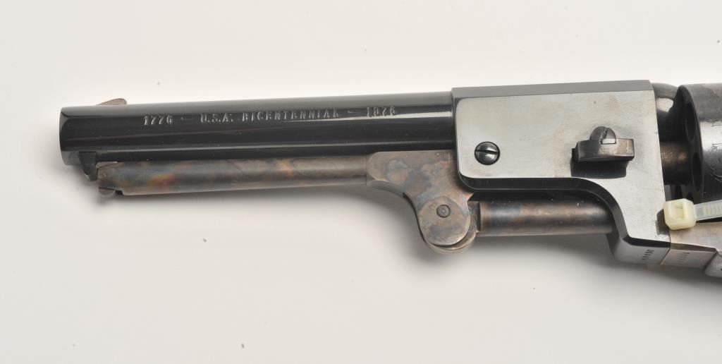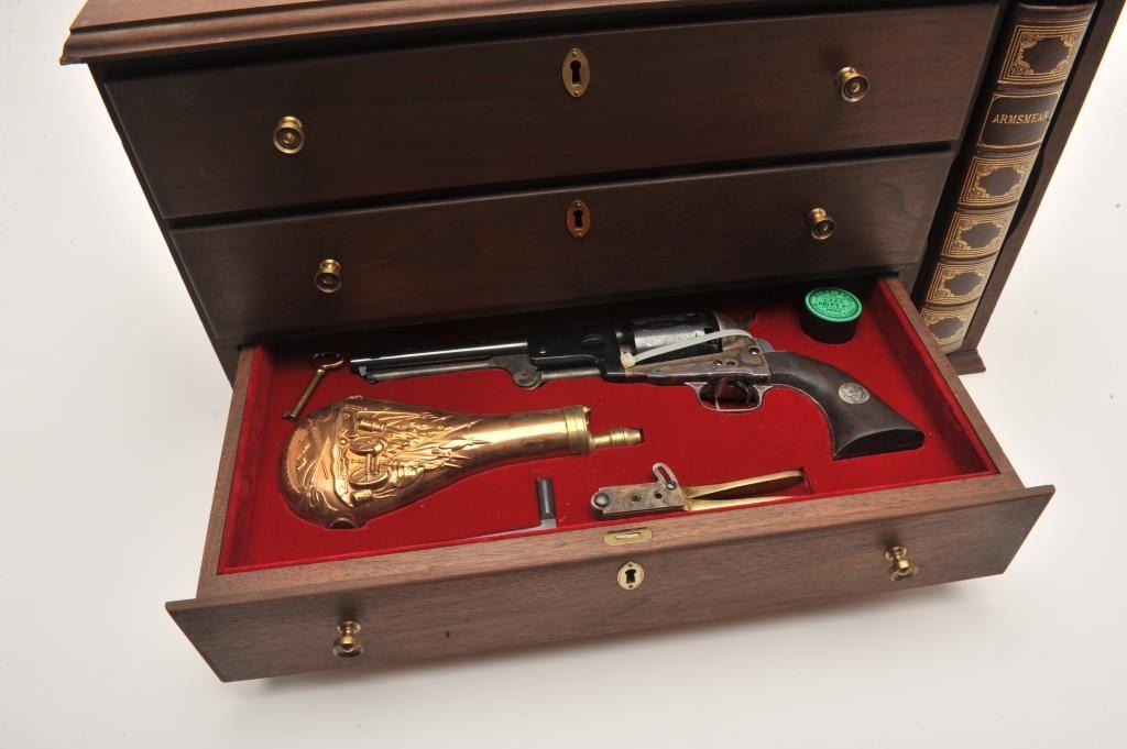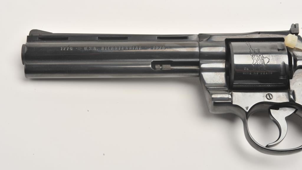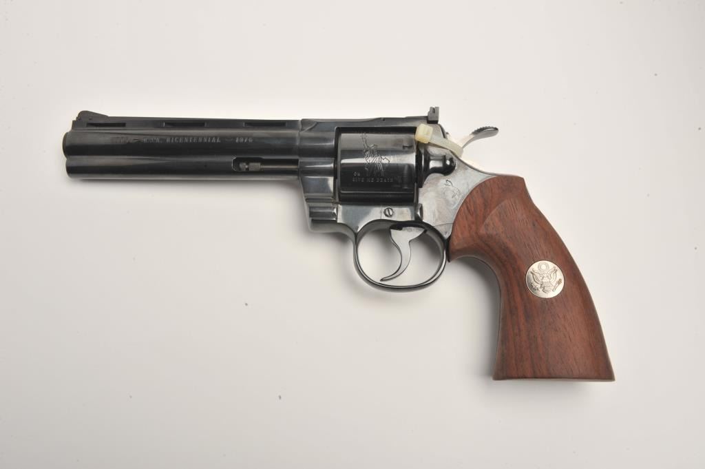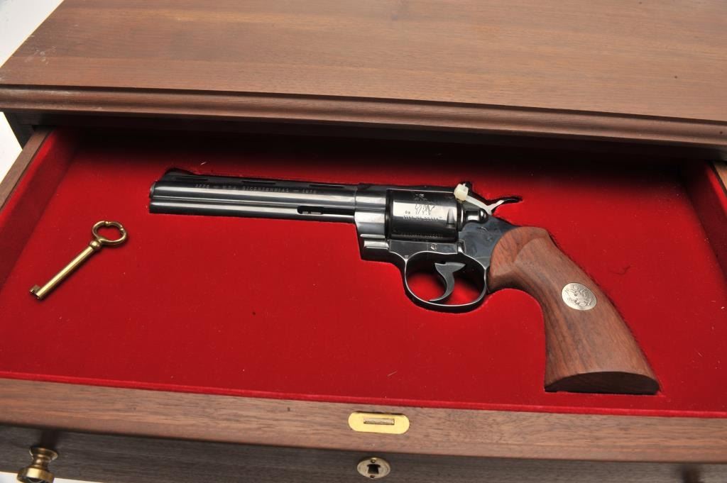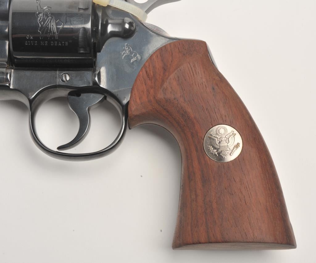 Colt Heritage set of 3 guns in wood casing with “Armsmear” deluxe edition hardback book; Guns include: 1. A Colt Bicentennial Python DA revolver, .357 Magnum caliber, 6” ventilated rib barrel, blued finish, smoothwood combat grips with American spread eagle insert on left grip, S/N 0669PY, in like new condition; 2. A Colt Bicentennial SAA revolver, .45 caliber, 7.5” barrel, blued and case hardened finish, smooth wood grips with American spread eagle insert on left grip, S/N 0669PM, in like new condition and; 3. A Colt Bicentennial New Black Powder Third Model Dragoon percussion revolver, .44 caliber, 7.5” barrel, blued and case hardened finish, smooth wood grips with American spread eagle insert on left grip, S/N 0669DG, in like new condition with accessories. A desirable Colt Commemorative set in a beautiful wood drawer casing.(Modern/PPT). Est.: $3,500-$7,000.