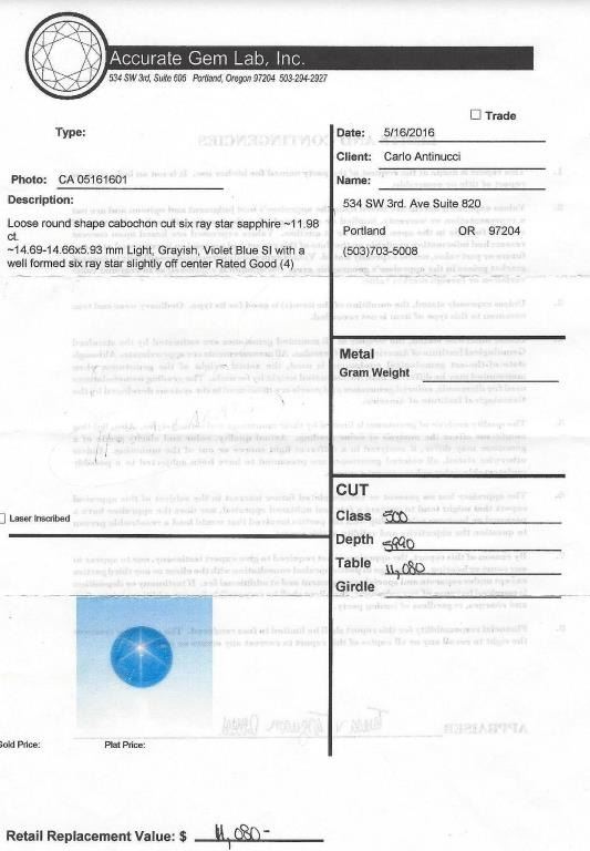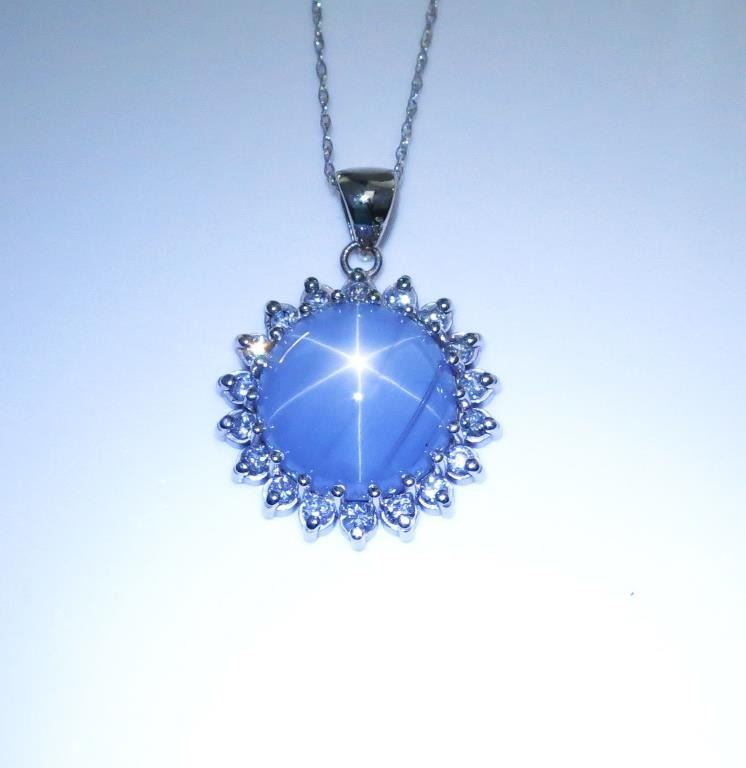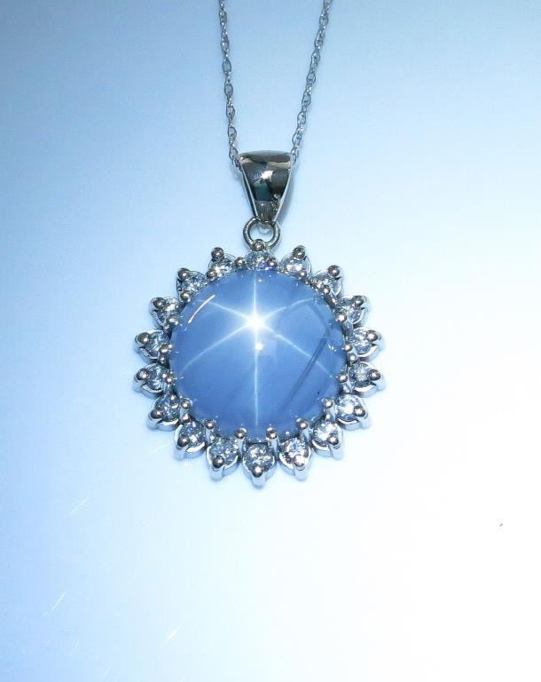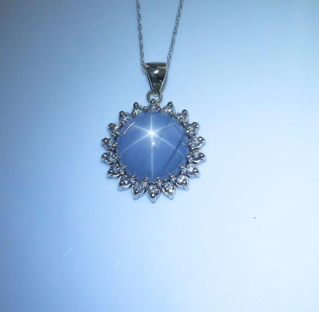 Very important ladies necklace featuring an excellent six ray Natural(NO Treatment) Star Sapphire weighing 11.98 carats and surrounded by eighteen round diamonds weighing approx. 0.70 carats of F-G colors and SI clarity in a 14 karat white gold custom made setting. Loose stone appraised at over $11,000.00 Retail $15,000-$20,000 Estimates $7,000-$9,000 Very rare size and quality Star.