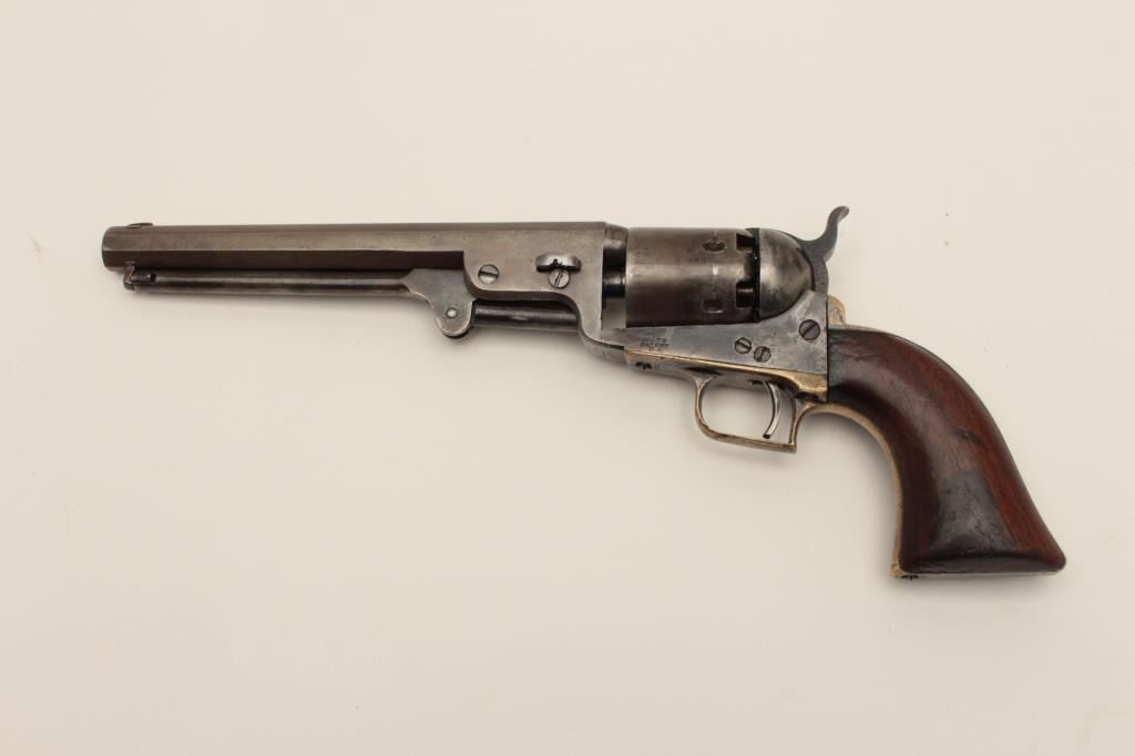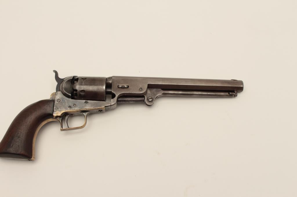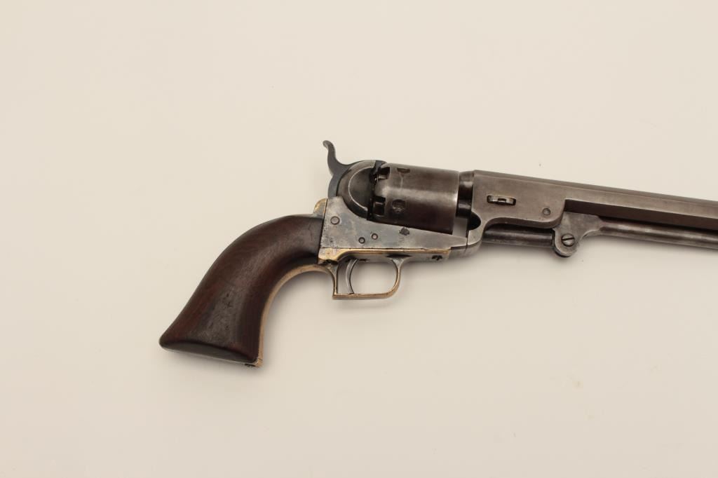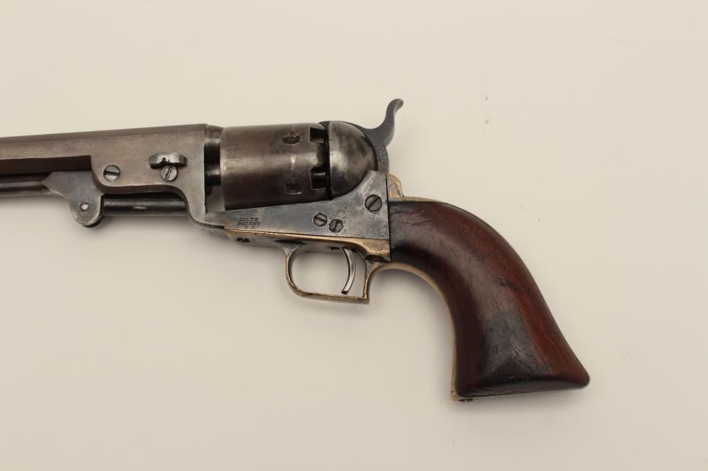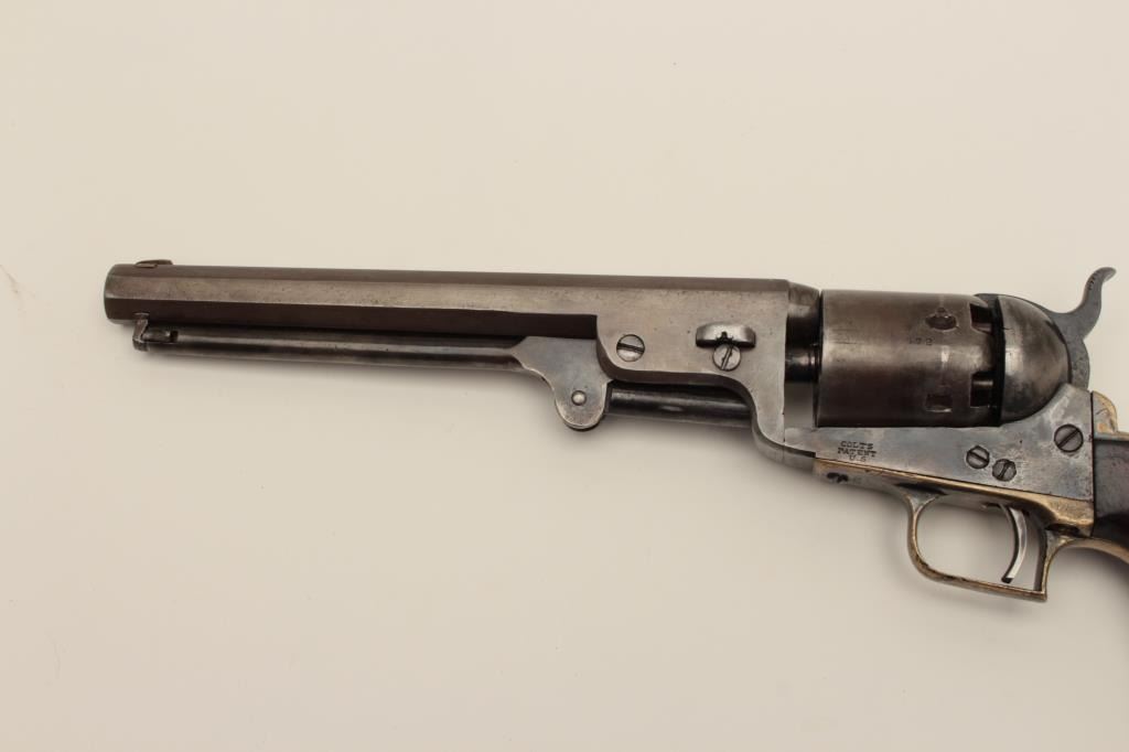 Ultra-rare Colt 1851 1st model U.S. marked Navy with wedge over screw variation, S/N 572. Only a handful of U.S. marked 1st model navies exist and are second in rarity on to a W.A.T. marked Texas Paterson in thepercussion era. These Navies may have been intended for use by the revenue service aboard revenue cutters. We have seen 3 in nearly 50 years and Colt experts theorize about 10-20 or less known and possibly as few as fifty made. The 1st model navy is rarely encountered but the Martial marked specimens are exceedingly rare. This revolver remains in good condition showing some cleaning, minor restorations,light recoloring and enlargement of the cylinder stops during the period of use. The barrel address and frame markings are well defined and clear with sharp U.S. The front sight is a period change to a blade and posttype. The grips are good with some wear, minor imperfections and staining at left bottom of the grip Shows some pitting on the frame and cleaning on the barrel. 30%-40% dark original silver plate on the straps and