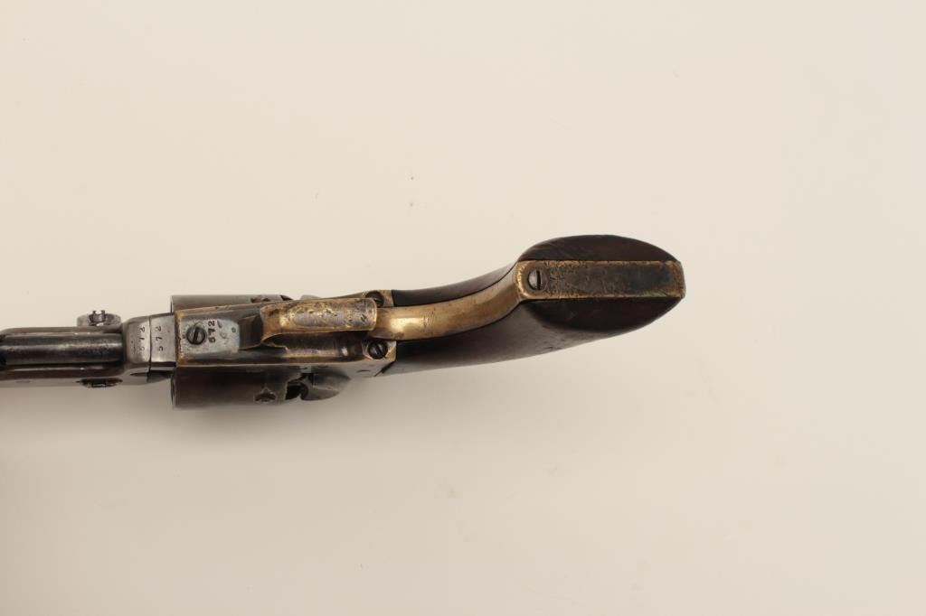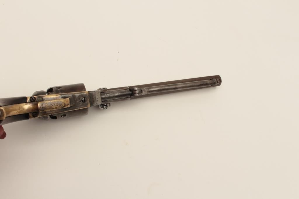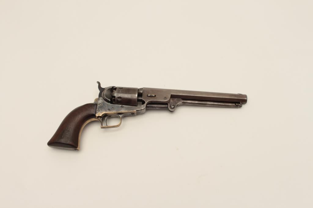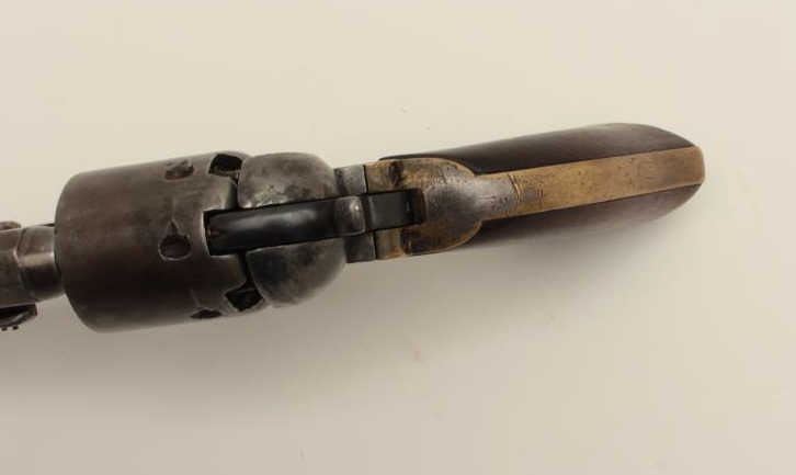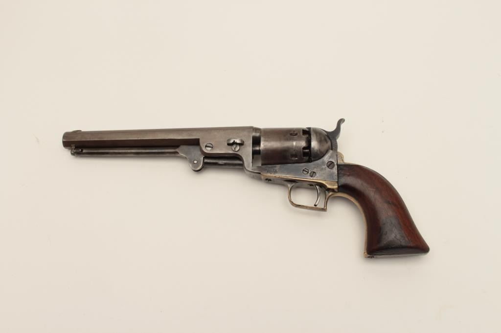 Ultra-rare Colt 1851 1st model U.S. marked Navy with wedge over screw variation, S/N 572. Only a handful of U.S. marked 1st model navies exist and are second in rarity on to a W.A.T. marked Texas Paterson in thepercussion era. These Navies may have been intended for use by the revenue service aboard revenue cutters. We have seen 3 in nearly 50 years and Colt experts theorize about 10-20 or less known and possibly as few as fifty made. The 1st model navy is rarely encountered but the Martial marked specimens are exceedingly rare. This revolver remains in good condition showing some cleaning, minor restorations,light recoloring and enlargement of the cylinder stops during the period of use. The barrel address and frame markings are well defined and clear with sharp U.S. The front sight is a period change to a blade and posttype. The grips are good with some wear, minor imperfections and staining at left bottom of the grip Shows some pitting on the frame and cleaning on the barrel. 30%-40% dark original silver plate on the straps and