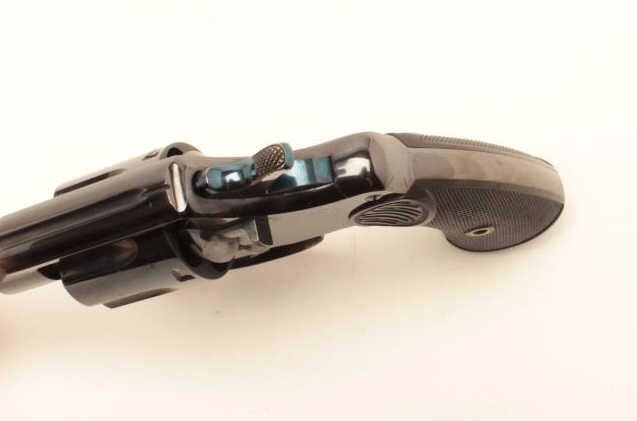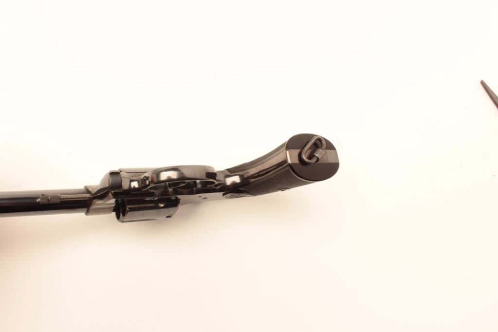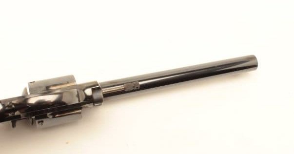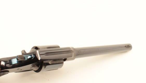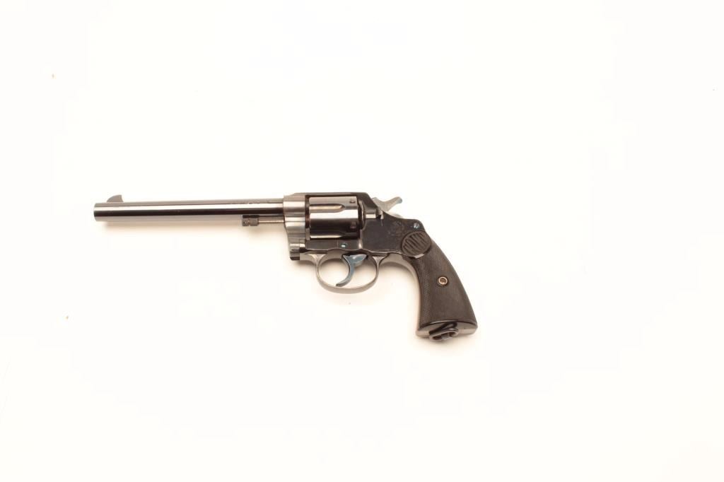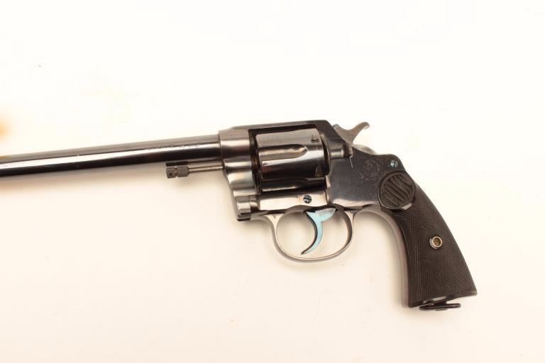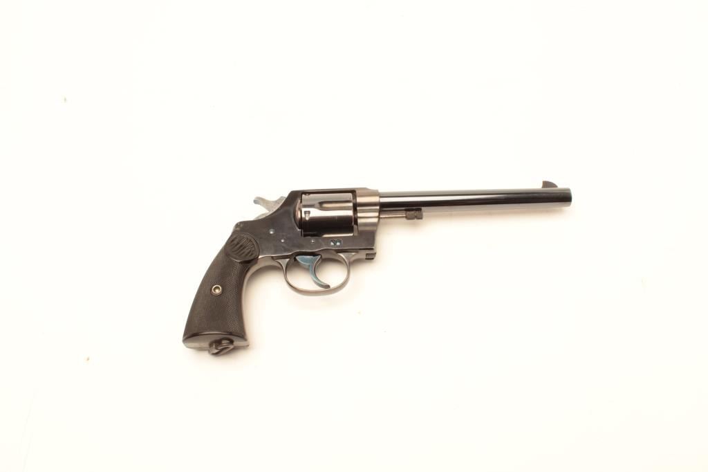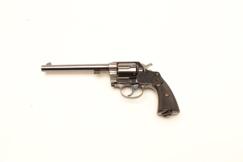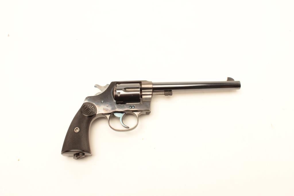 Lot 854 Colt New Service DA revolver, .45 Colt caliber, 7.5” barrel, high polish blued finish, checkered h
