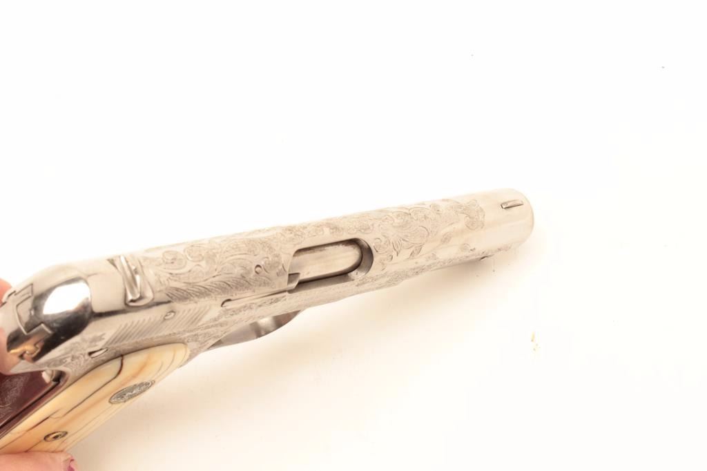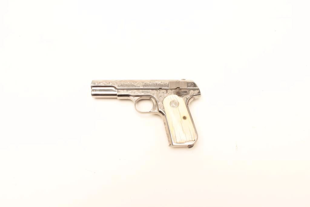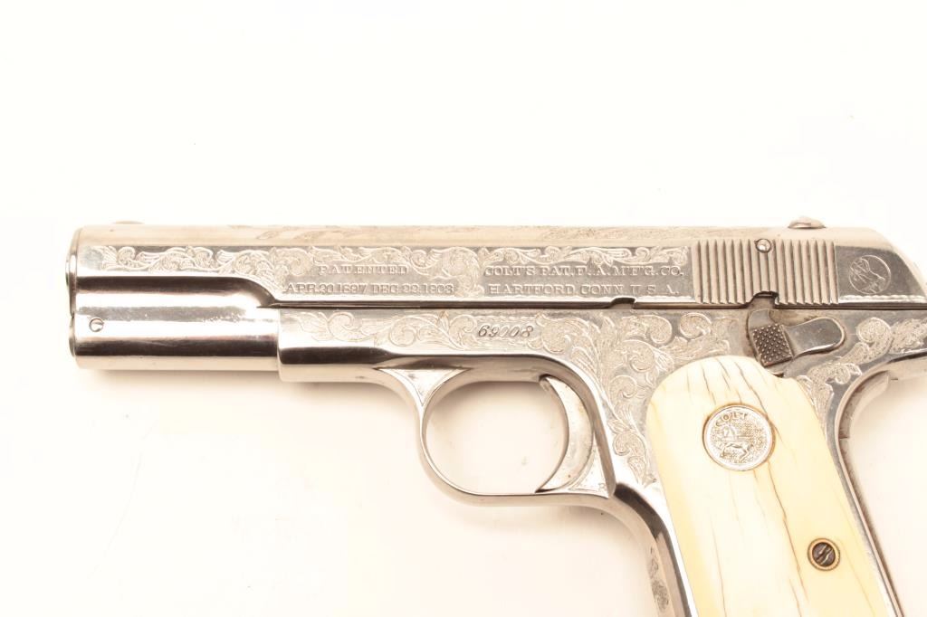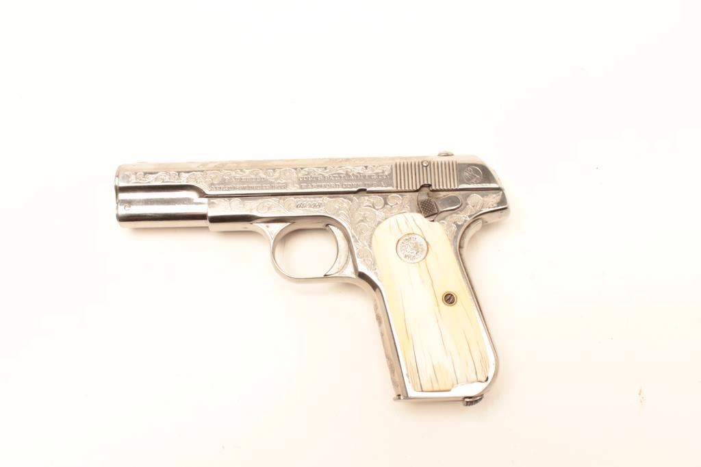 Lot 856 Colt Model 1903 semi-automatic pistol with barrel bushing, .32 caliber, scroll engraved with tribu