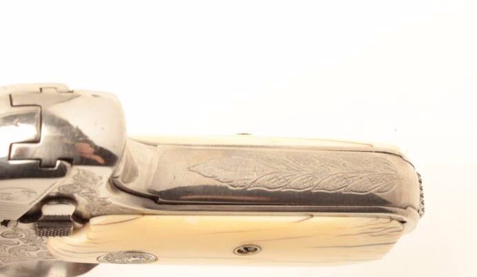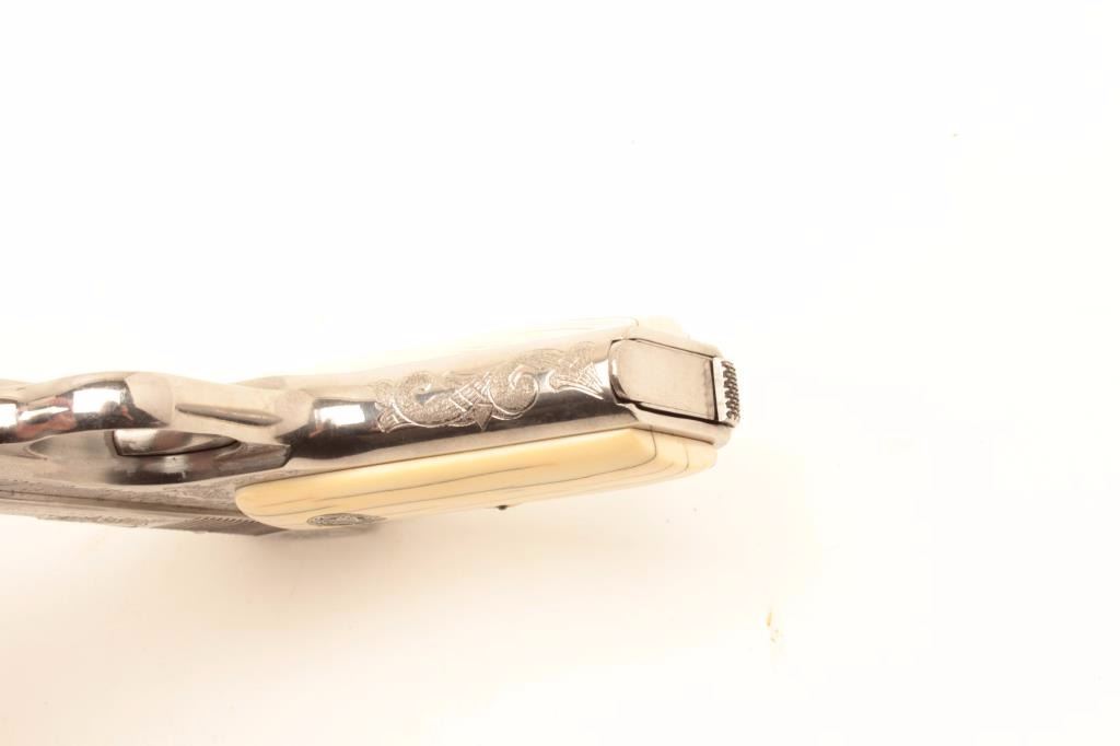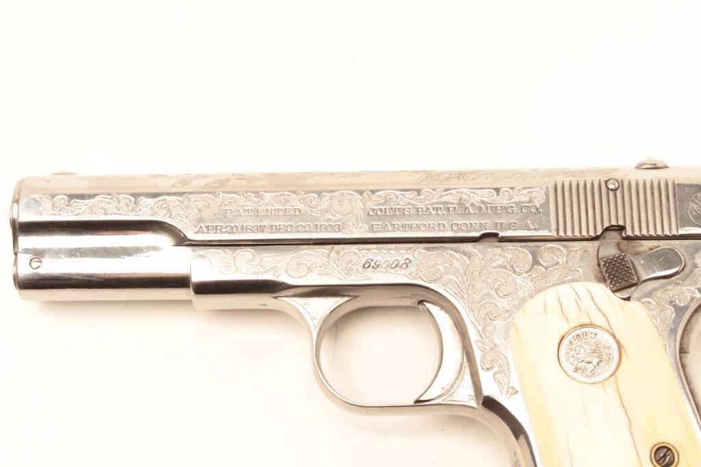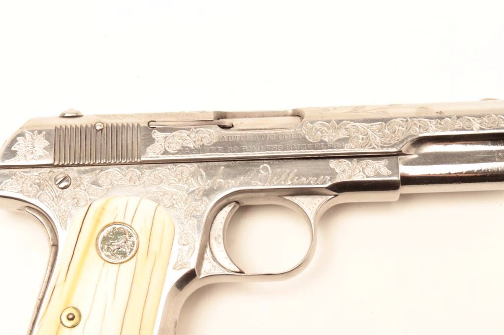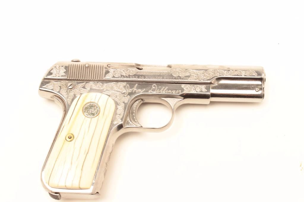 Colt Model 1903 semi-automatic pistol with barrel bushing, .32 caliber, scroll engraved with tribute to John Dillinger; S/N 69008, polished to bright with medallion ivory grips showing cracking and age; mechanically sound with fair to good bore; very showy. (C&R). Est.: $1,000-$2,000.
