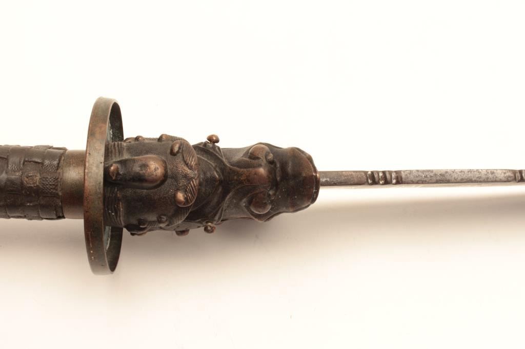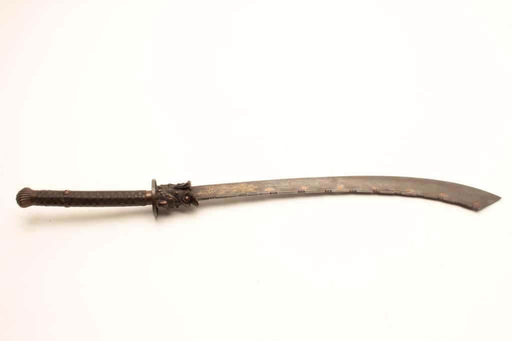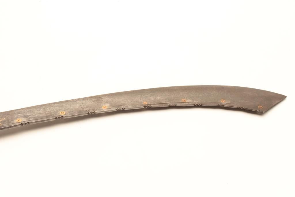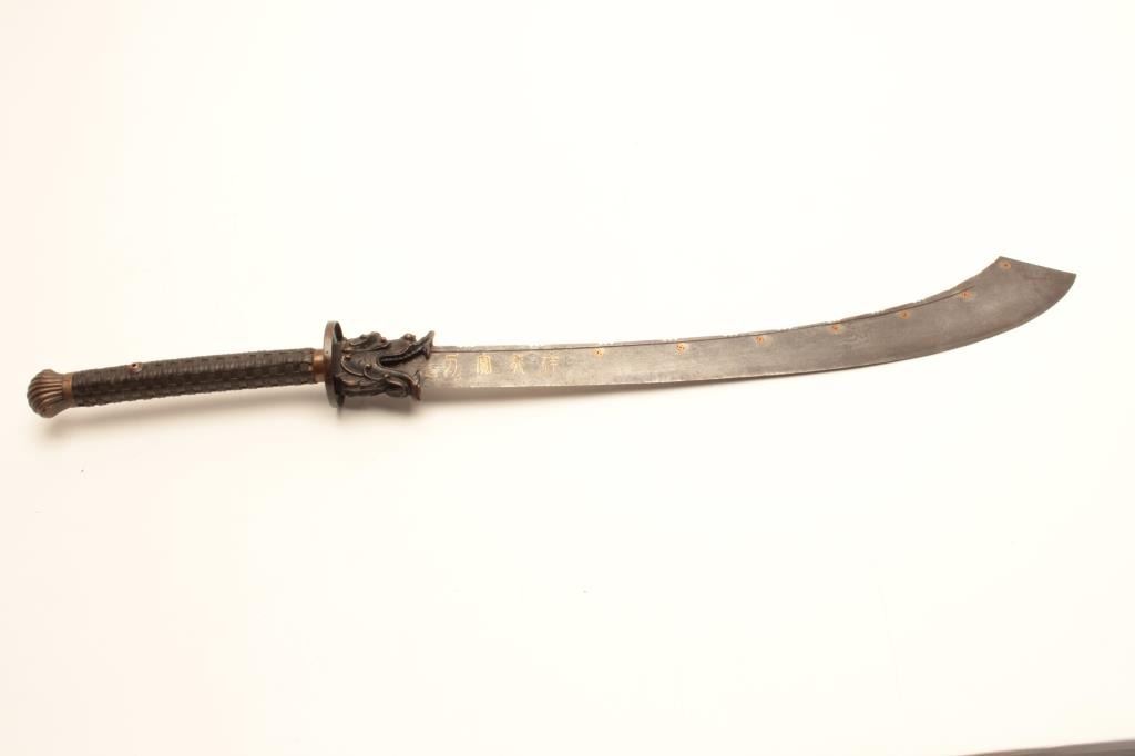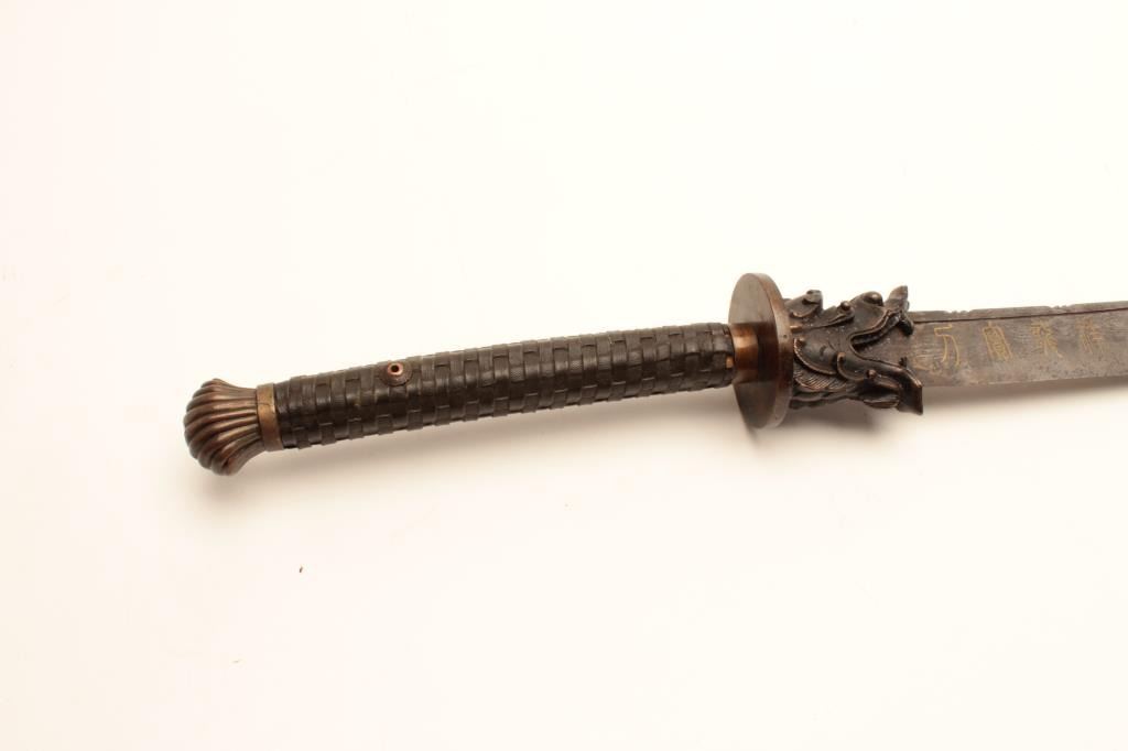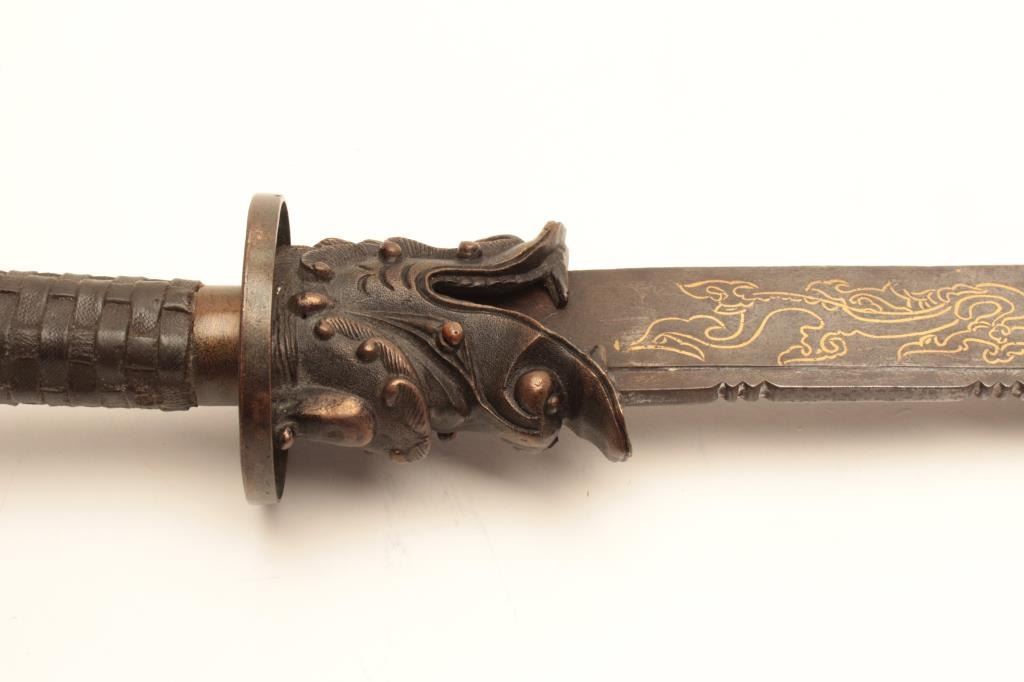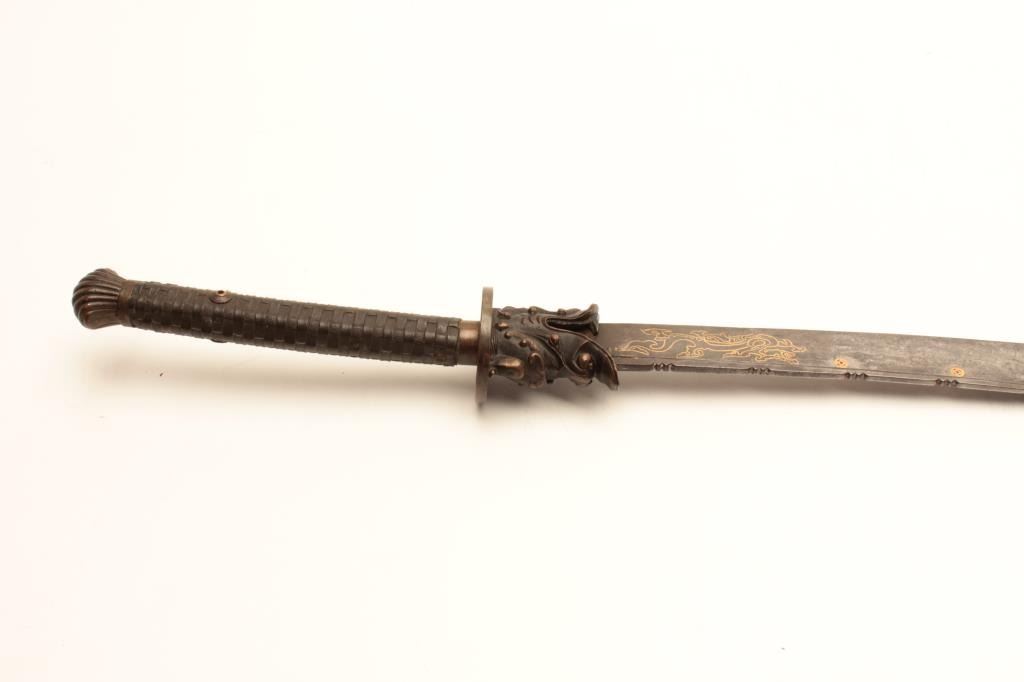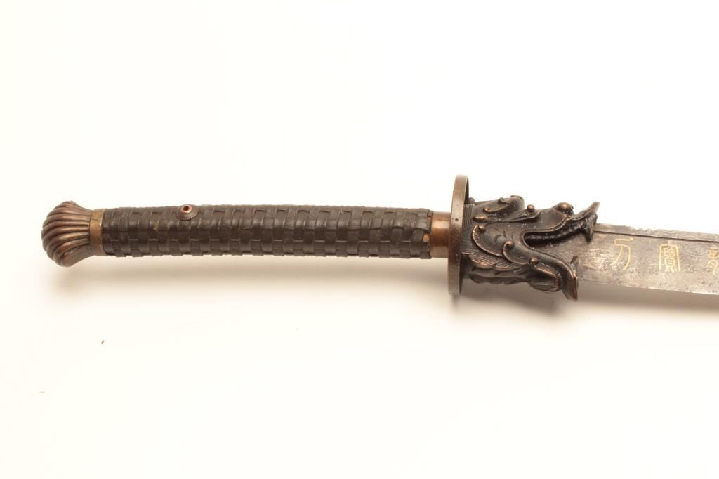 Impressive and large Chinese Dadao or great sword with fancy Damascus steel pattern blade with small copper inlay and gold dragon. Measures 42” overall with a 30” blade flaring from 2” to 3” at the tip. Good to very goodoverall condition. The blade appears from an earlier era than the hilt. Est.: $1500-$3000+