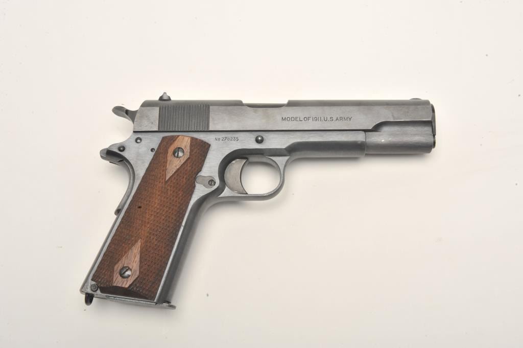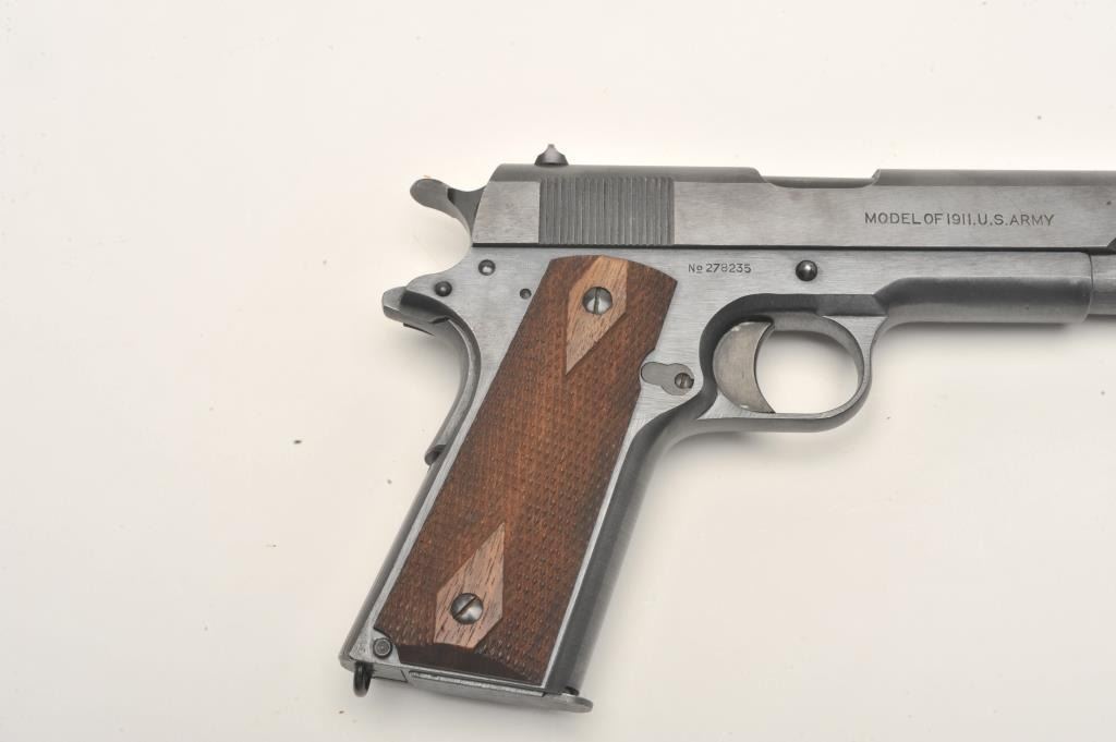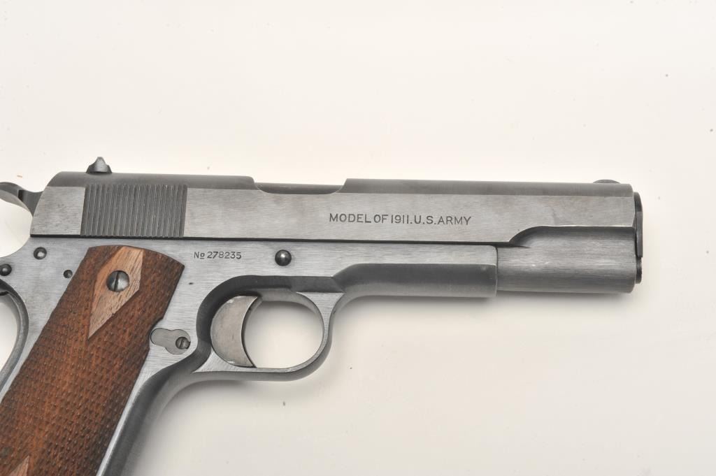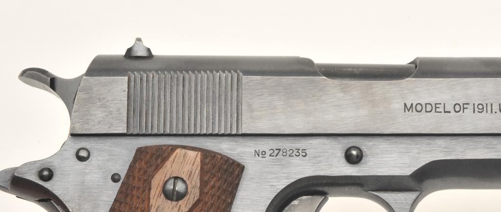 Colt U.S. Property Model 1911 semi-automatic pistol, .45 caliber, 5” barrel, black finish, checkered wood grips, two-tone magazine, S/N 278235. This near mint “Black Army” displays approximately 99% + original finish, fine bore, crisp action, sharp markings and excellent grips; would be hard to improve condition of this one! (C&R/PPT). Est.: $2,500-$5,000.