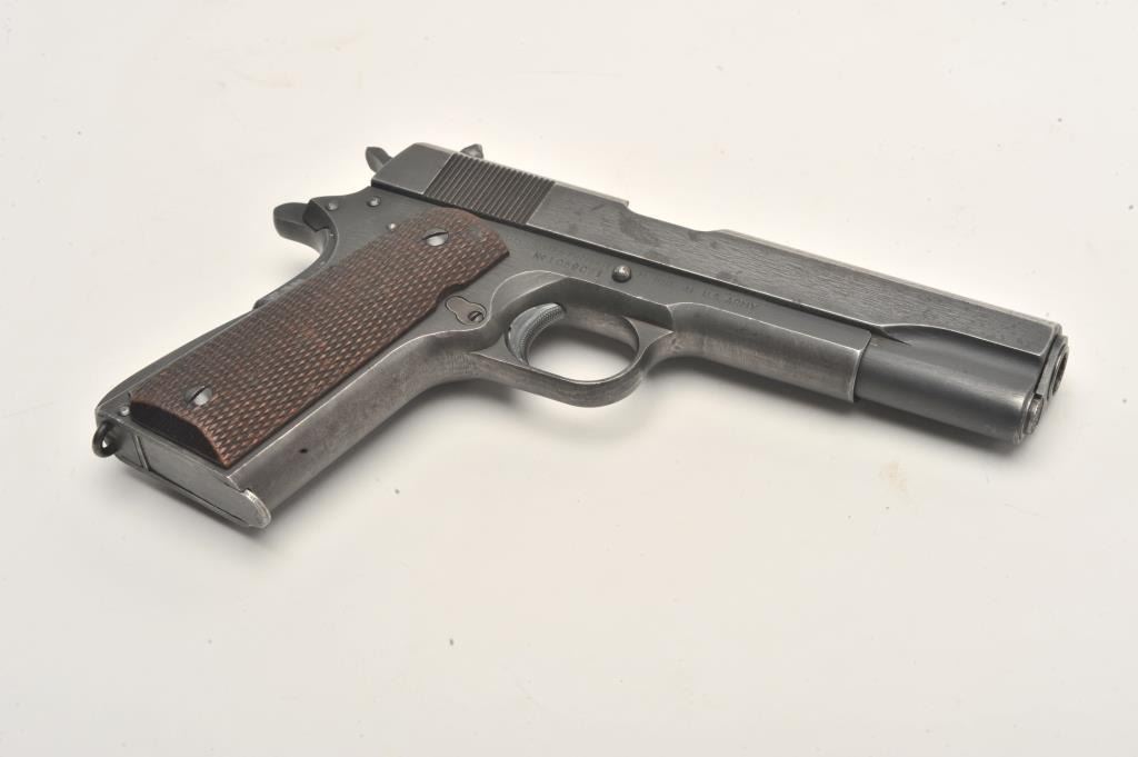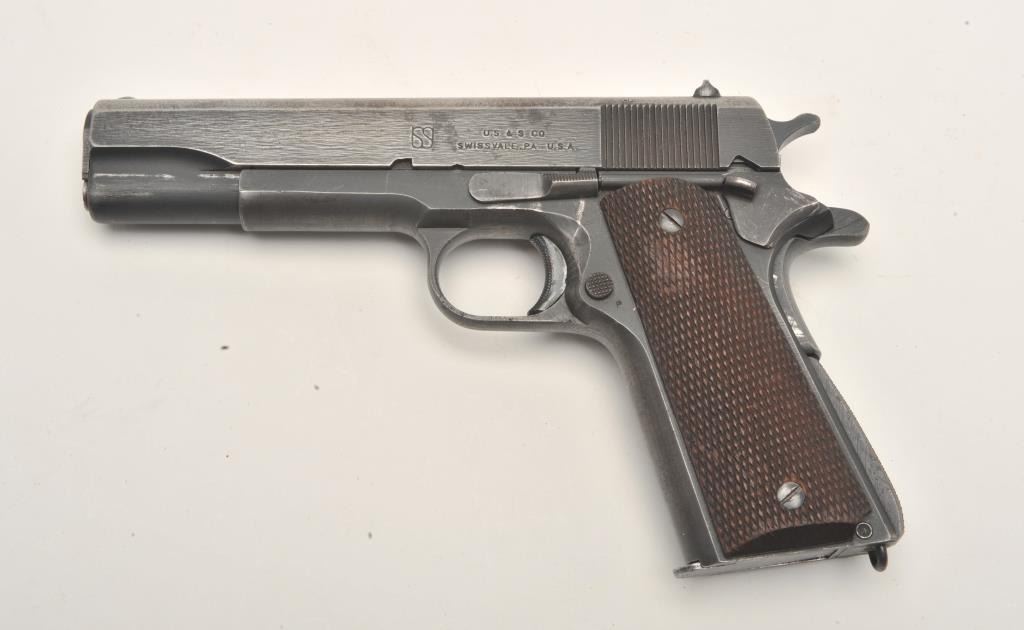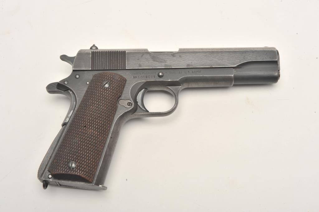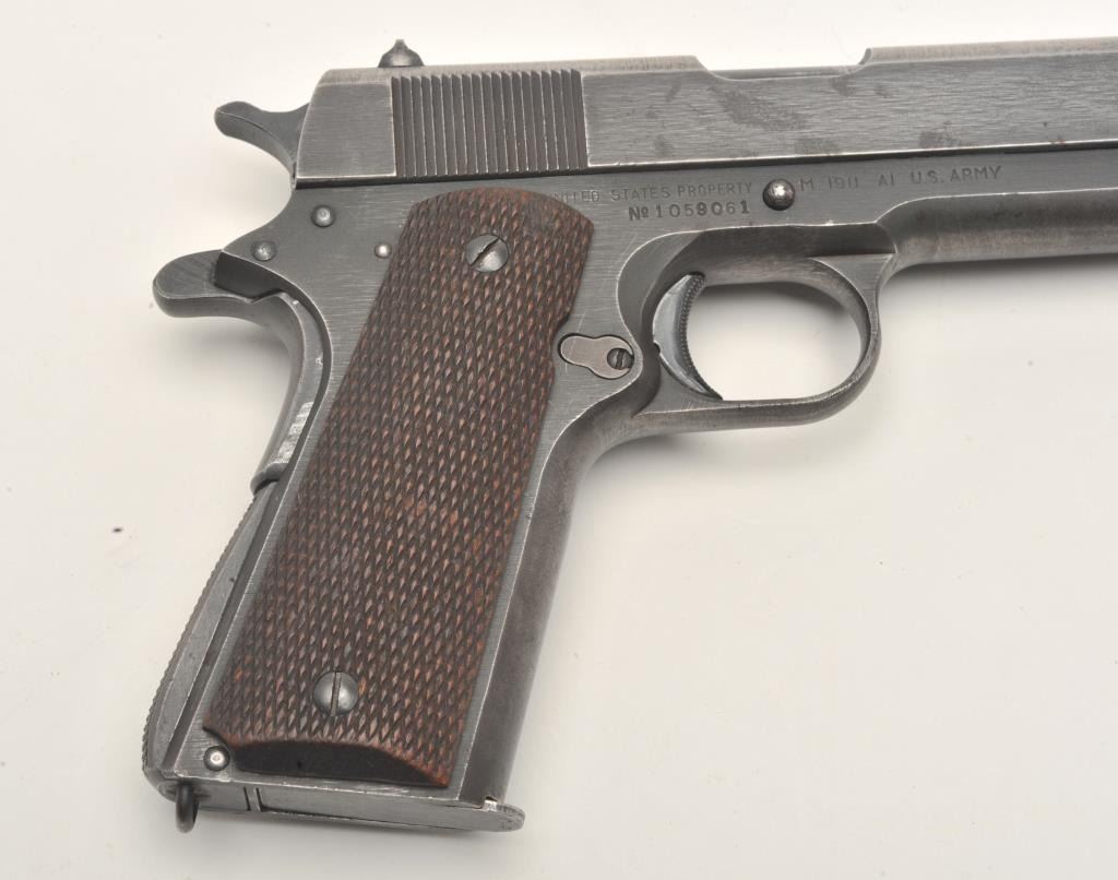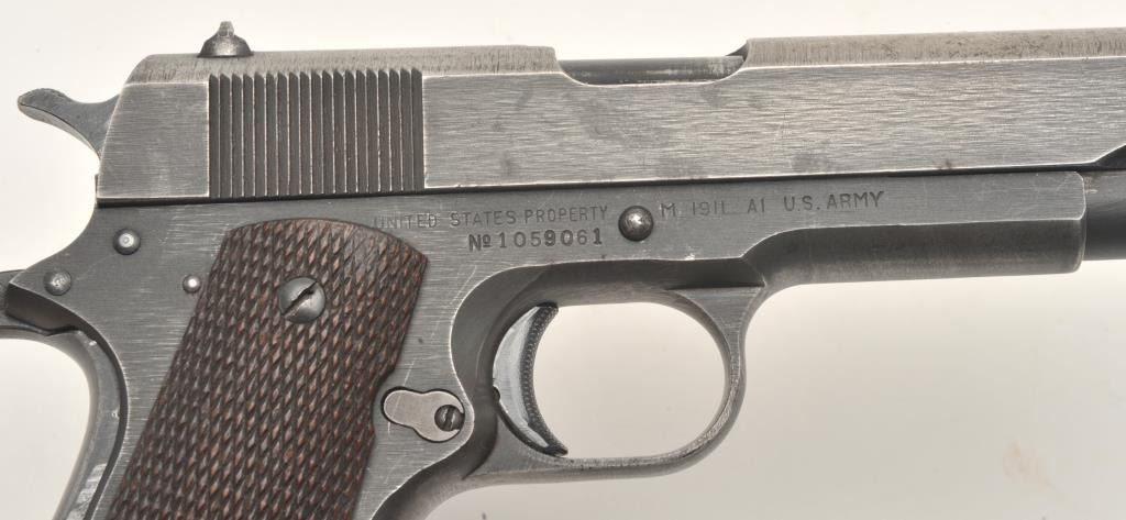 U.S. Property marked Union Switch & Signal Model 1911-A1 semi-automatic pistol, .45 caliber, 5” barrel, military finish, checkered wood grips, S/N 1059061, in overall very good condition displaying considerablemilitary finish, very good bore, crisp action, very good markings and very good grips. (C&R/No PPT). Est.: $1,500-$3,000.