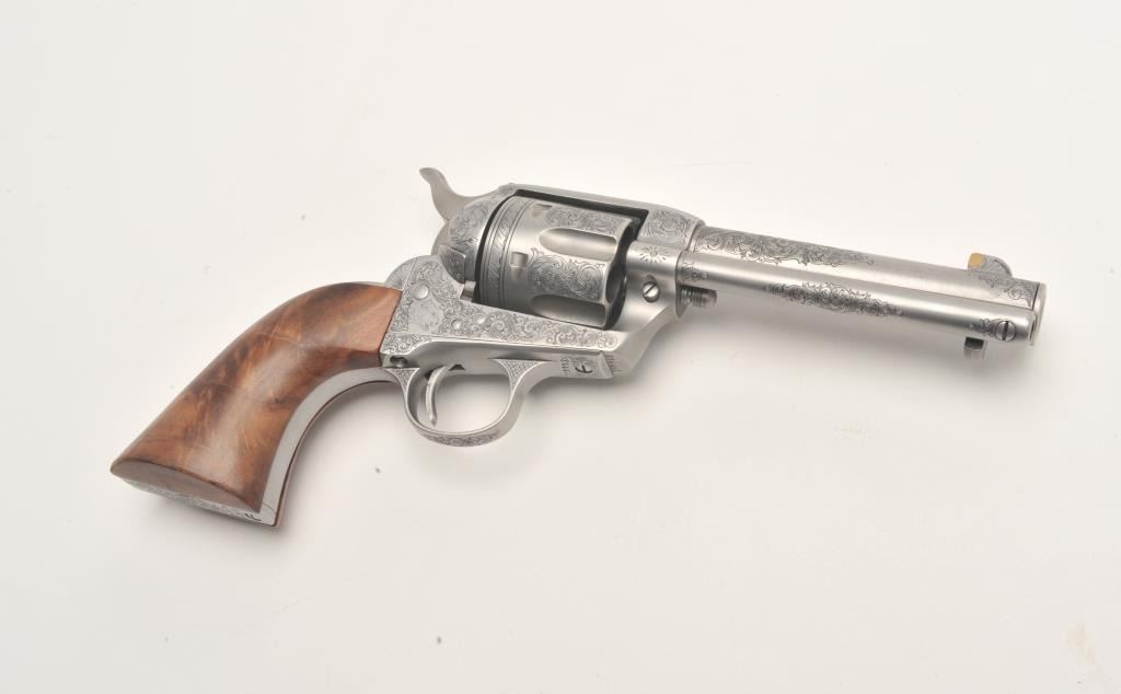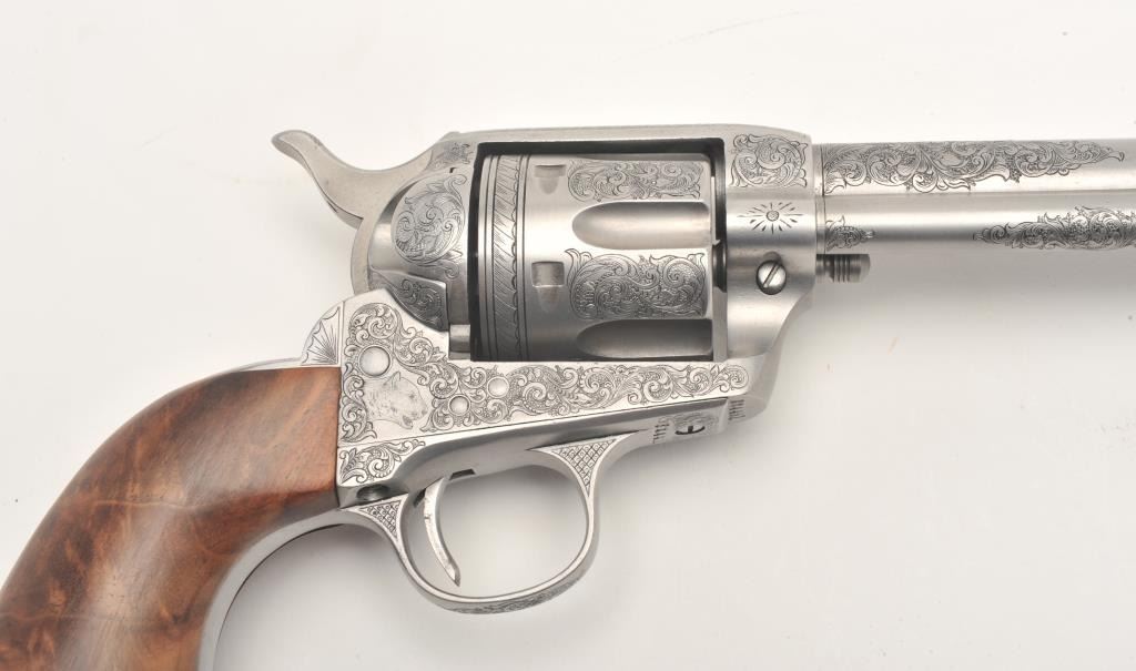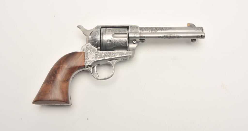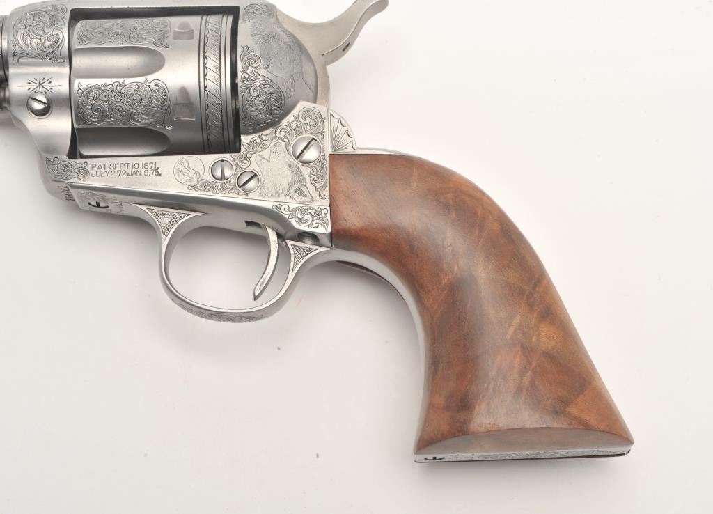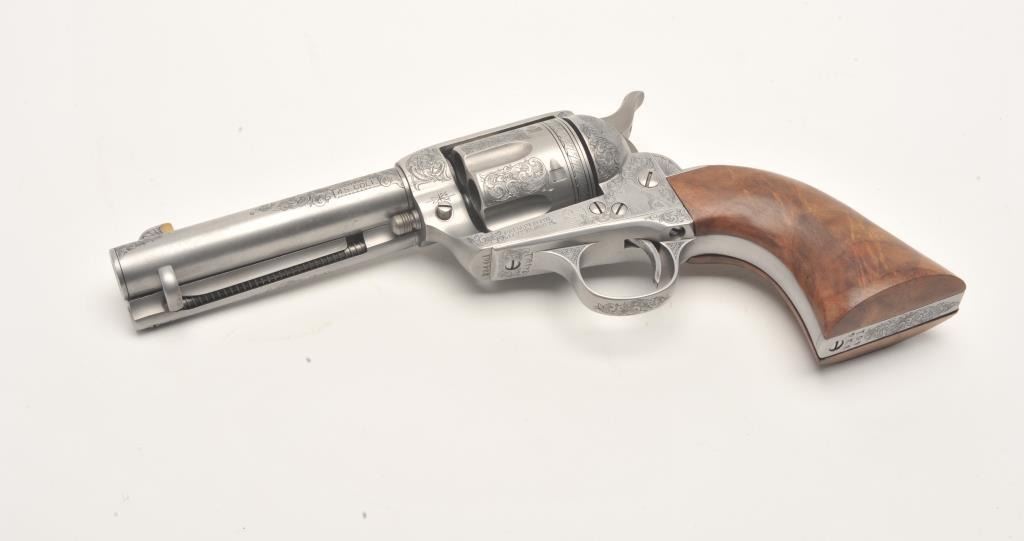 Custom engraved Colt SAA revolver, .45 Colt caliber, 4.75” barrel, custom wood grips, S/N 324461, in overall very good + condition as custom engraved with scroll patterns and three game heads (a wolf, a bison and amountain lion); finish is “in the white”, action and markings are crisp, bore is good and grips show beautiful graining. (C&R/No PPT). Est.: $2,000-$4,000.
