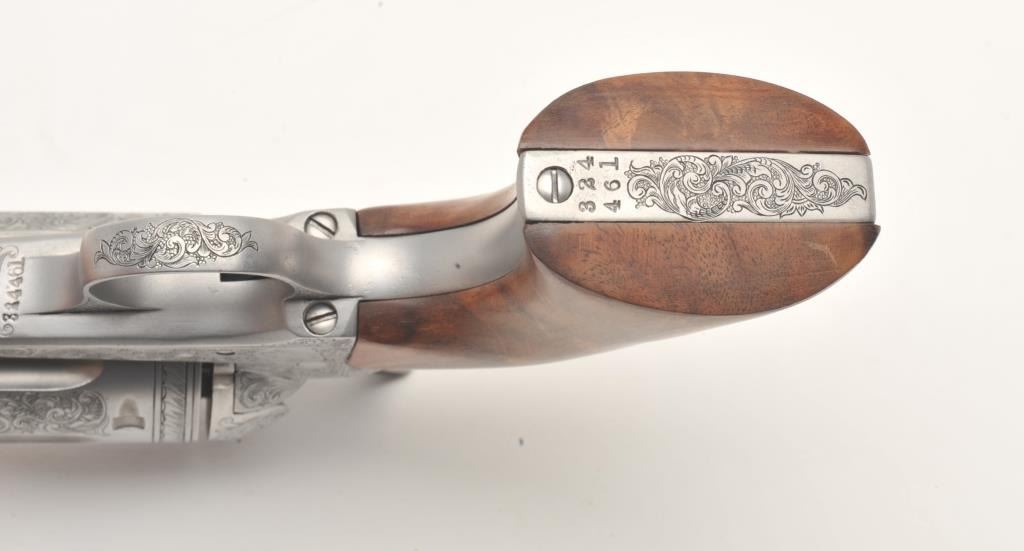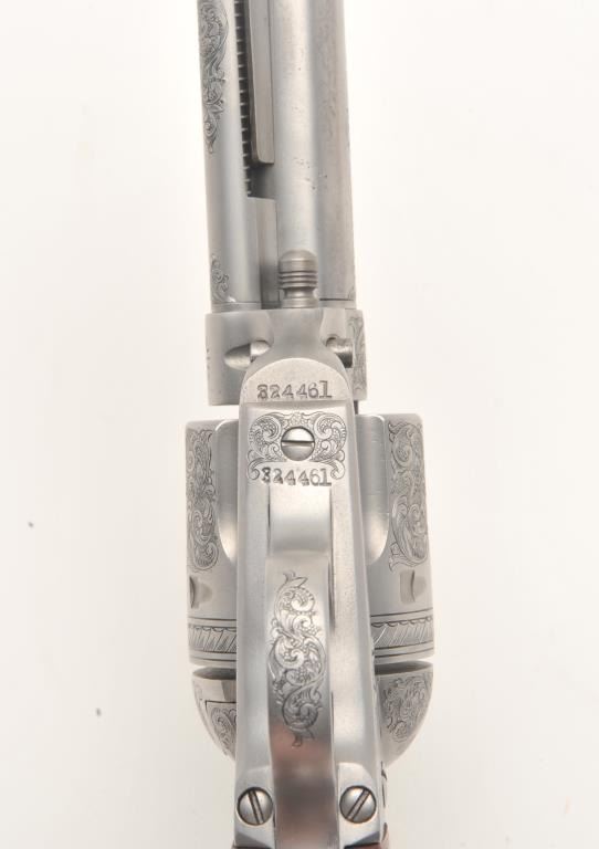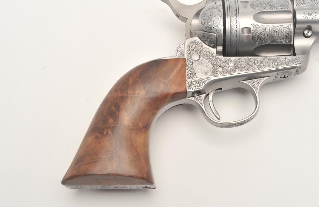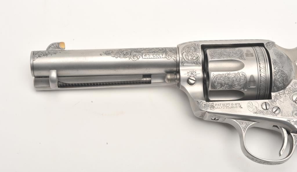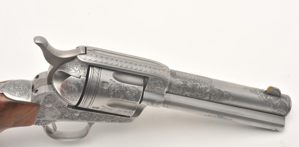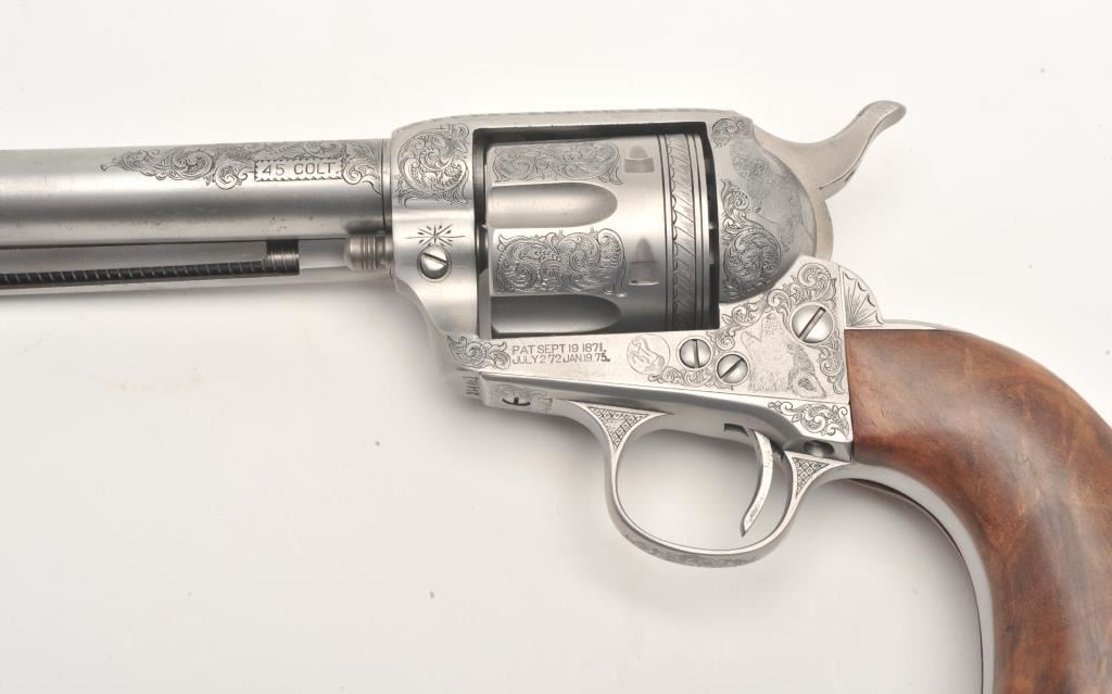 Custom engraved Colt SAA revolver, .45 Colt caliber, 4.75” barrel, custom wood grips, S/N 324461, in overall very good + condition as custom engraved with scroll patterns and three game heads (a wolf, a bison and amountain lion); finish is “in the white”, action and markings are crisp, bore is good and grips show beautiful graining. (C&R/No PPT). Est.: $2,000-$4,000.