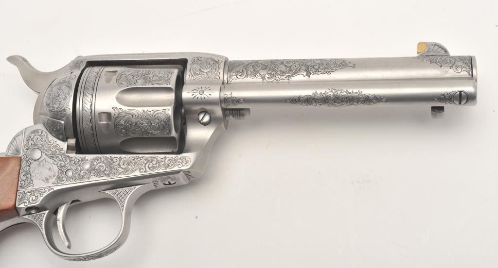 Lot 888 Custom engraved Colt SAA revolver, .45 Colt caliber, 4.75” barrel, custom wood grips, S/N 324461,