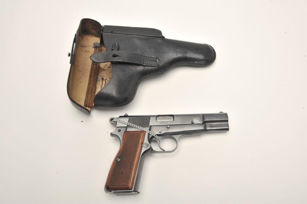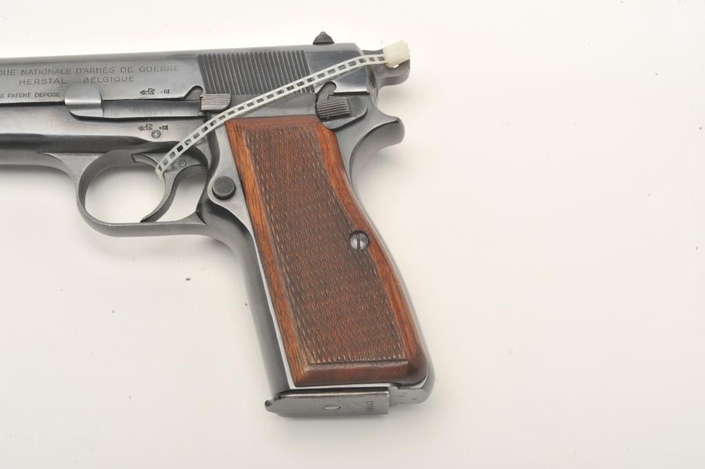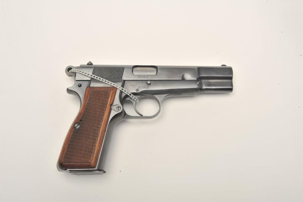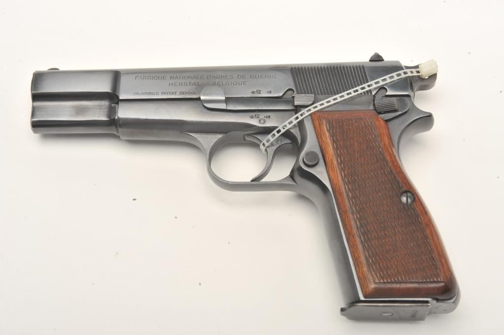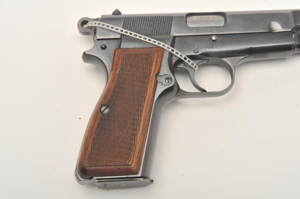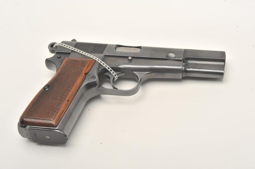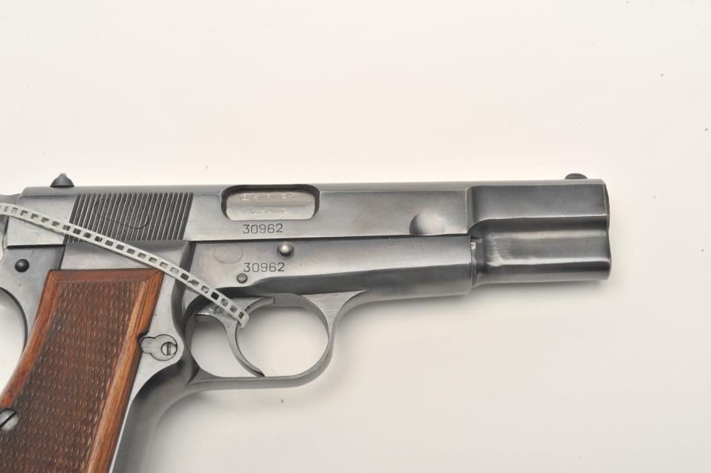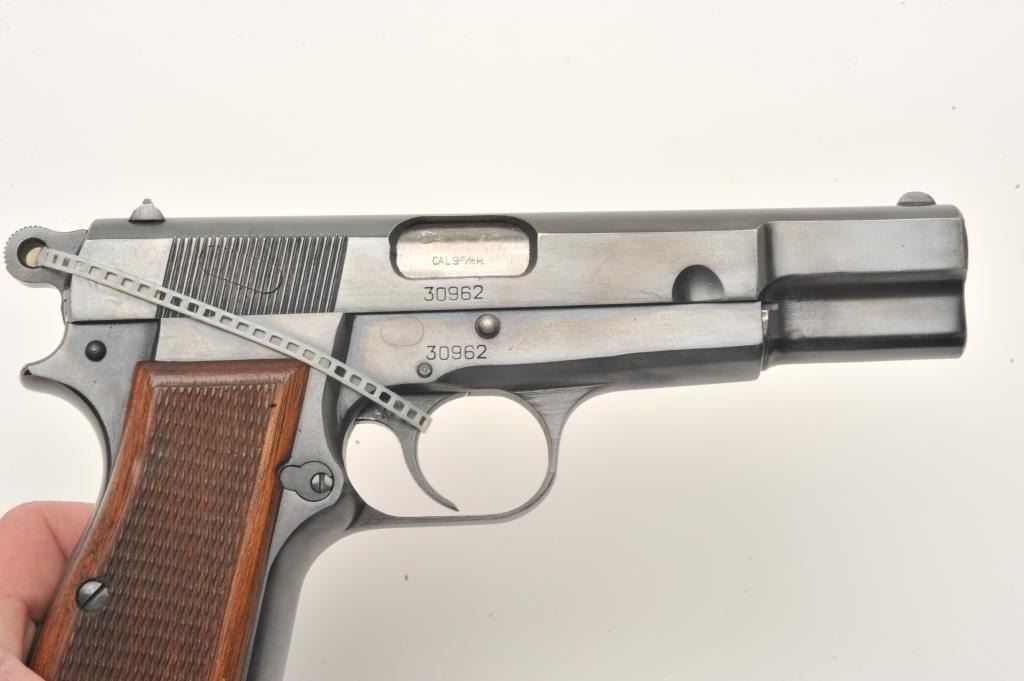 Early Browning High Power semi-automatic pistol, 9mm caliber, 4.5” barrel, blued finish, checkered wood grips, S/N 30962, with two matching magazines and Belgian military leather flap holster; this gun is in overallfine condition showing the majority of its finish, fine bore, action, markings and grips; CONSECUTIVELY NUMBERED TO THE NEXT LOT (S/N 30961). (C&R/No PPT/NO MAG. DELIVERABLE TO CALIF. RESIDENT). Est.:$1,000-$2,000.