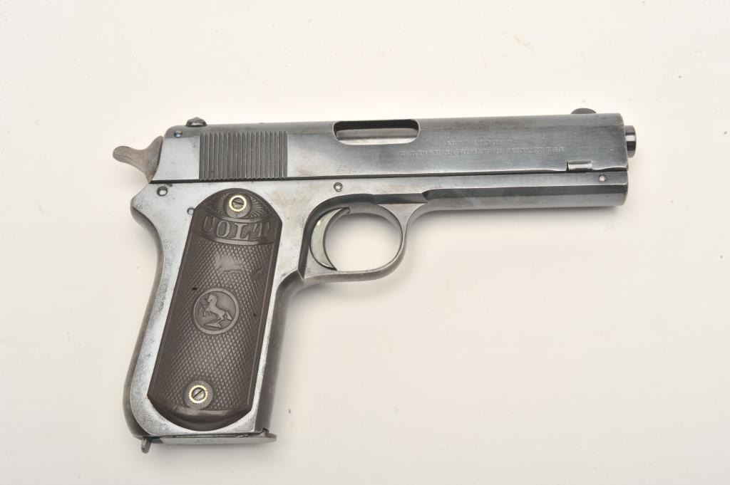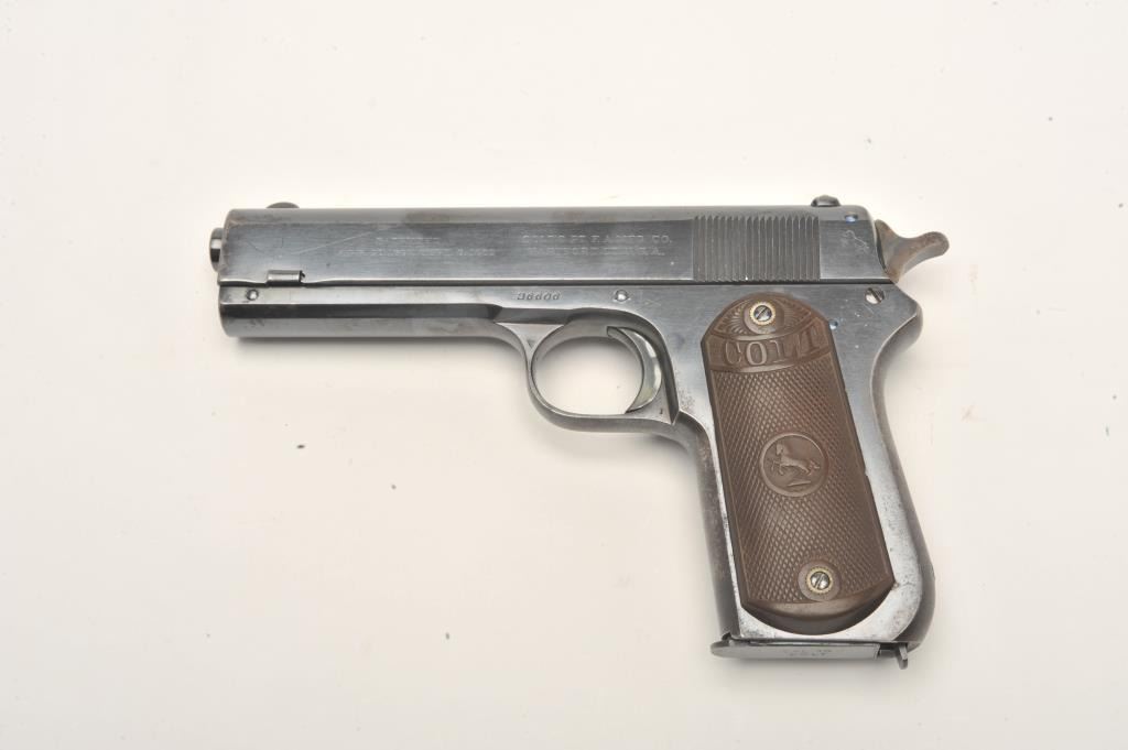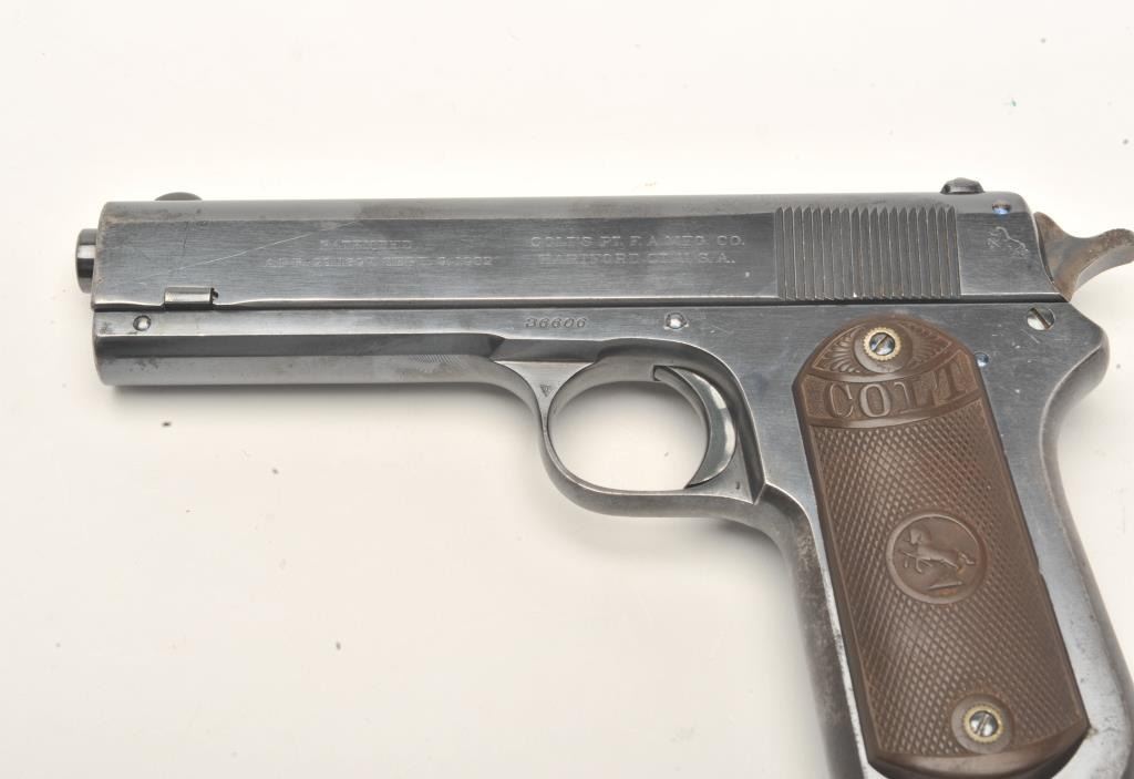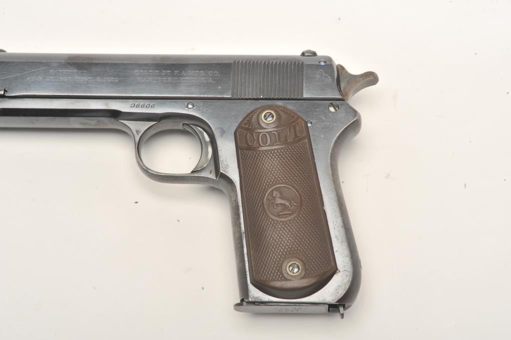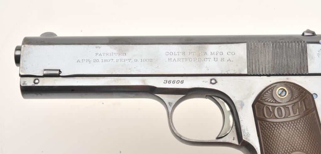 Colt Model 1903 Pocket hammer semi-automatic pistol, .38 caliber, 4.5” barrel, blued finish, checkered hard rubber grips, S/N 36606, in overall very good to fine condition displaying the majority of its originalblued finish, crisp action and markings, very good bore and grips. (C&R/PPT). Est.: $1,400-$2,800.