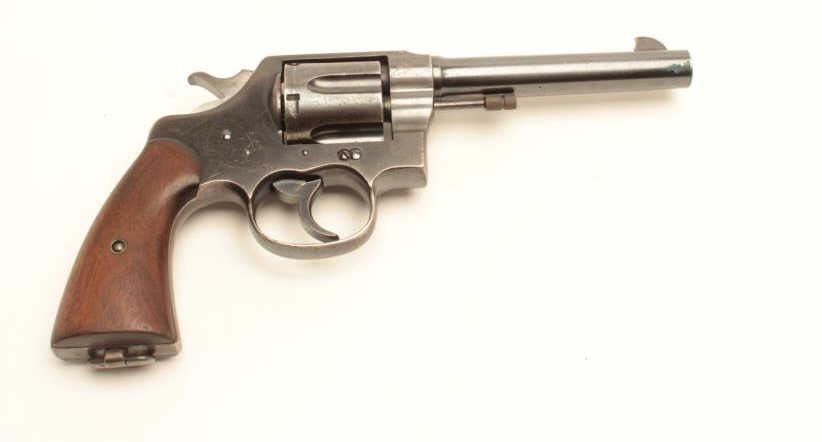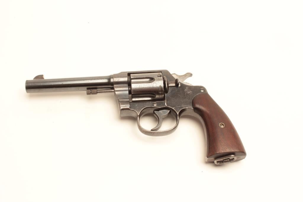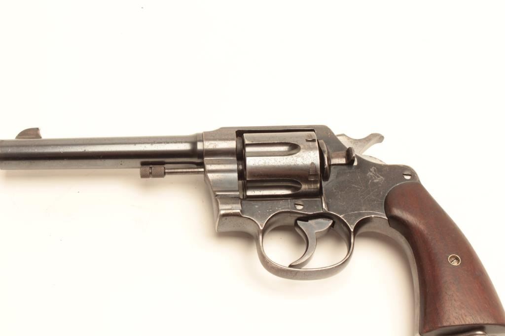 Lot 903 Colt New Service DA revolver, .45 Colt caliber, 5.5” barrel, blued finish, smooth wood grips, lany