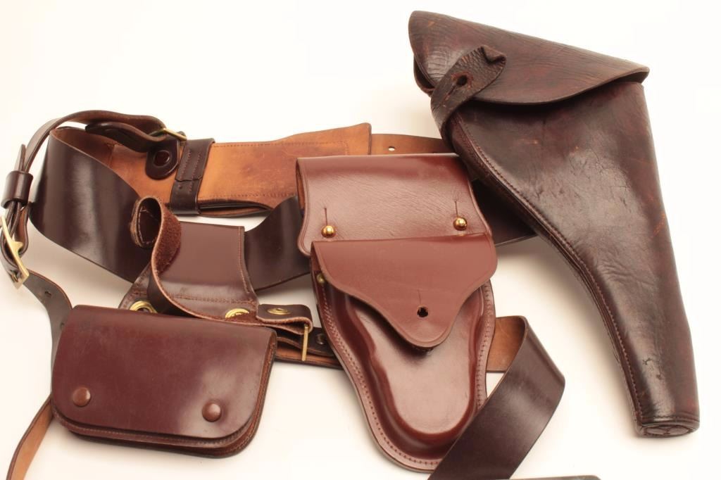 Colt New Service DA revolver, .45 Colt caliber, 5.5” barrel, blued finish, smooth wood grips, lanyard ring, backstrap stamped “RNWMP 1973” AND “MP” on butt strap; S/N 148231, with leather holster, belt, lanyardwoven line and pouch, handcuffs and pouch and shoulder strap. This gun is in overall very good to fine condition displaying the majority of its original blued finish, fine bore, crisp action and markings, very goodgrips. (C&R/No PPT). Est.: $1,250-$2,500.