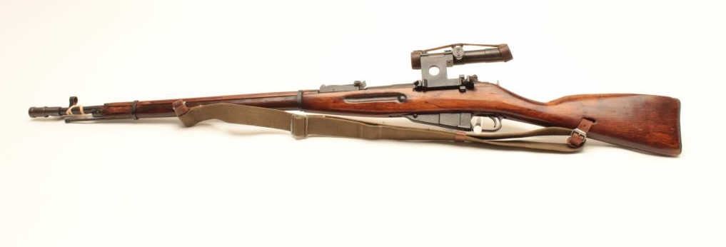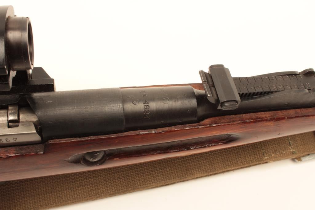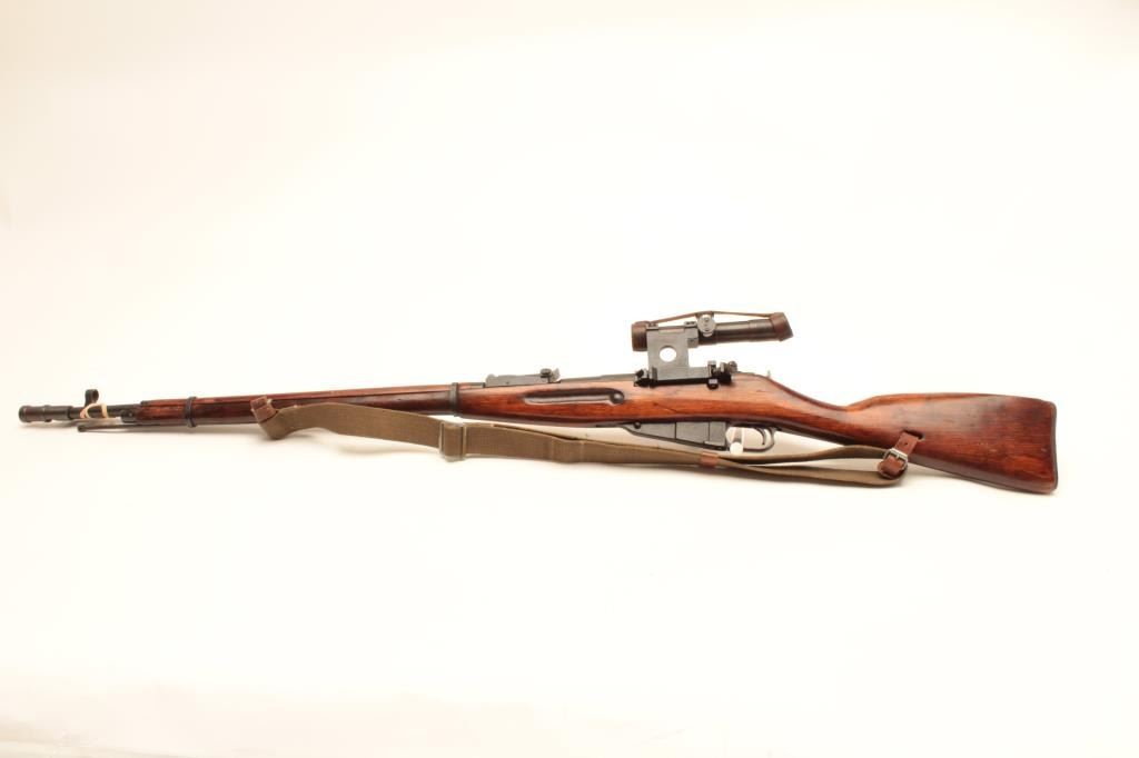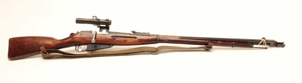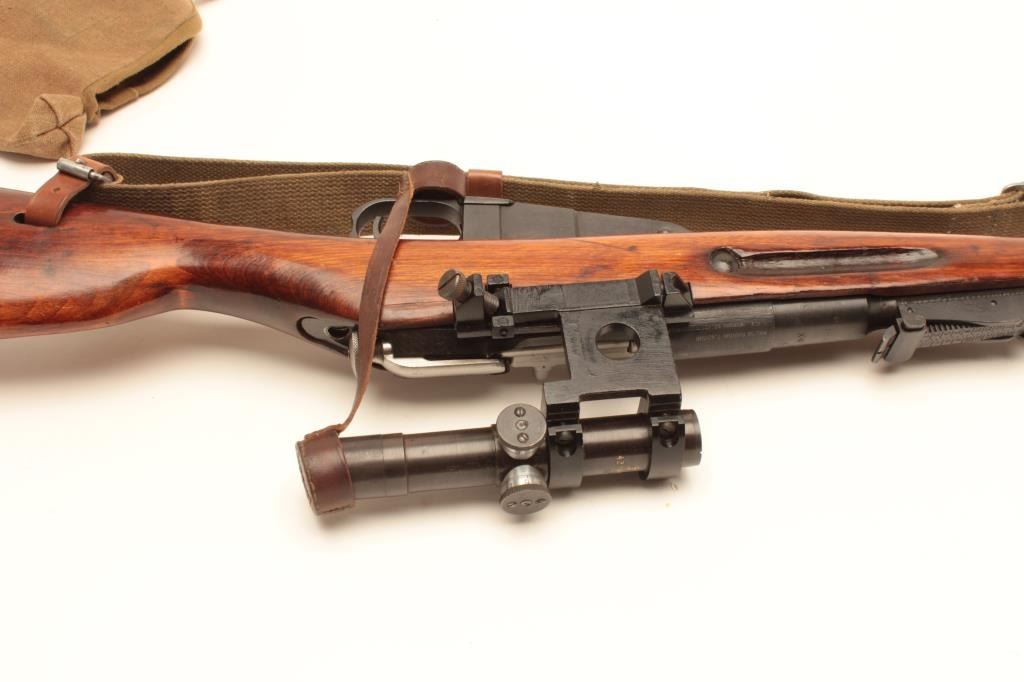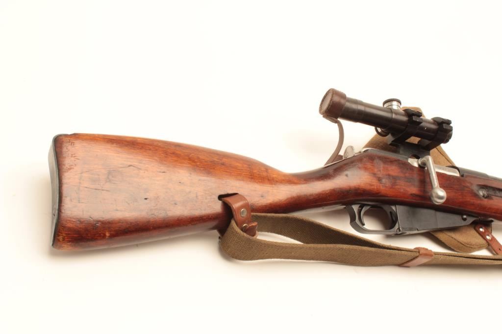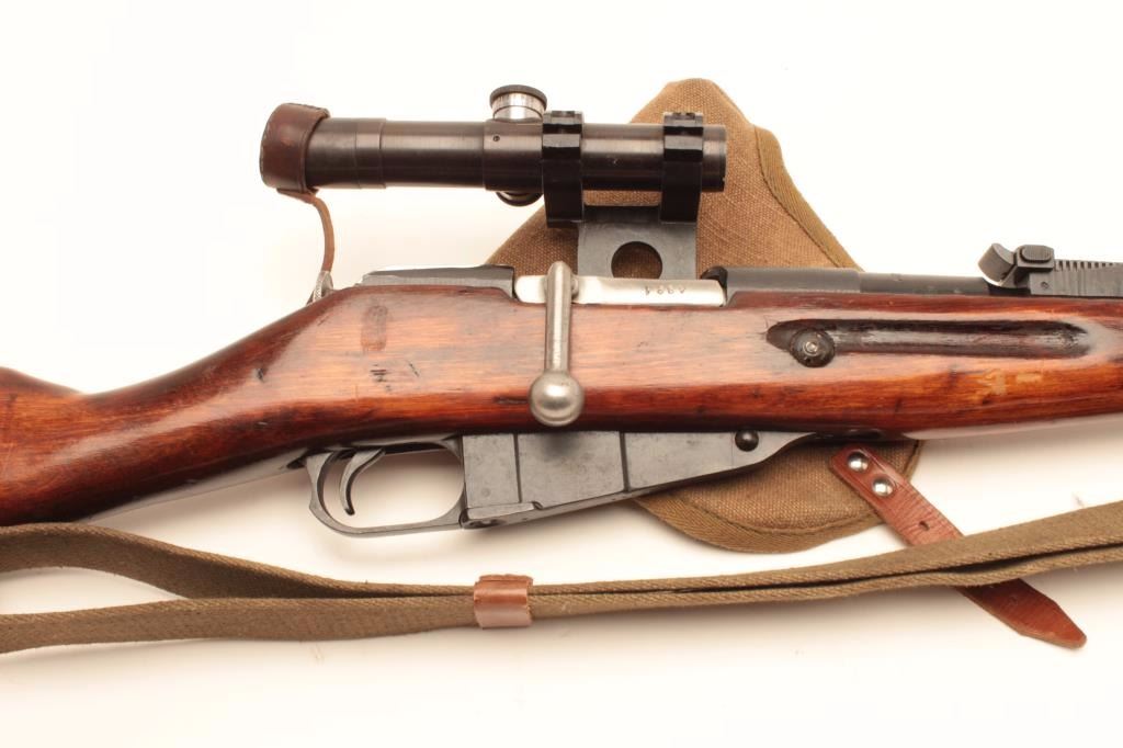 Russian Mosin-Nagant Model 91 bolt action rifle, set up with WW II Sniper scope, tan canvas cover, woven sling and bayonet; 7.62 x 54R caliber, import-marked, 29.5” barrel, military finish, wood stock, S/N 9130065156(also #4921); 1942-dated, in overall good to very good condition with a very good bore, crisp action, good wood; sharp optics in scope and accompanied by an additional sling, double ammo carry pouch, metal oiler bottleand takedown tool. (C&R/No PPT). Est.: $900-$1,800.