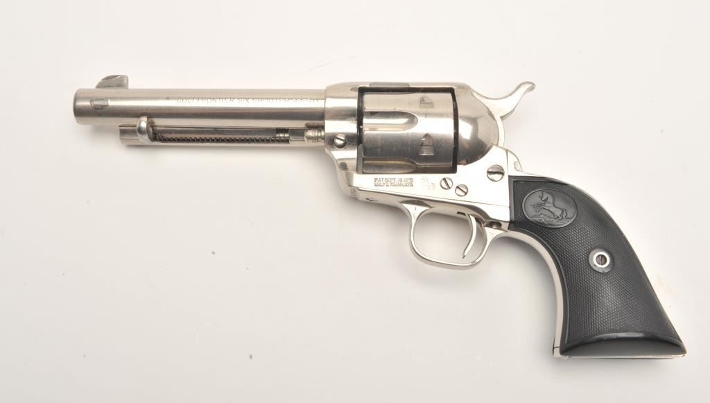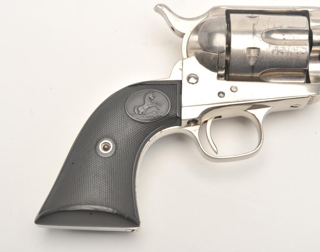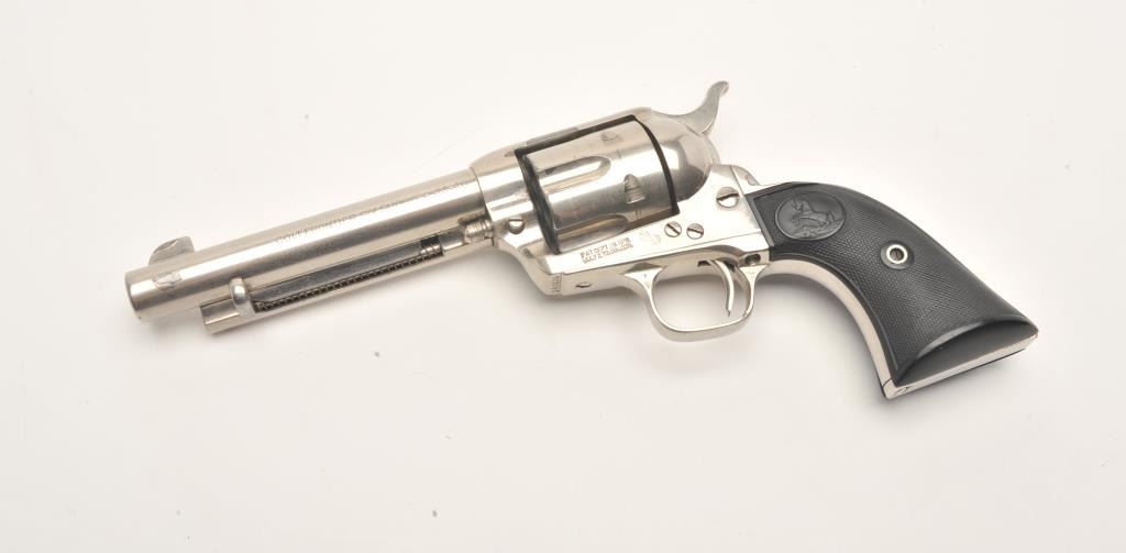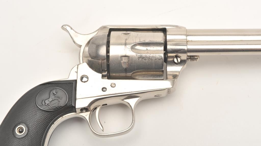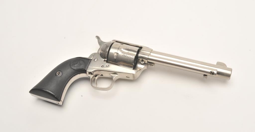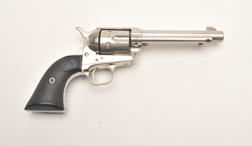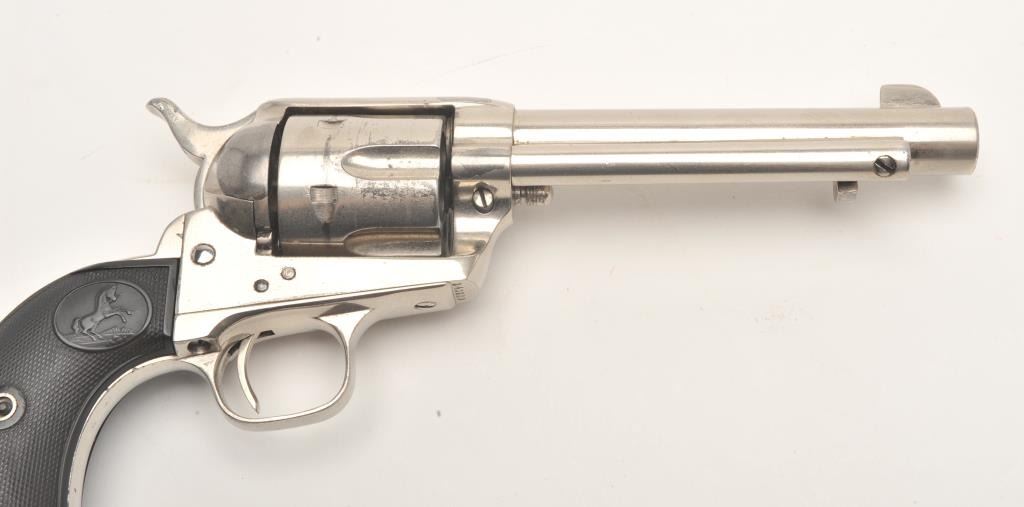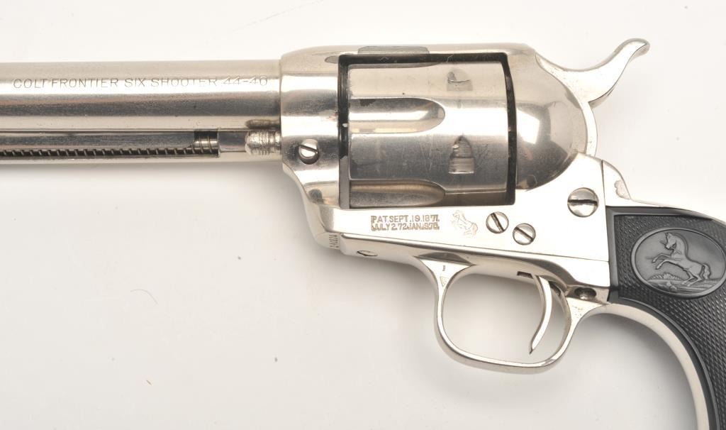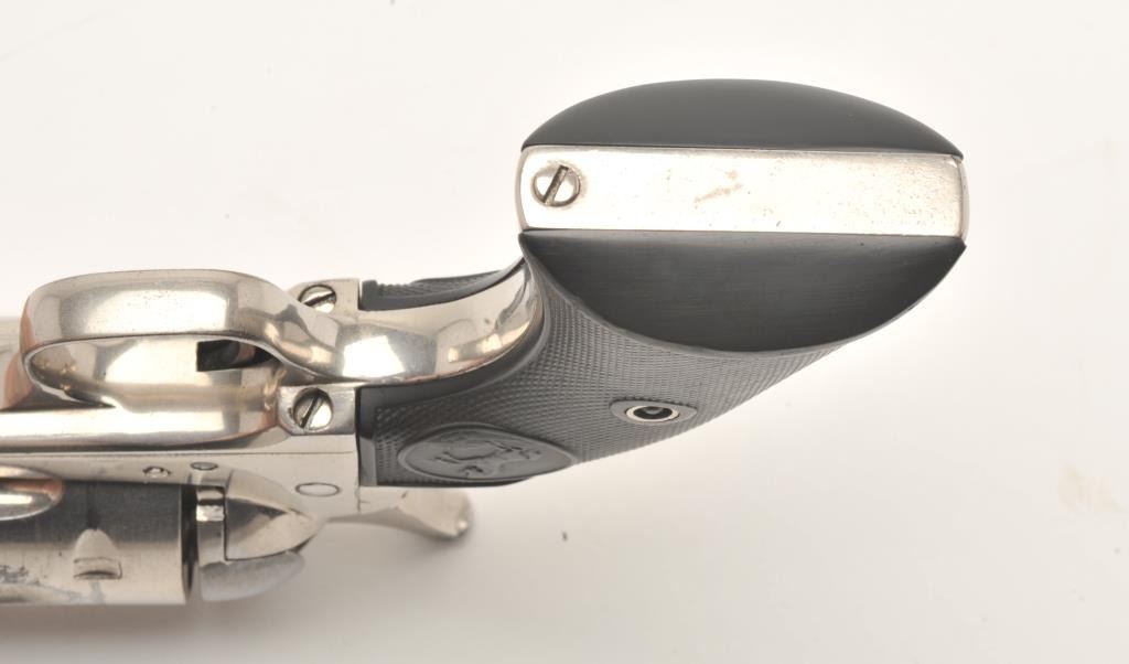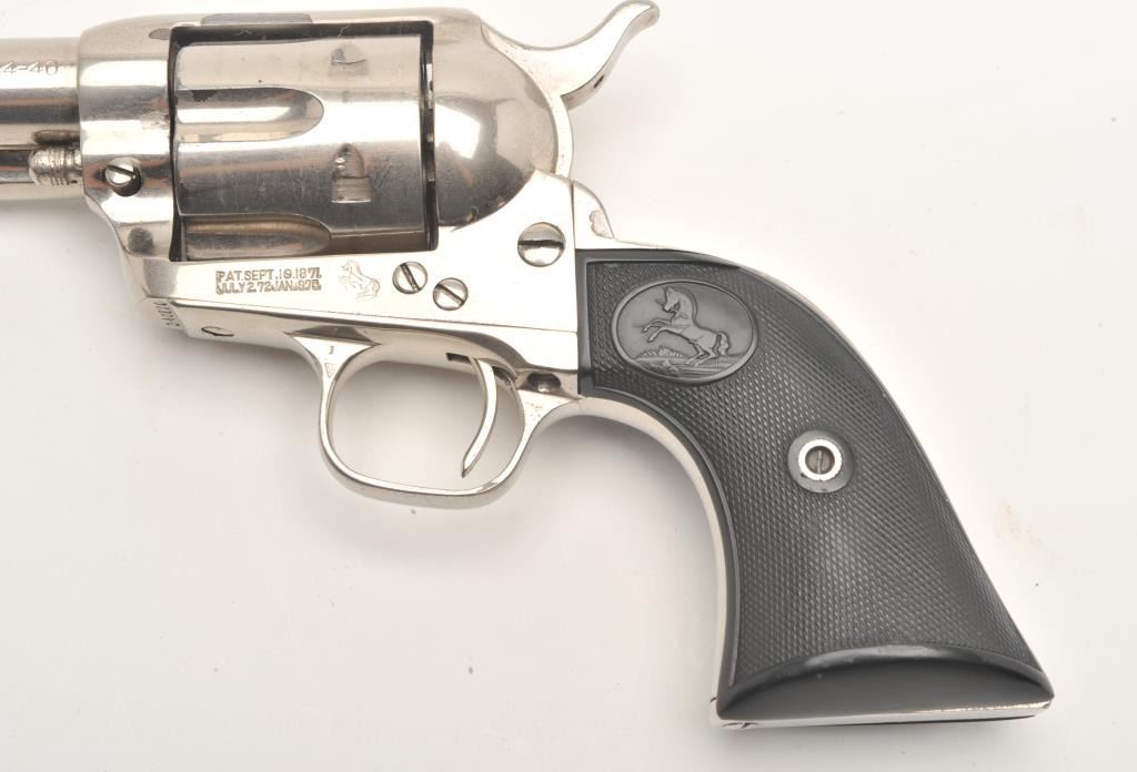 Lot 905 Colt SAA revolver, .44-40 caliber, 5.5” barrel, re-finished nickel, checkered black hard rubber gr
