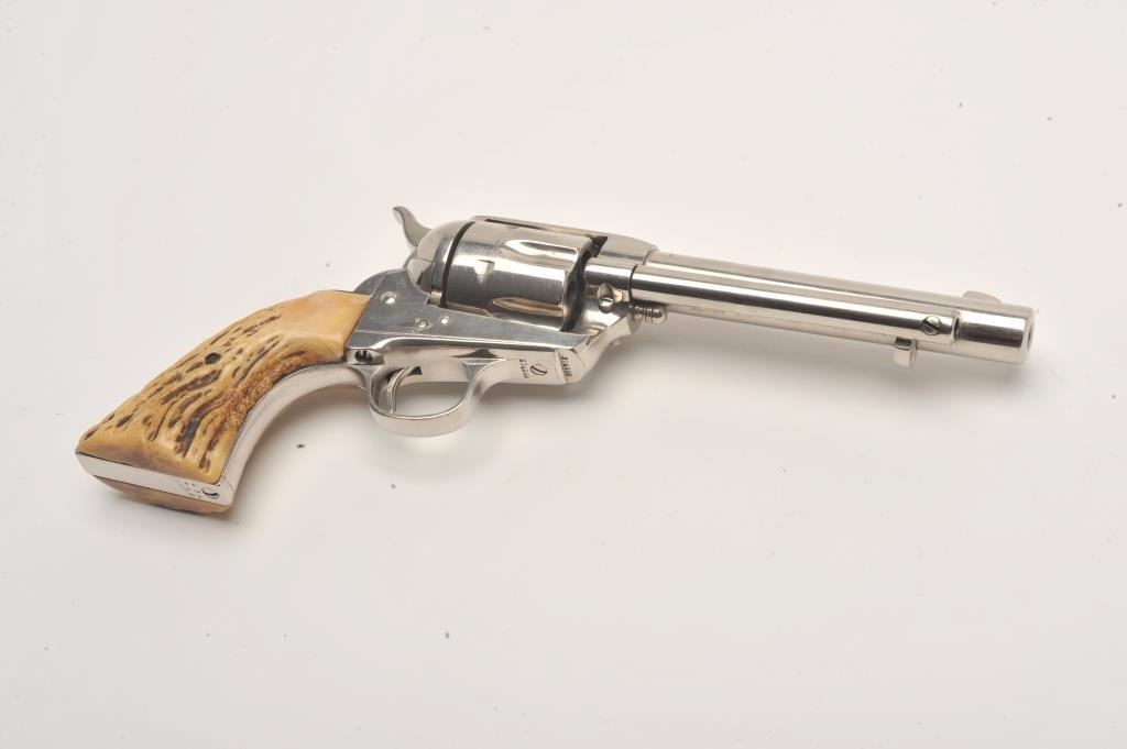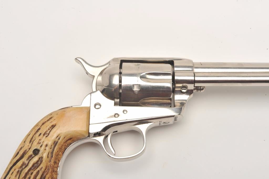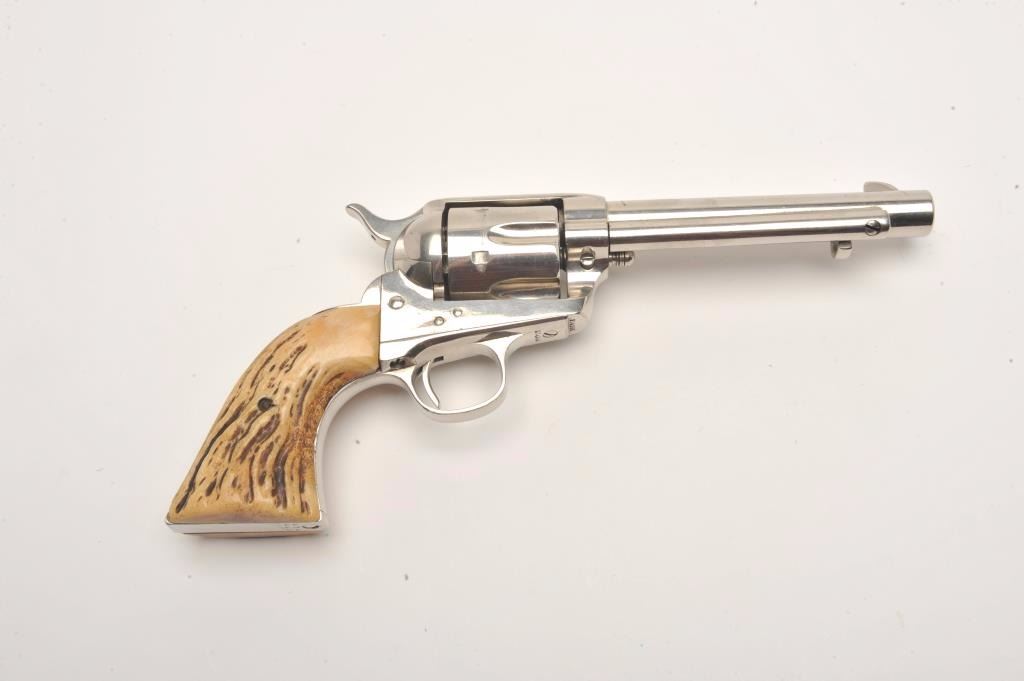 Colt SAA revolver, .32 W.C.F. caliber, 5.5” barrel, old re-nickel finish, stag grips, S/N 274289, in overall good to very good condition showing the majority of its old re-finish, fair to good bore, crisp action,sharp markings, very good grips; accompanied by a Colt factory letter confirming caliber and barrel length, stocks “Not Listed”, originally blued finish, shipped to Simmons Hardware Co., St. Louis, MO. on Jan. 20,1906, fifteen guns in shipment. (C&R/No PPT). Est.: $1,400-$2,800.