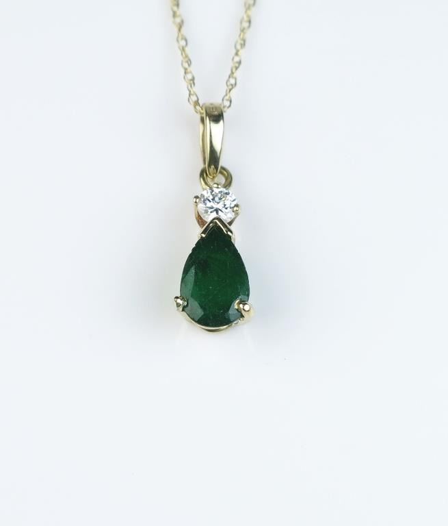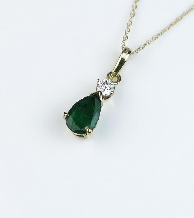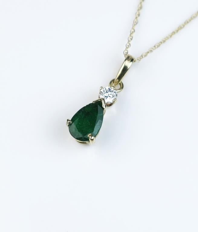 Elegant ladies pendant set with a fine green Colombian emerald weighing approx. 1.00 carat and a side diamond in a 14 karat yellow gold setting. Estimates $1,200-$1,800 Nice