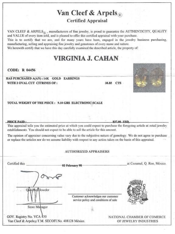 Amazing ‘VANCLEEF and ARPEL’ earrings featuring two matching oval cut Citrines weighing 38.85 carats set in fine 14 karat yellow gold clip back design. Original purchase receipt from VANCLEEF and ARPEL in1998. Estimates $1,500-$2,000