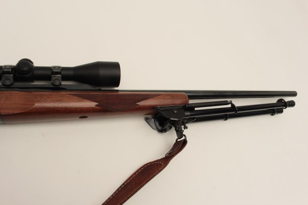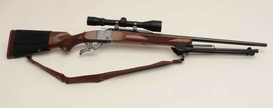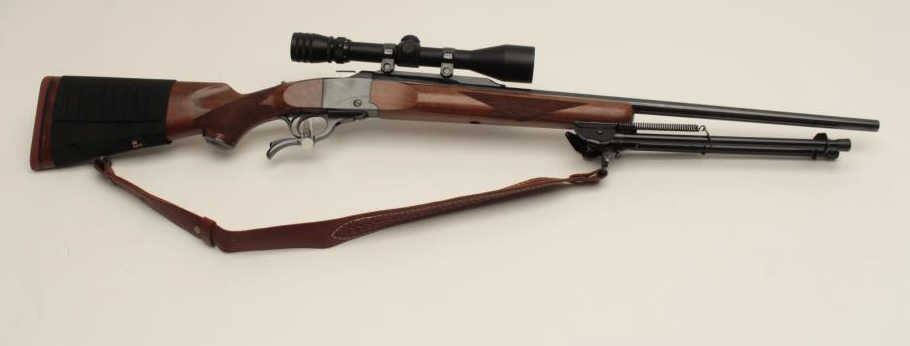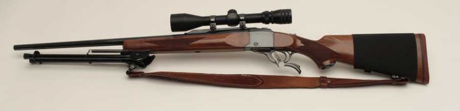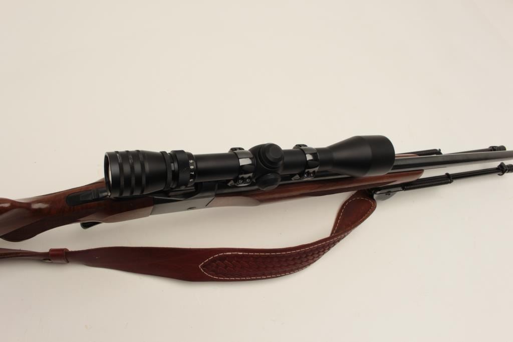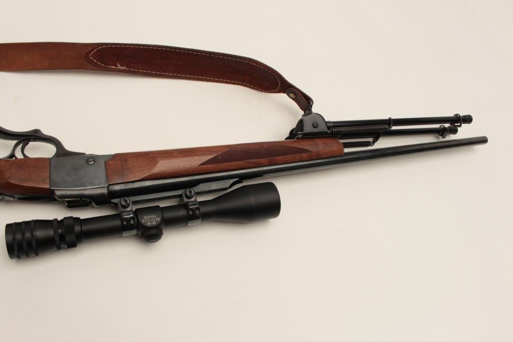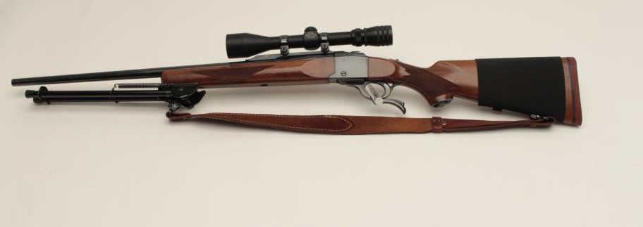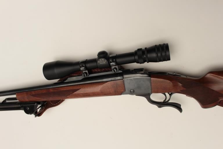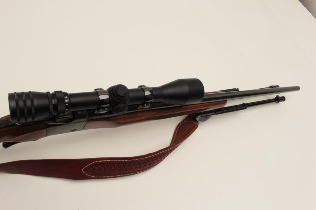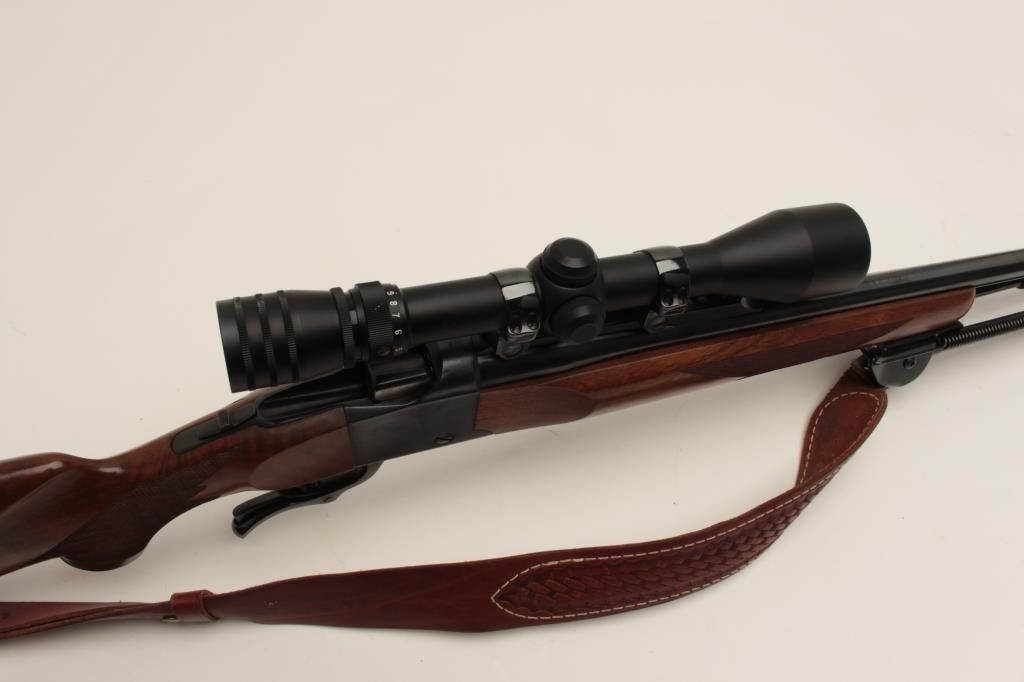 Ruger No. 1 single shot rifle, .22-250 caliber, 26” barrel, blued finish, checkered wood stocks, leather sling, attached bipod, S/N 132-13648, in overall fine condition with fine bore, action, markings and wood;mounted with a Redfield Tracker scope displaying crisp optics. (Modern/No PPT). Est.: $500-$1,000.