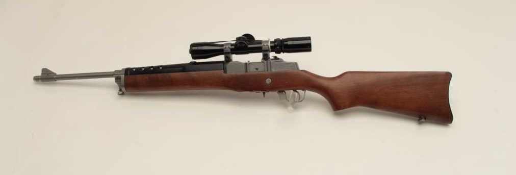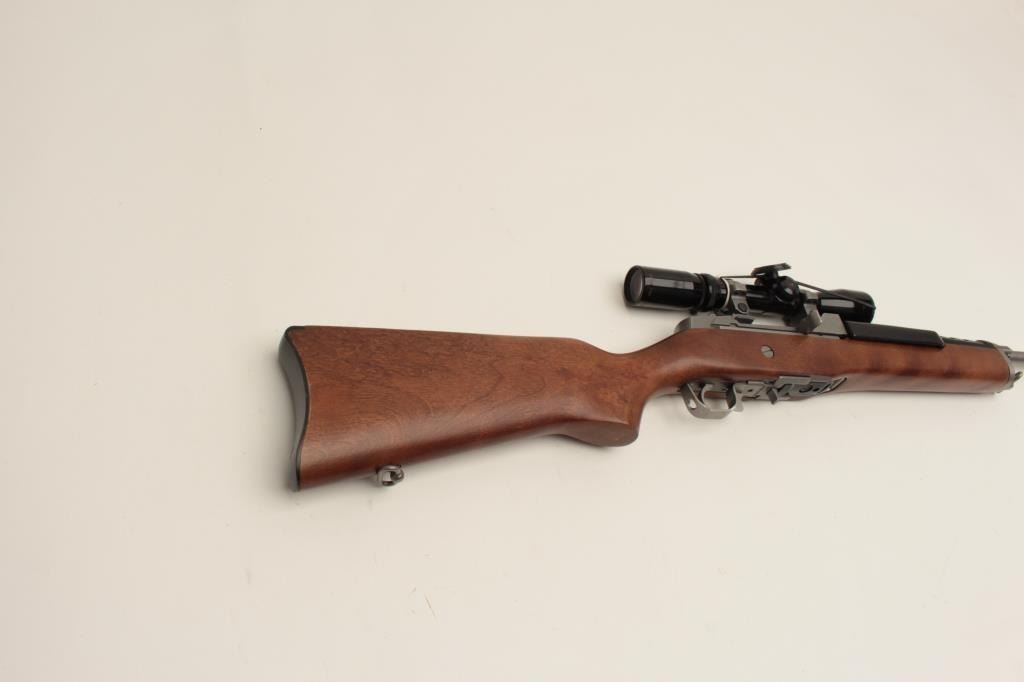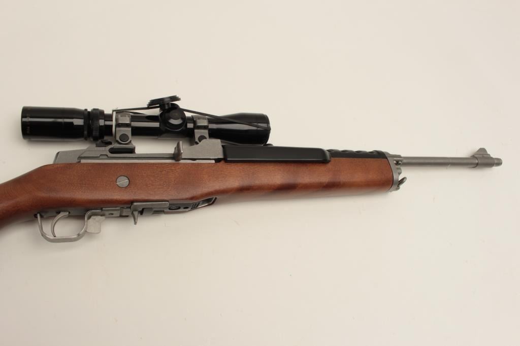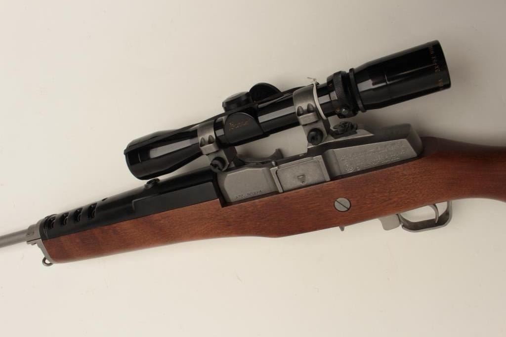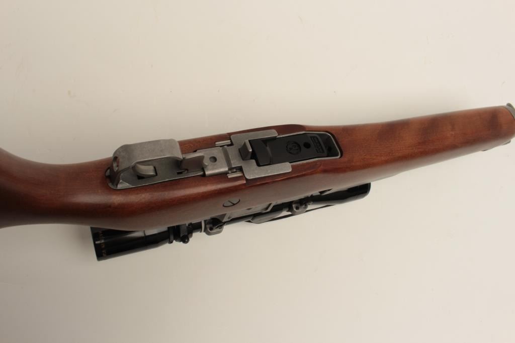 Ruger Ranch Model semi-automatic rifle, .223 caliber, 18.5” barrel, stainless, wood stock, S/N 195-09724, mounted with a Burris 3X-9X scope with crisp optics, in overall fine condition with fine action, markings, woodand near fine bore. (Modern/No PPT). Est.: $600-$1,200.