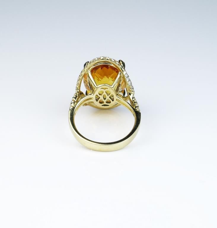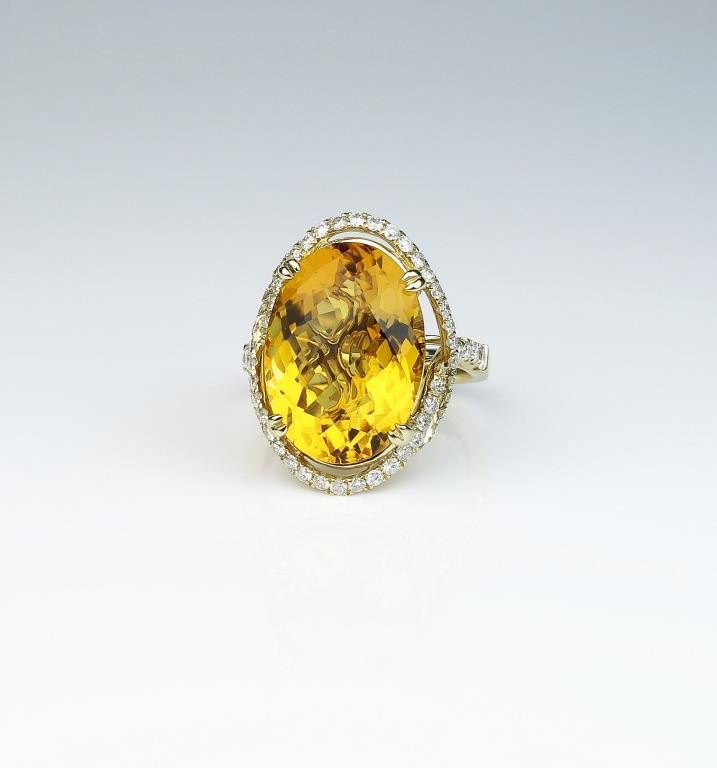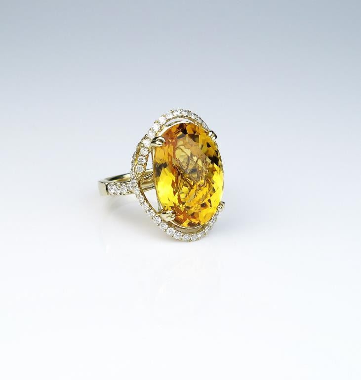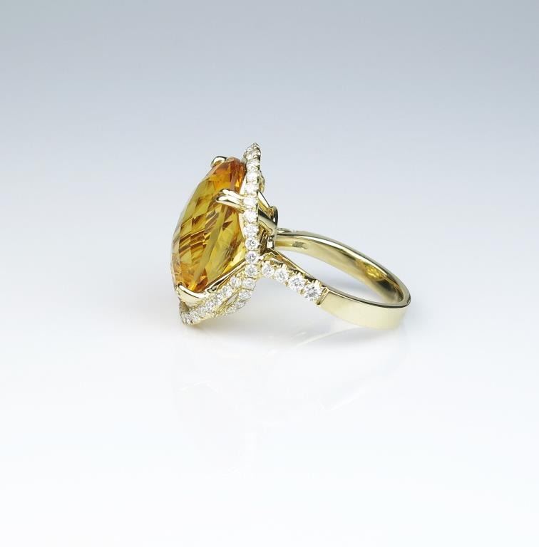 Spectacular ring featuring a checkerboard cut Citrine weighing approx. 20.00 carats and micro set with over 56 round diamonds weighing approx. 1.00 carat of G-H colors and VS/SI clarity set in a 14 karat yellow golddesigner setting. Retail $4,000-$6,000 Estimates $2,000-$3,000 Labor intensive