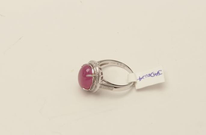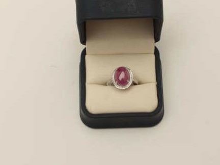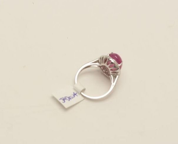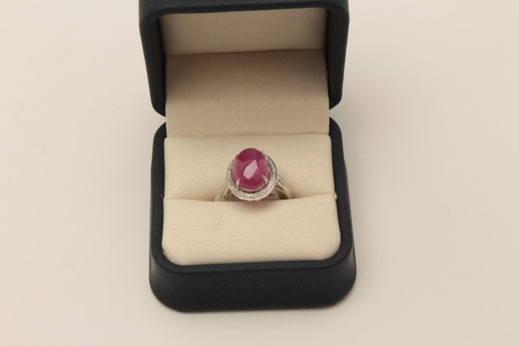 Lot 944 One 18k white halo gold ladies ring set with a Burmese ruby cabochon weighing approx 6 ct EST.$1,