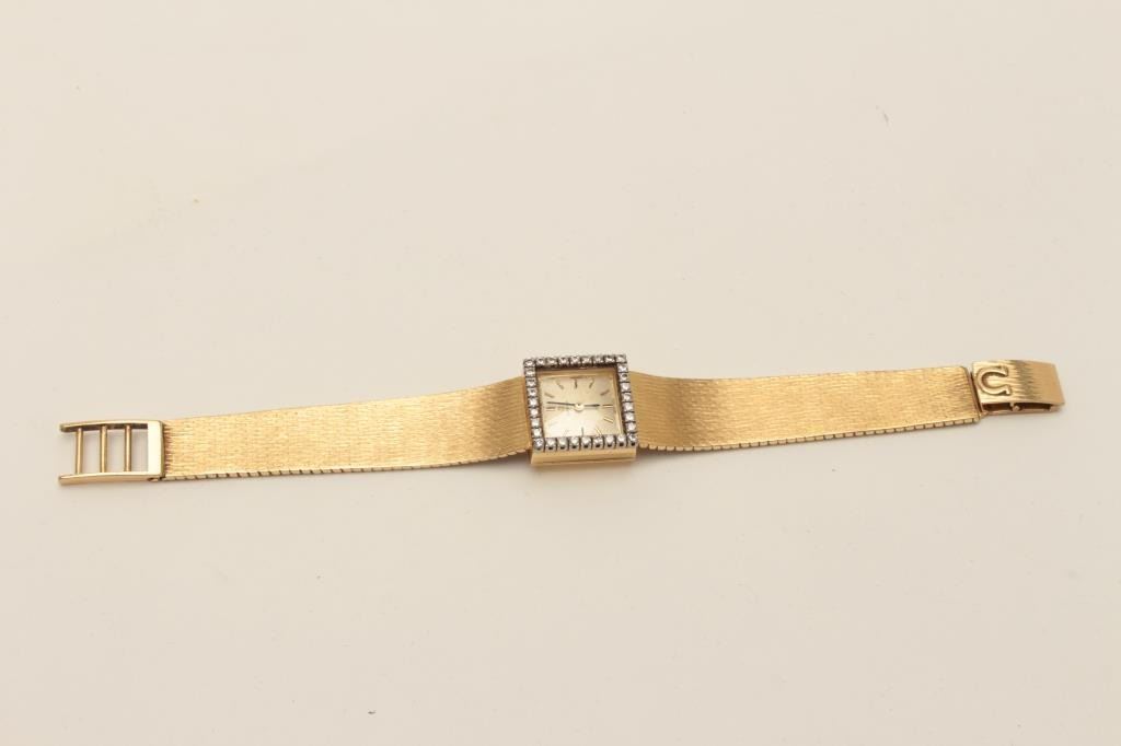 One vintage ladies omega wrist watch in 18k yellow gold and diamond bezel. (weight 43 gms). EST.$3,000-3,500