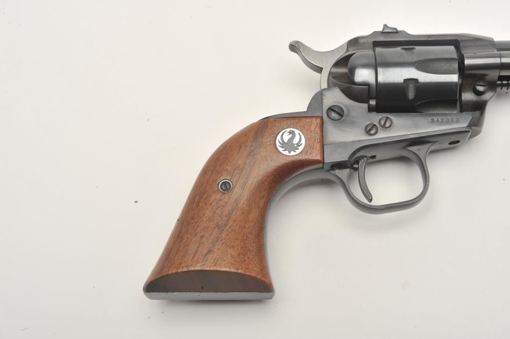 Ruger Single Six Model revolver, .22 caliber, with companion extra cylinder, 6.5” barrel, blued finish, wood medallion grips, S/N 342080, in overall very good to near fine condition displaying the majority of itsoriginal finish with some muzzle wear, crisp action, sharp markings, very good bore and near fine grips with one small chip at bottom of left grip. (Modern/No PPT). Est.: $250-$500.