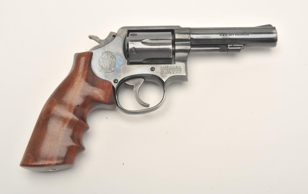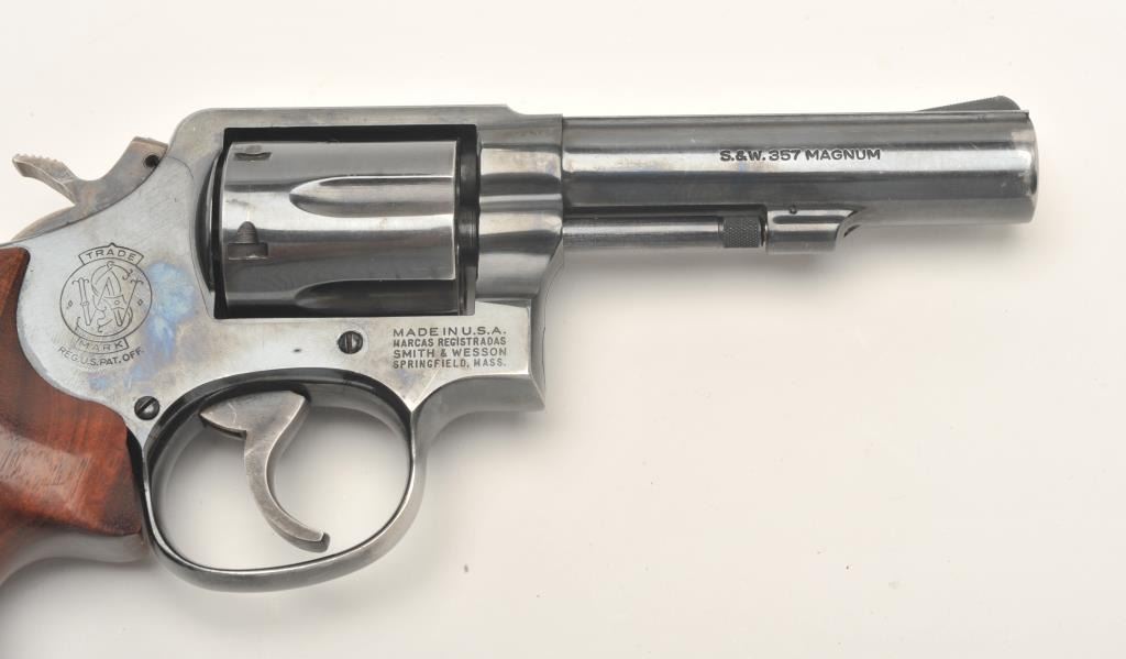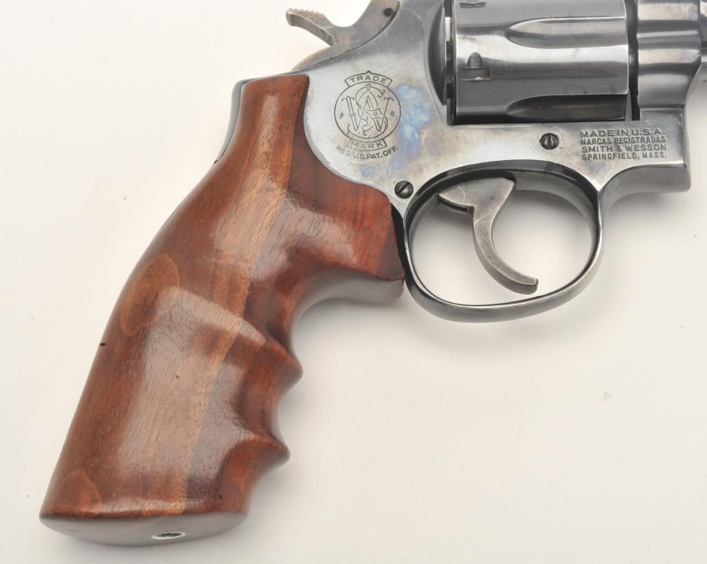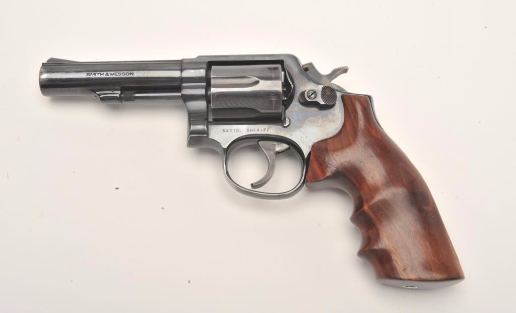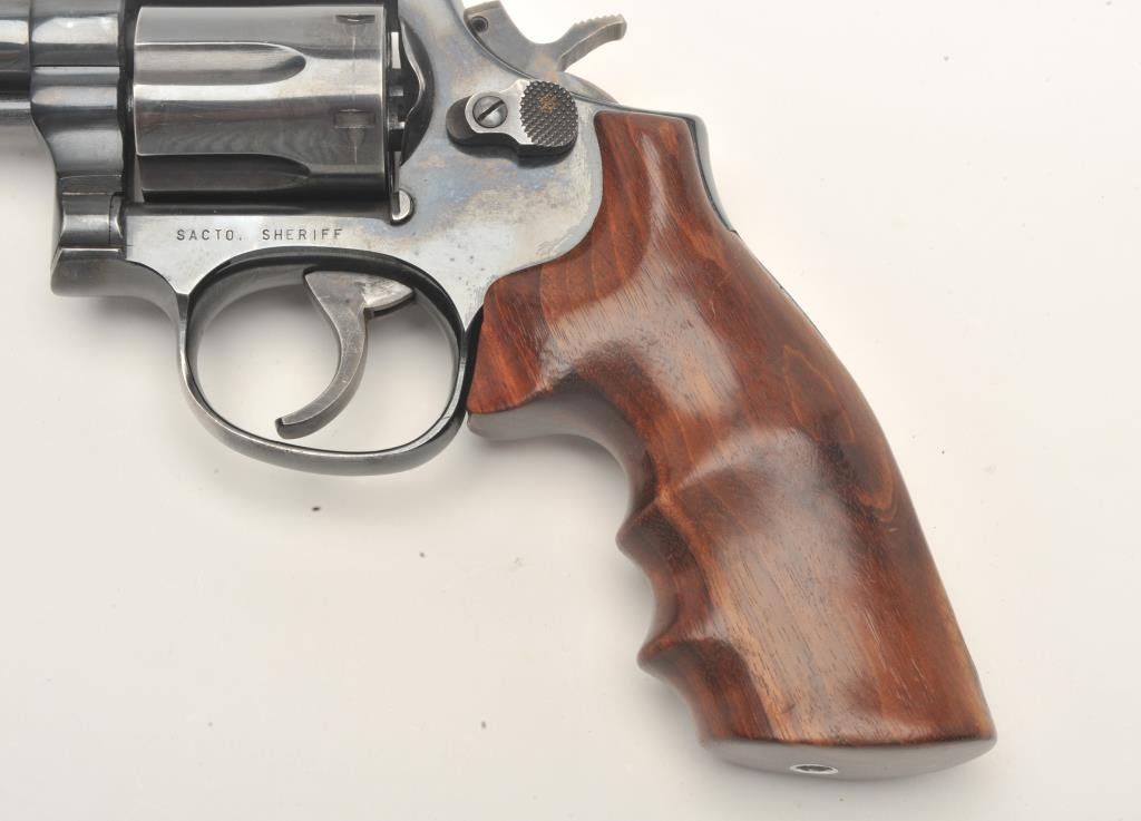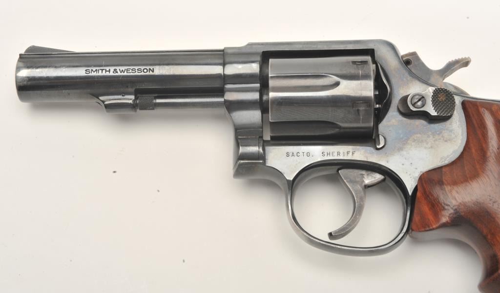 Smith & Wesson Model 13-3 DA revolver, .357 Magnum caliber, 4” heavy barrel, blued finish, custom finger groove wood grips, left side of frame stamped “SACTO. SHERIFF”, S/N 9D68066, in very good to fine conditiondisplaying the majority of its original finish, fine bore, crisp action, sharp markings and fine grips. (Modern/No PPT/NO CALIF. SALE). Est.: $500-$1,000.