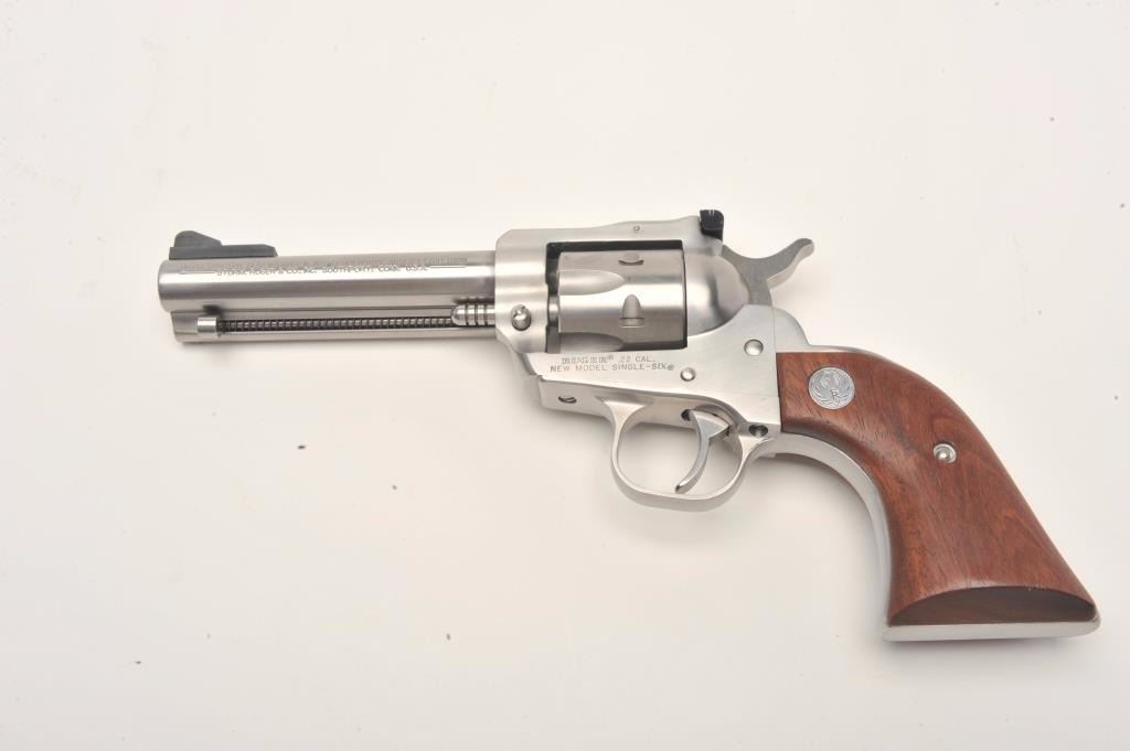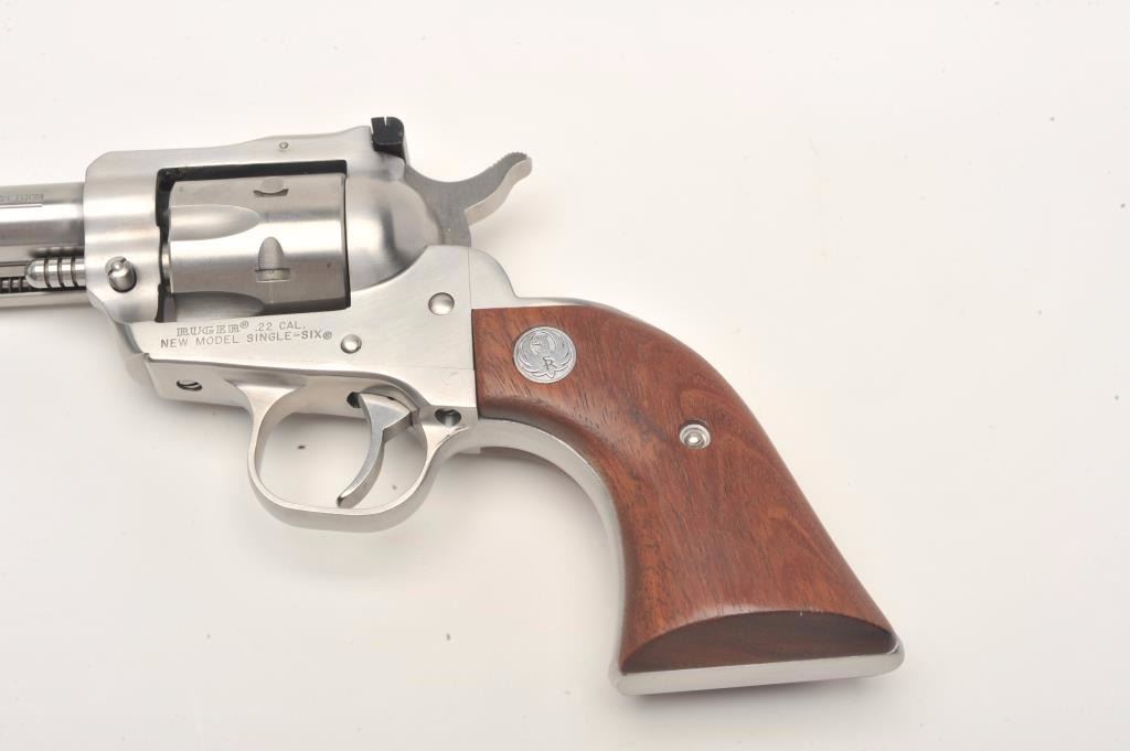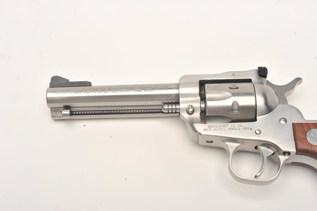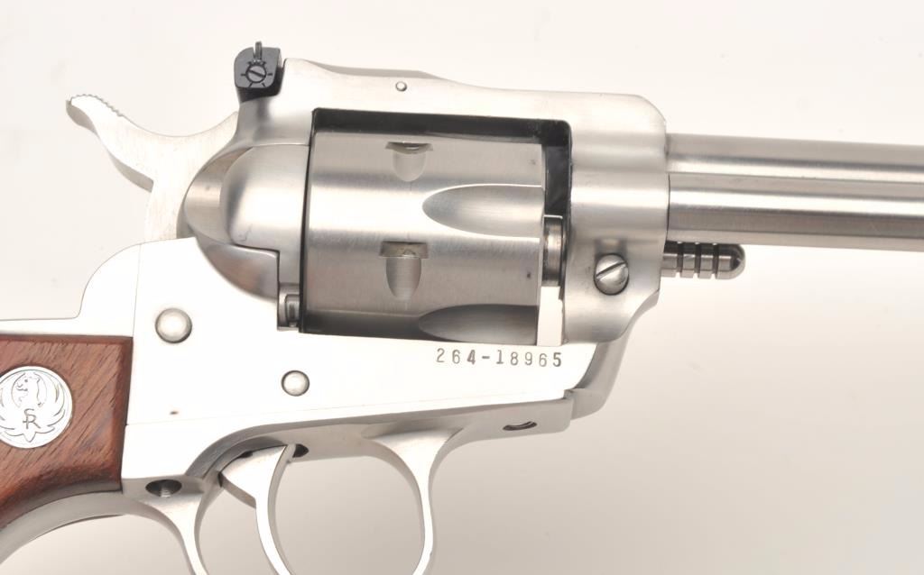 Ruger New Model Single Six revolver, .22 caliber with extra .22 Win. Magnum cylinder, 4.5” barrel, stainless, wood medallion grips, S/N 264-18965, with factory hardcase and instructions,; like new showing little if any use. (Modern/No PPT). Est.: $250-$550.